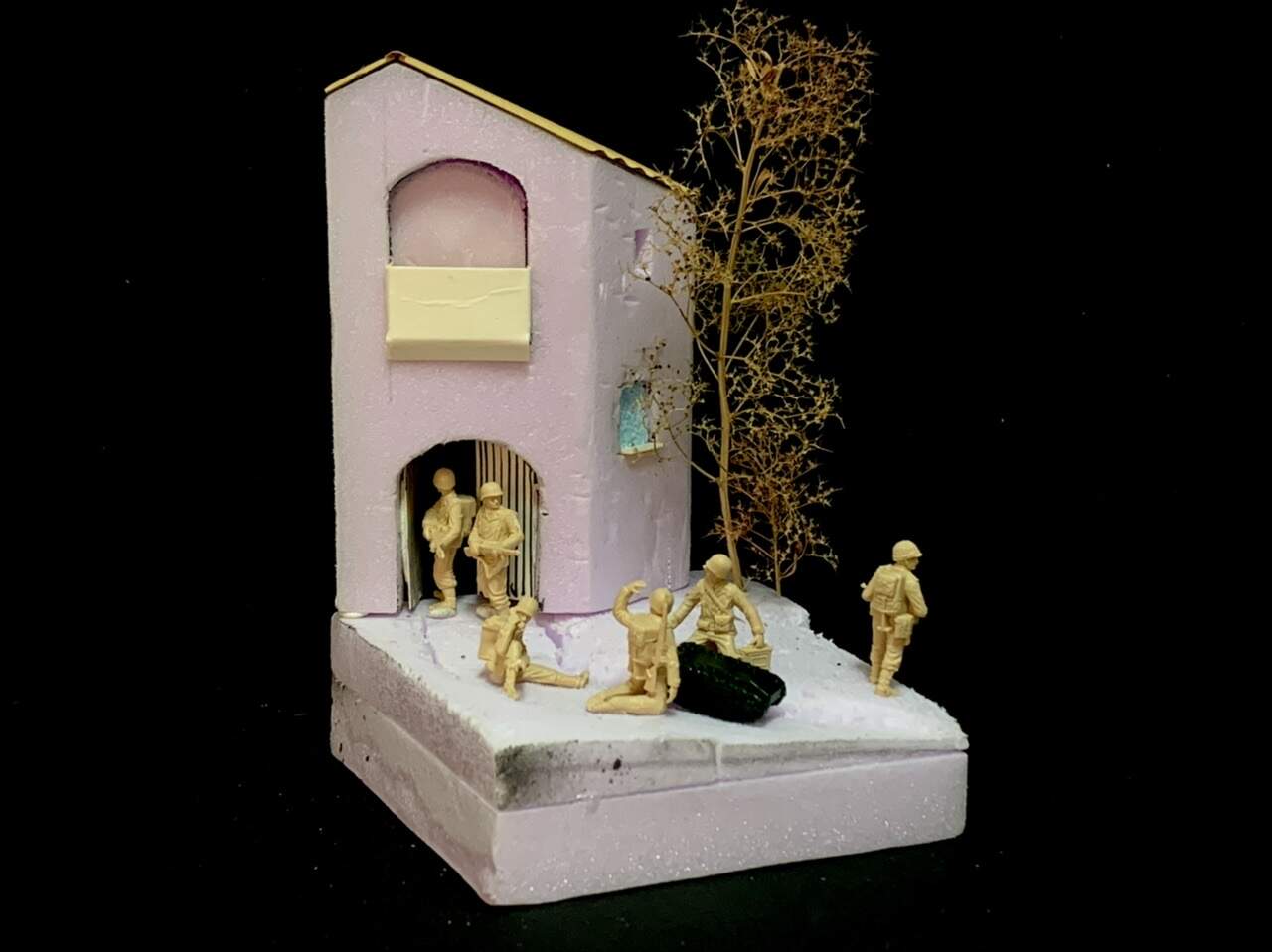 I did a small test piece, 8 x 8 cm, that I will use for testing to paint the groundwork with my airbrush. I could not refuse to make a house as well. The house in not ready.