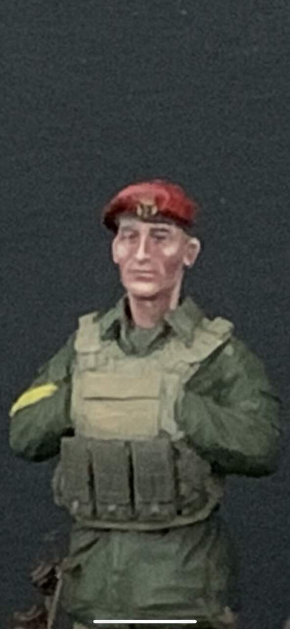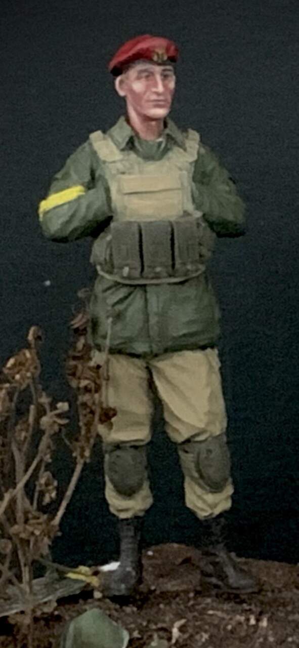 First layer of base paint. He will have green jacket and camouflage pattern on the trousers. Cheers