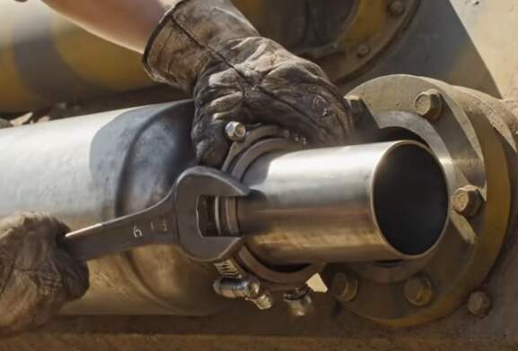 Some more wild wrenching using a spanner to wrench on a hose/pipe clamp by clanging the spanner on the pipe.
