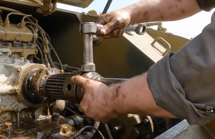 Gloveless mechanic installs gun sideways across the open engine hatch in the glacis.