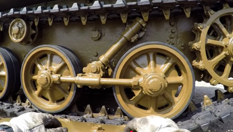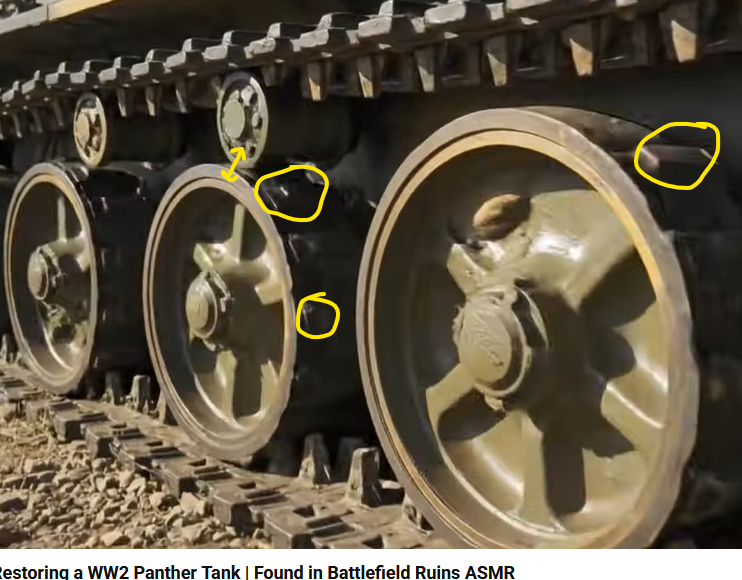 The knobbly road wheels are spinning but the track and ground does not move in relation to the wheels, the track and the ground are obviously stationary but the spinning wheels should be moving forward. What on earth are those knobs on the road wheel rubber supposed to be?