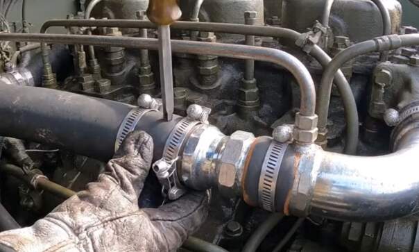 Well, well, well, I’ll be screwed if I have ever seen a hose clamp being tightened by jamming a screw driver into the hose. I’m not a vehicle or engine mechanic but ..
