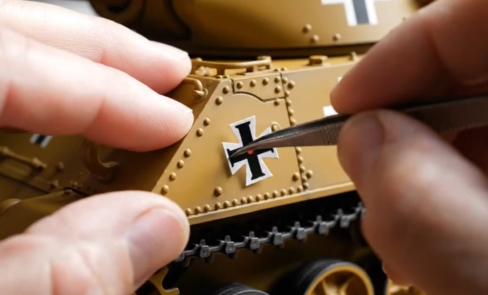 Gloveless mechanic with extremely big hands uses tweezers to install a paper balkenkreuz decal.