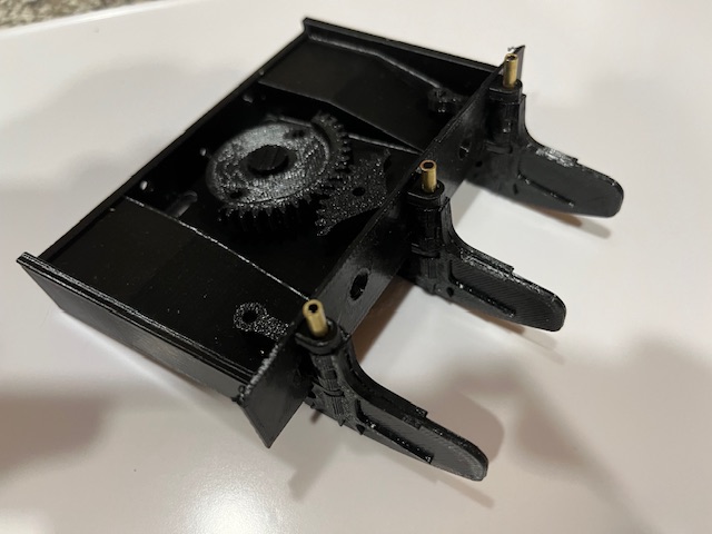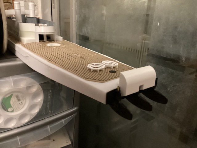 The stern completed with the heads (toilets) installed over the stern. Fire steps for Oerlikons printed to try and work out where I should put them. Photos don’t show all positions so some guessing may have to happen. I know she had 8, I can see on photos where the forward pair were with a hint of 4 more on the battery deck and probably 2 right aft.