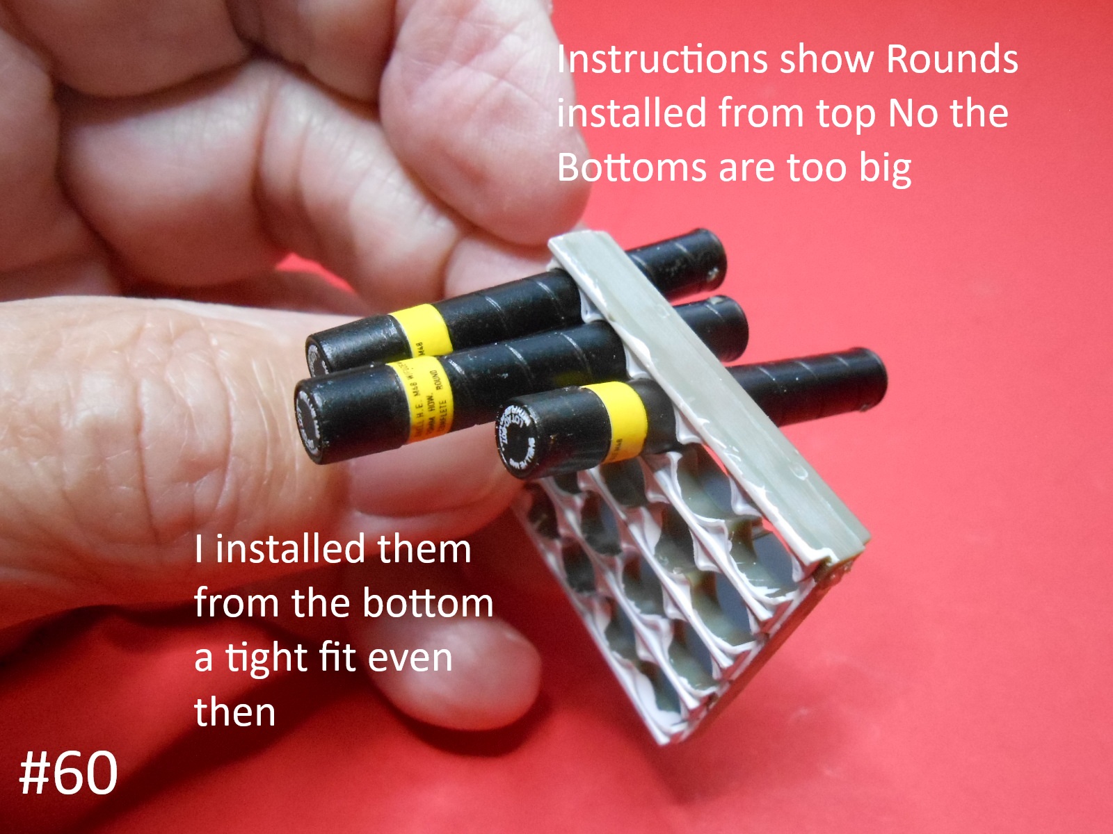 The instructions have you install the rounds from the top, This can’t be done as the bottom of the rounds are larger than the Casings, even they are a tight fit.