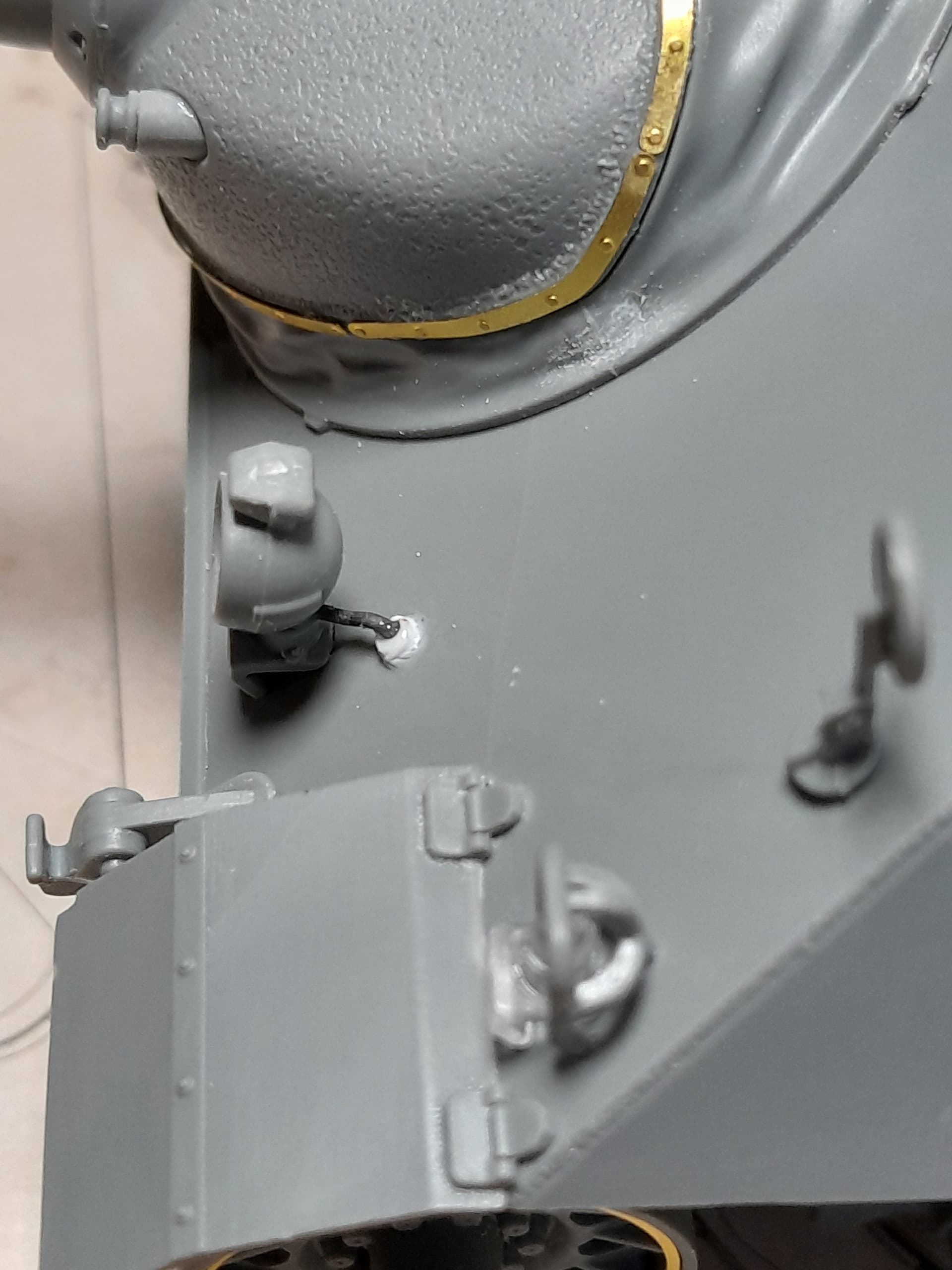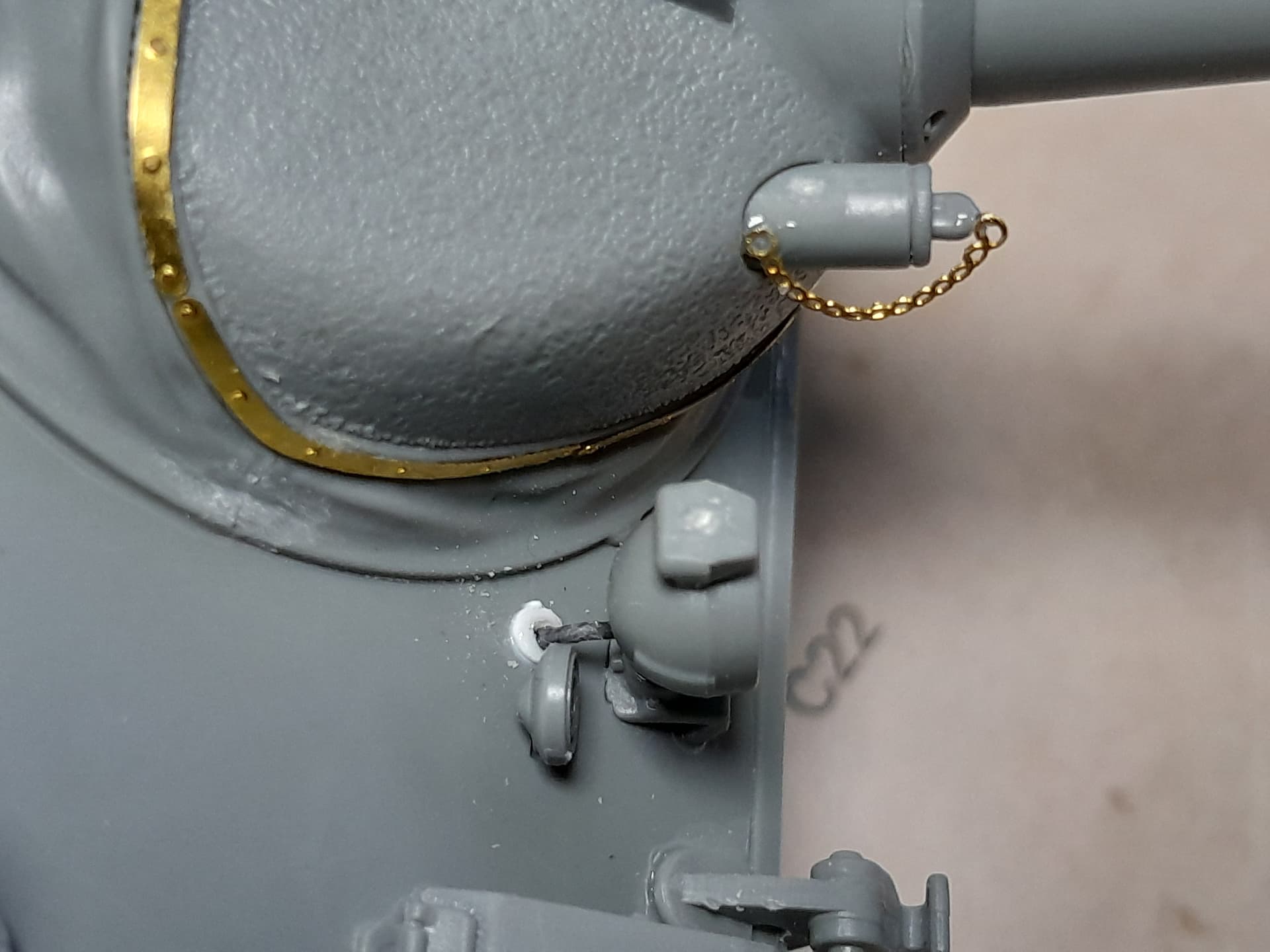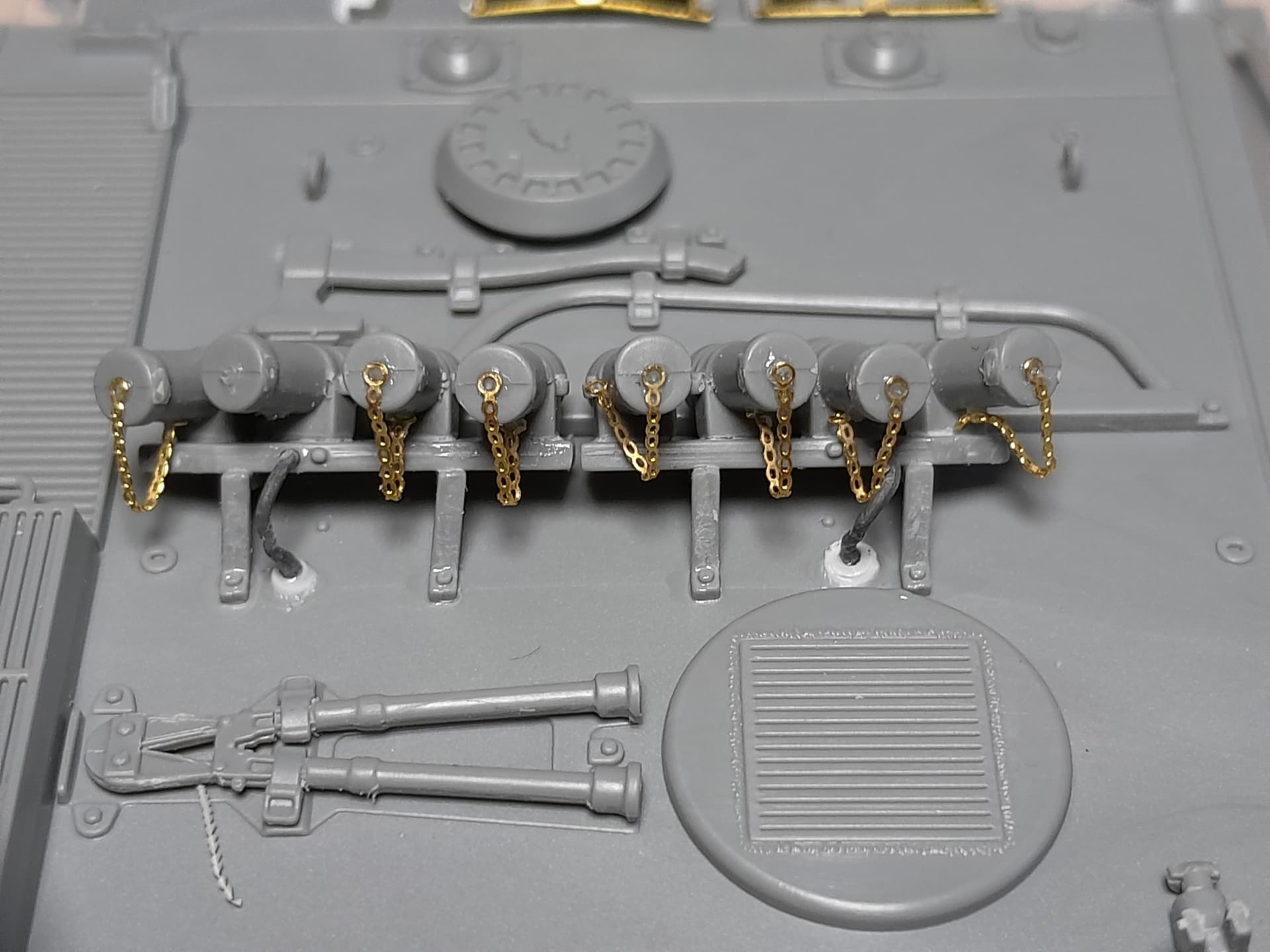 Today I made some small wiring attachment for the headlights and the rear smoke mortar racks. I also attached a small etched chain at the plug for the gun vision as I saw at the above mentioned walkaround video.