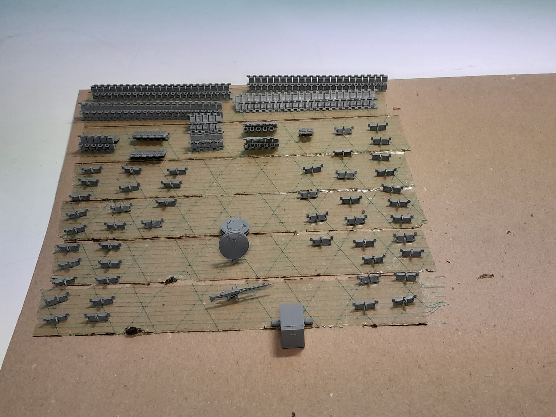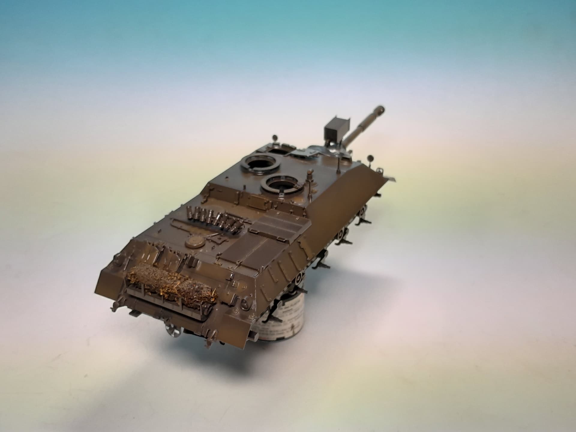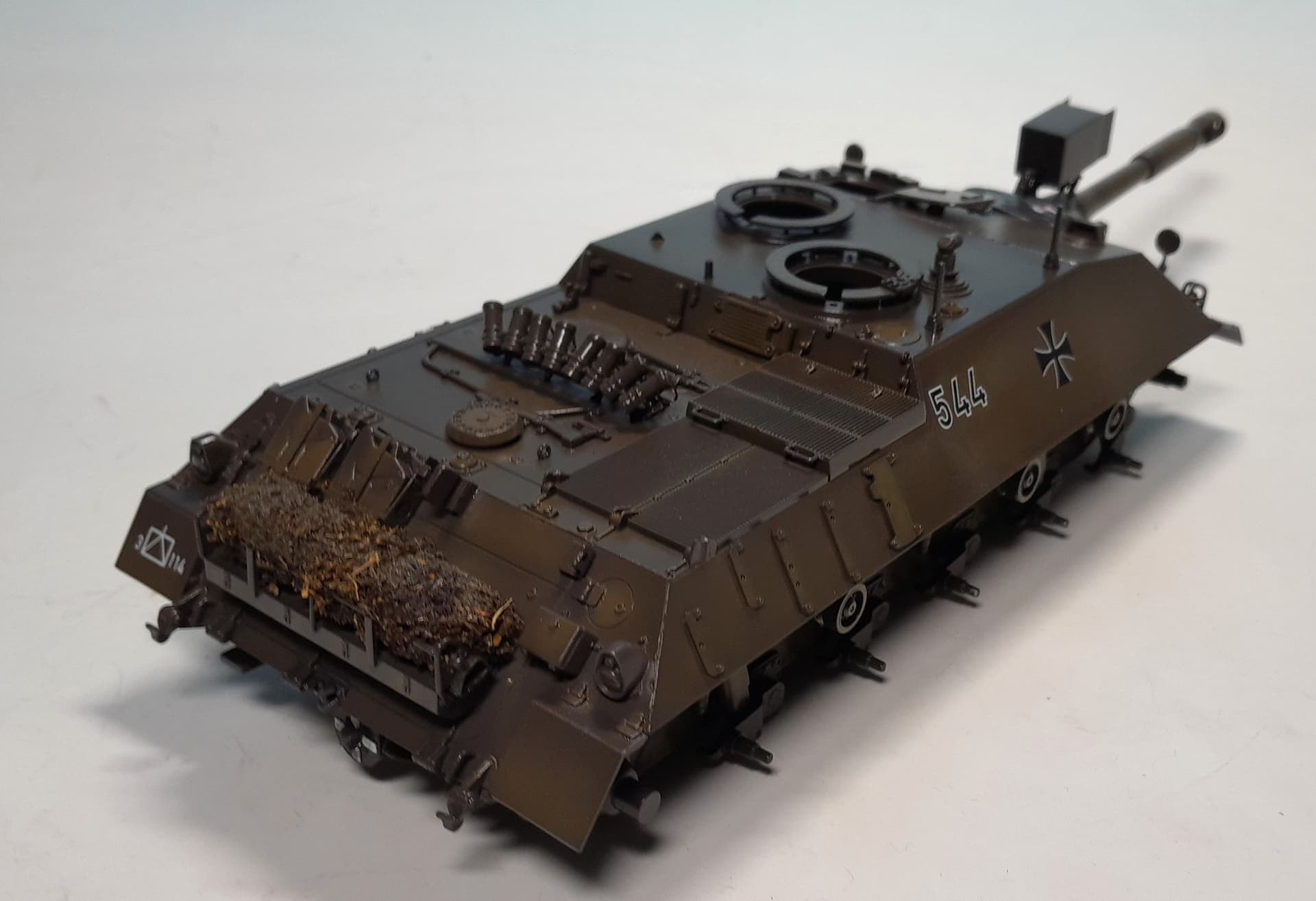 As these tank usually carried a camouflage net I decided to provide this vehicle with a stowed camo net, too. I therefore stole a piece of gauze bandage, soaked it in white glue and dryed tea leaves from a tea bag and rolled everything and squeezed it in place. I think it looks good when painted properly later ![]()