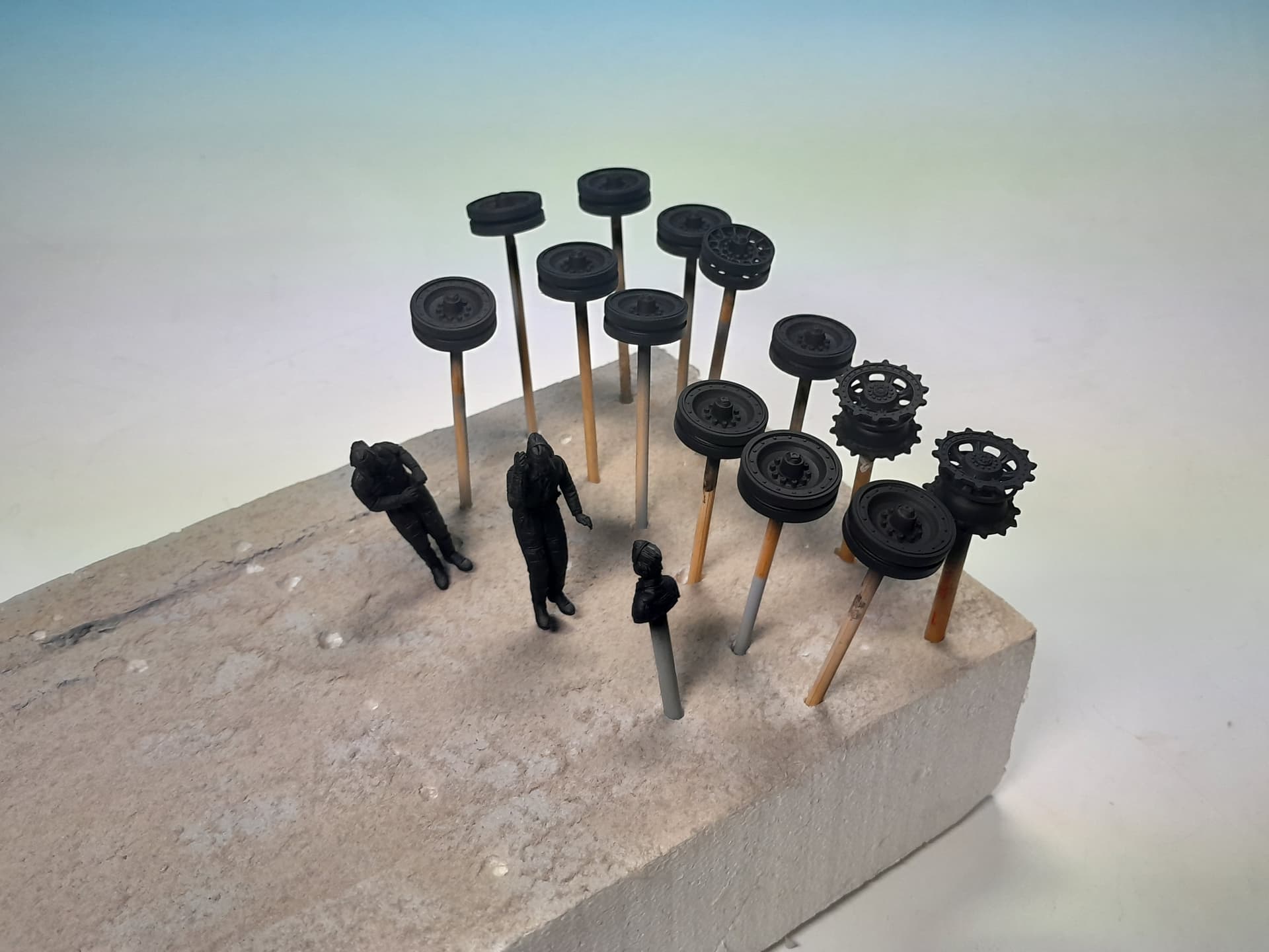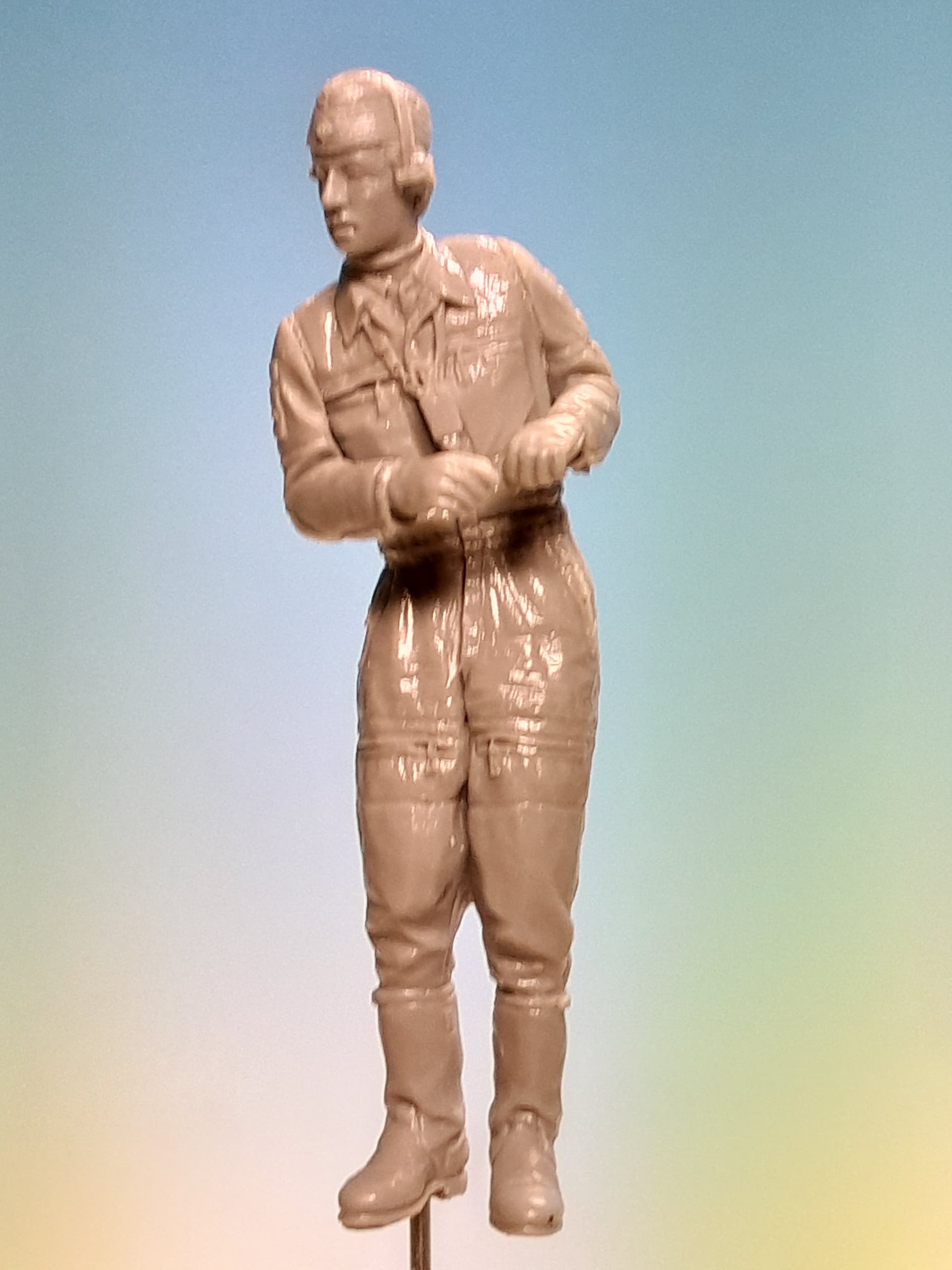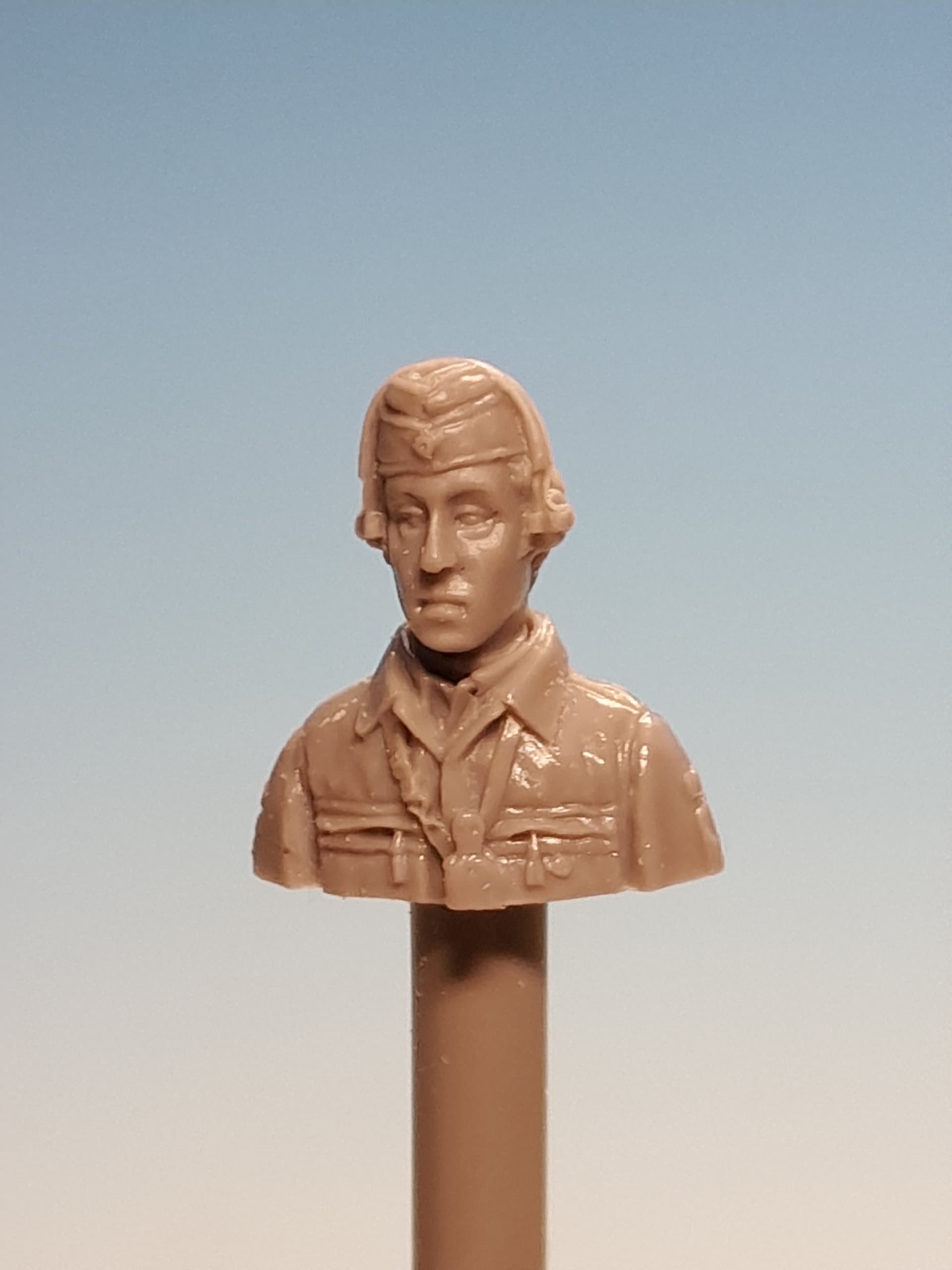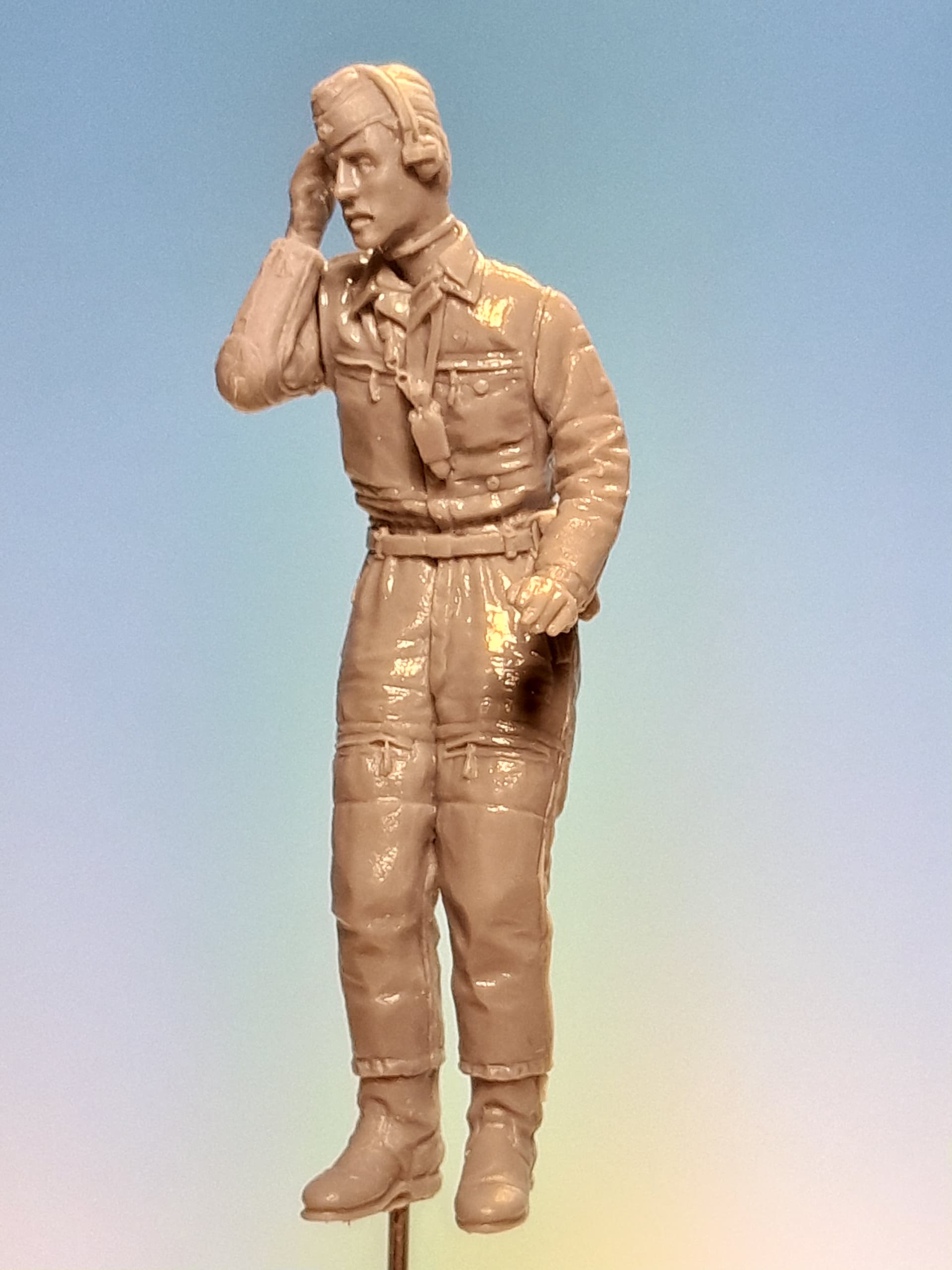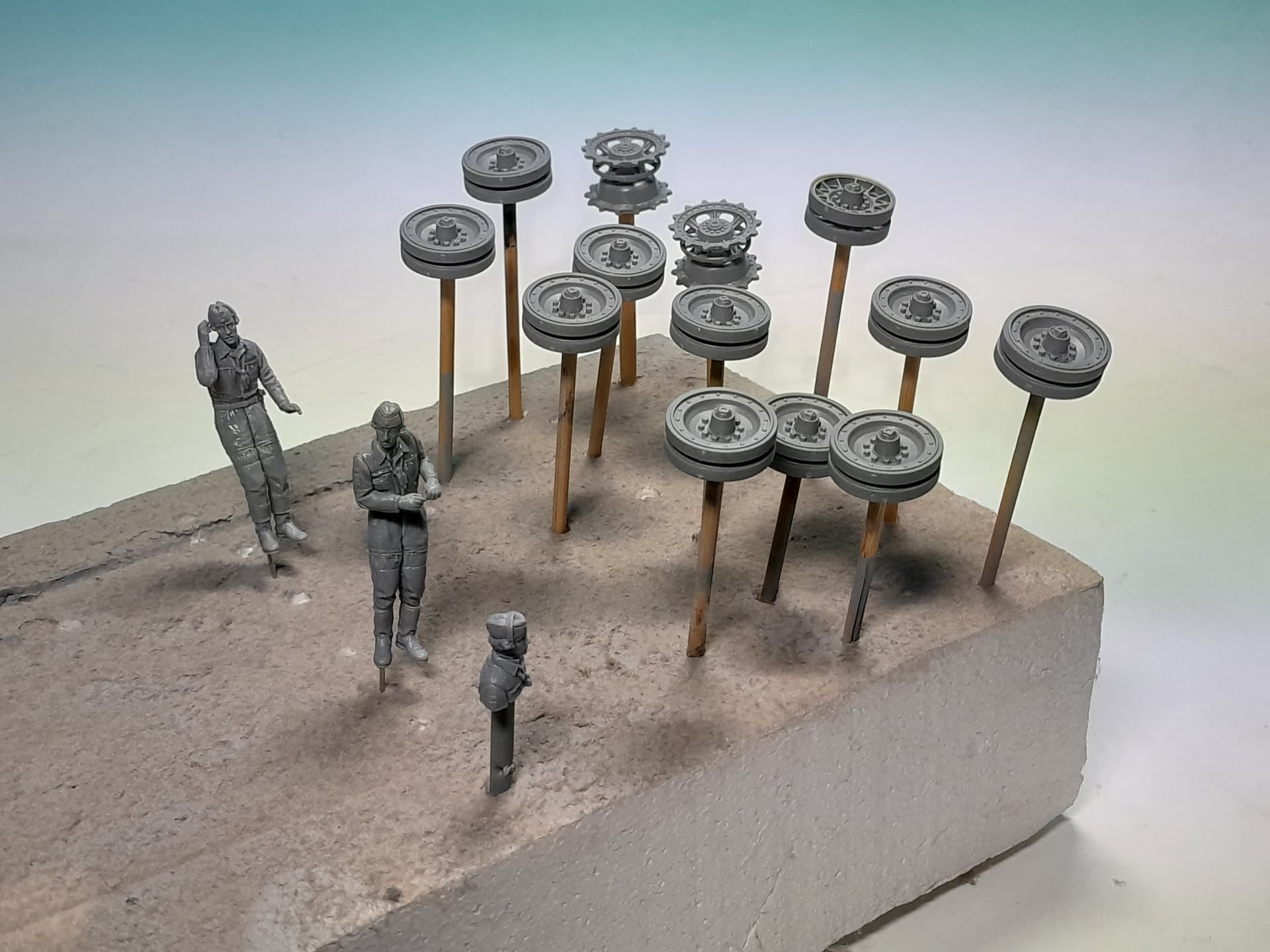 Time to prepare the tank crew. Valkyrie´s resin figures are very nicely sculpted. I attached sprue and wire at the undersides of the figures to let me fix them at the appropriate height out of their hatches. After priming and painting I will attach the microphone cabling only after finishing the painting procedure