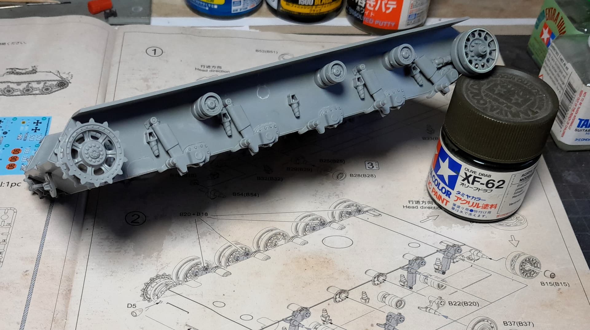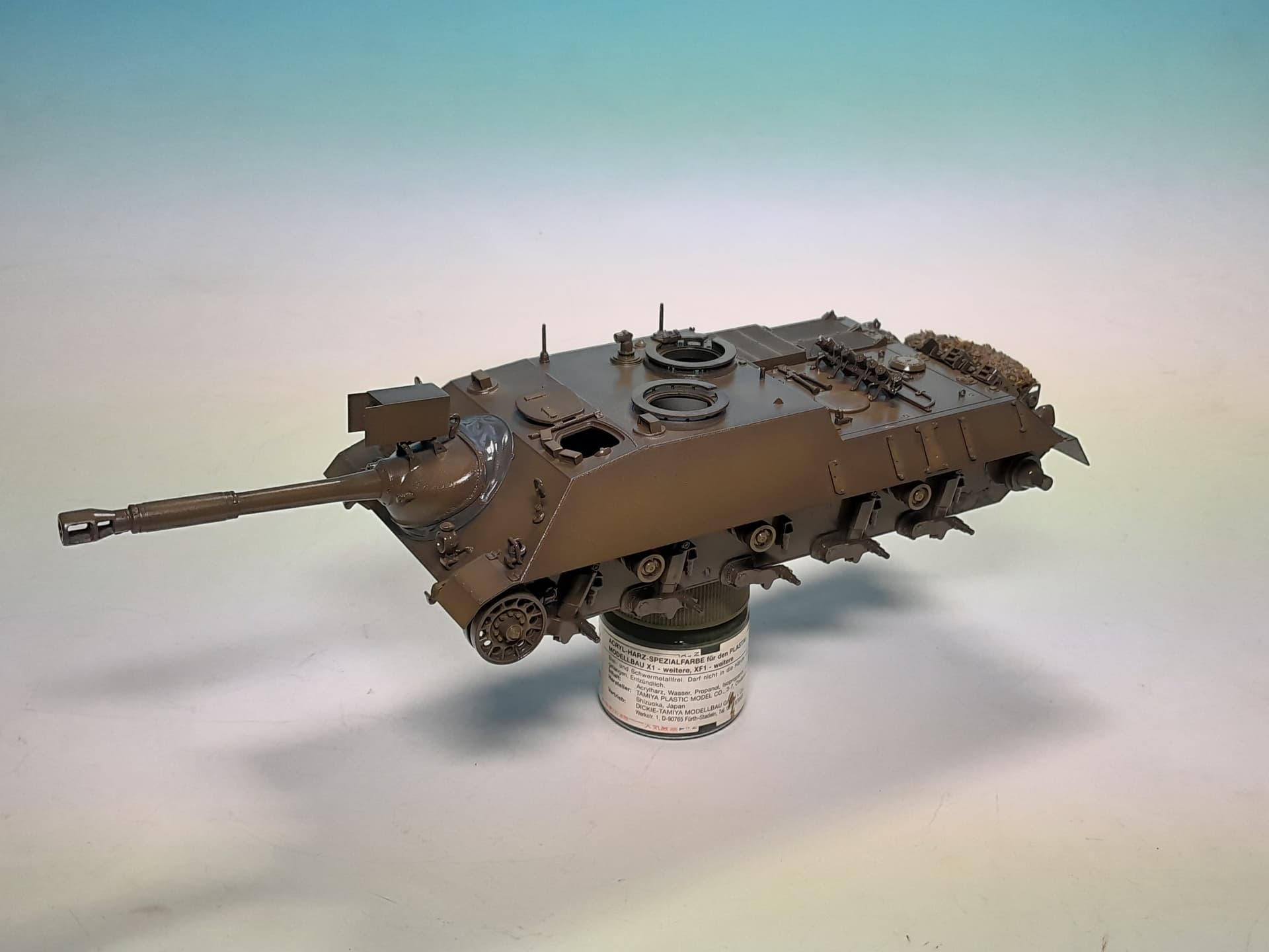 Then I spraypainted the tank parts with Tamiya XF-62 Olive Drab and highlighted the surfaces a bit with XF-49 Khaki