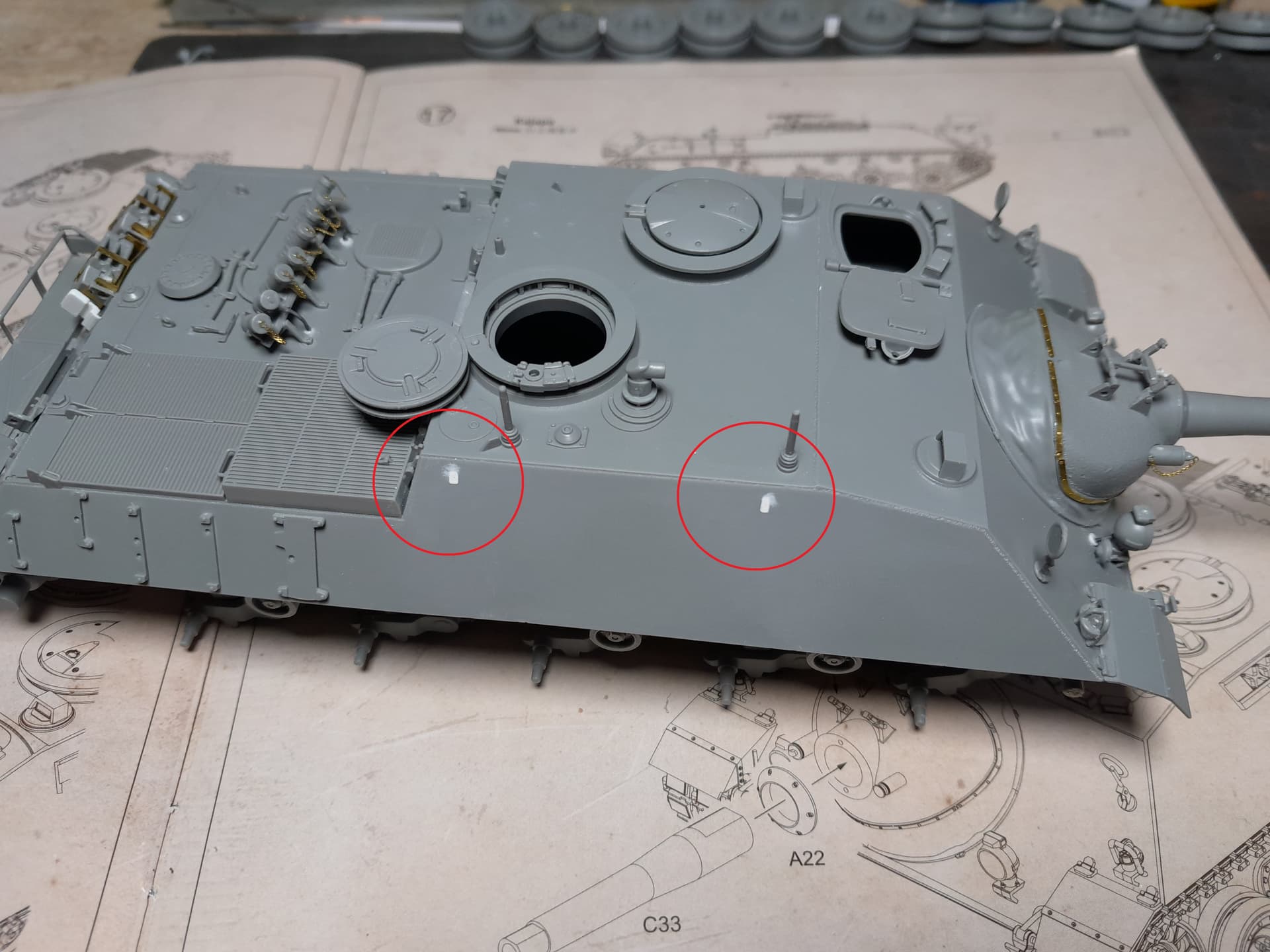 In the two pictures of my client´s tank there are no racks for the ice cleat which indicate its an early Kanonenjagdpanzer. Therefore I had to fill the fixation holes on both sides with putty to make the surfaces even