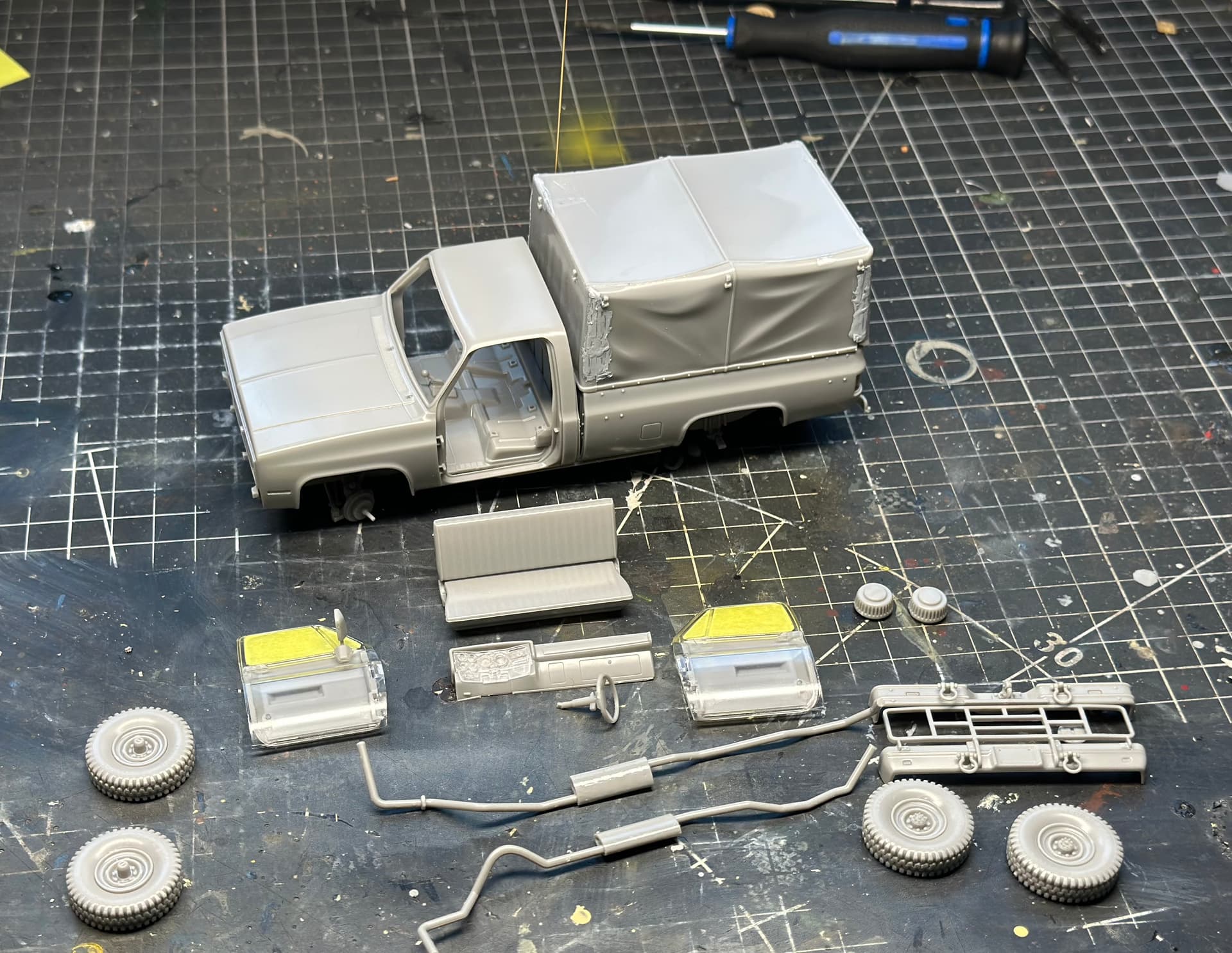 Fit of the kit is decent, detail is reasonably sharp and it falls together in about 3-4 hours. The cargo cover however was horrific to put together. Massive seam lines and lots of filler required. Going to paint and prime the cab then move onto the rest of the painting.