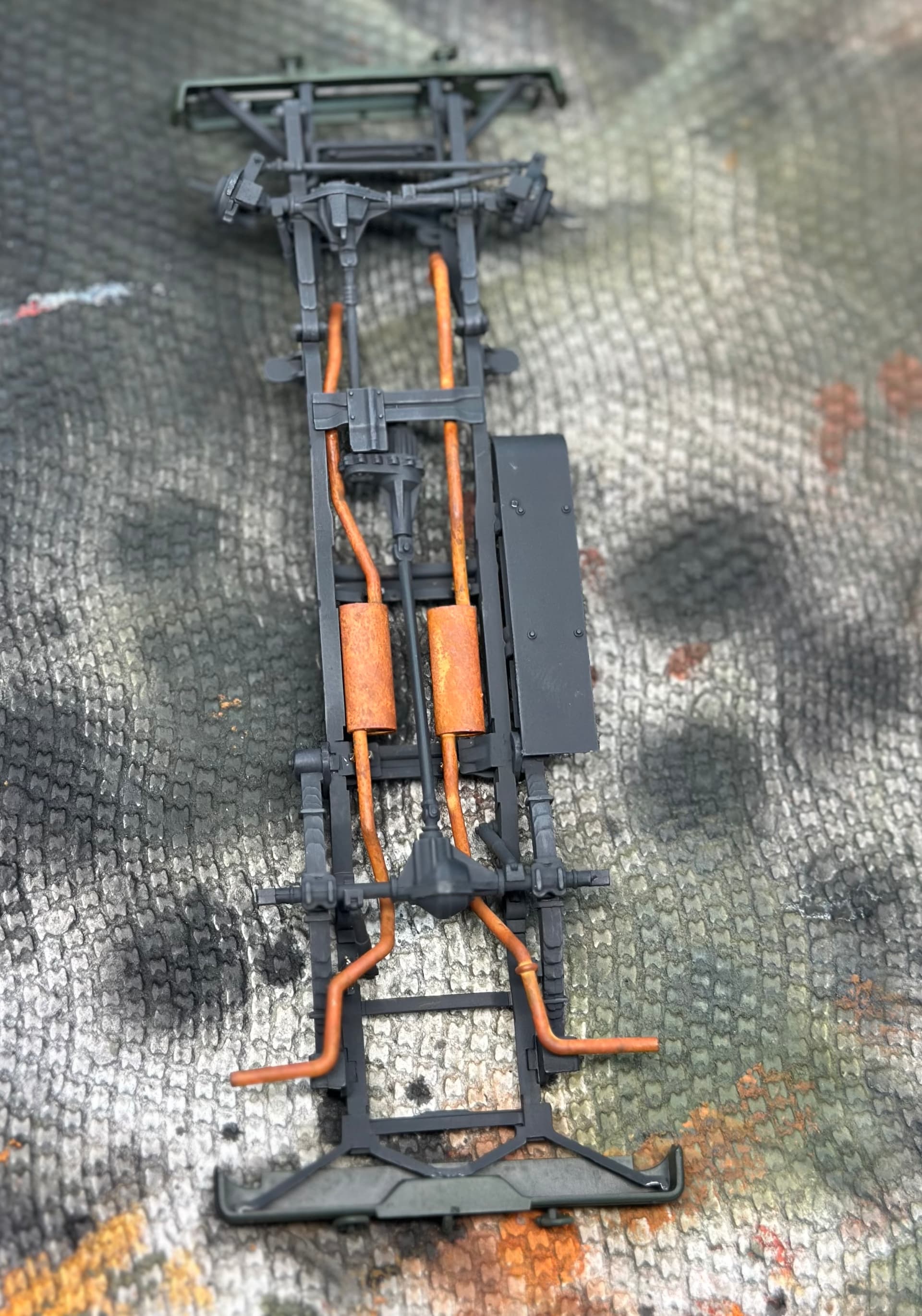 Exhaust painted and installed. Side mirrors also painted a slightly different shade of green. Not sure if I want to mount the cab and box to the frame before or after weathering .