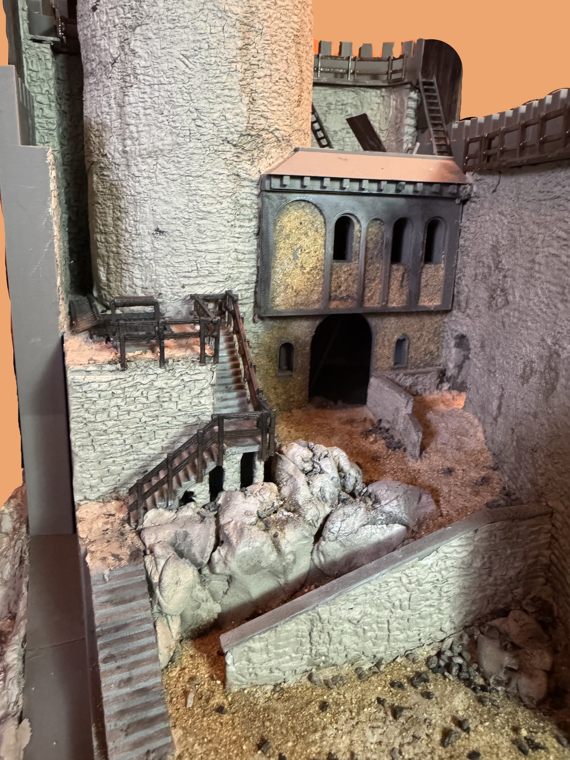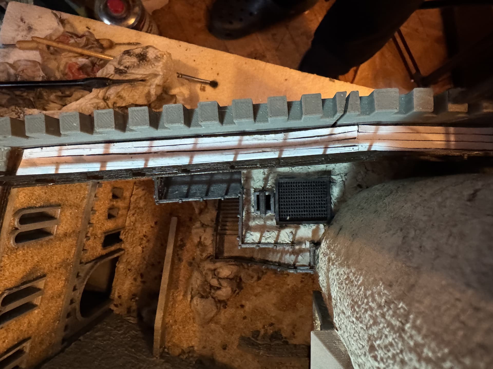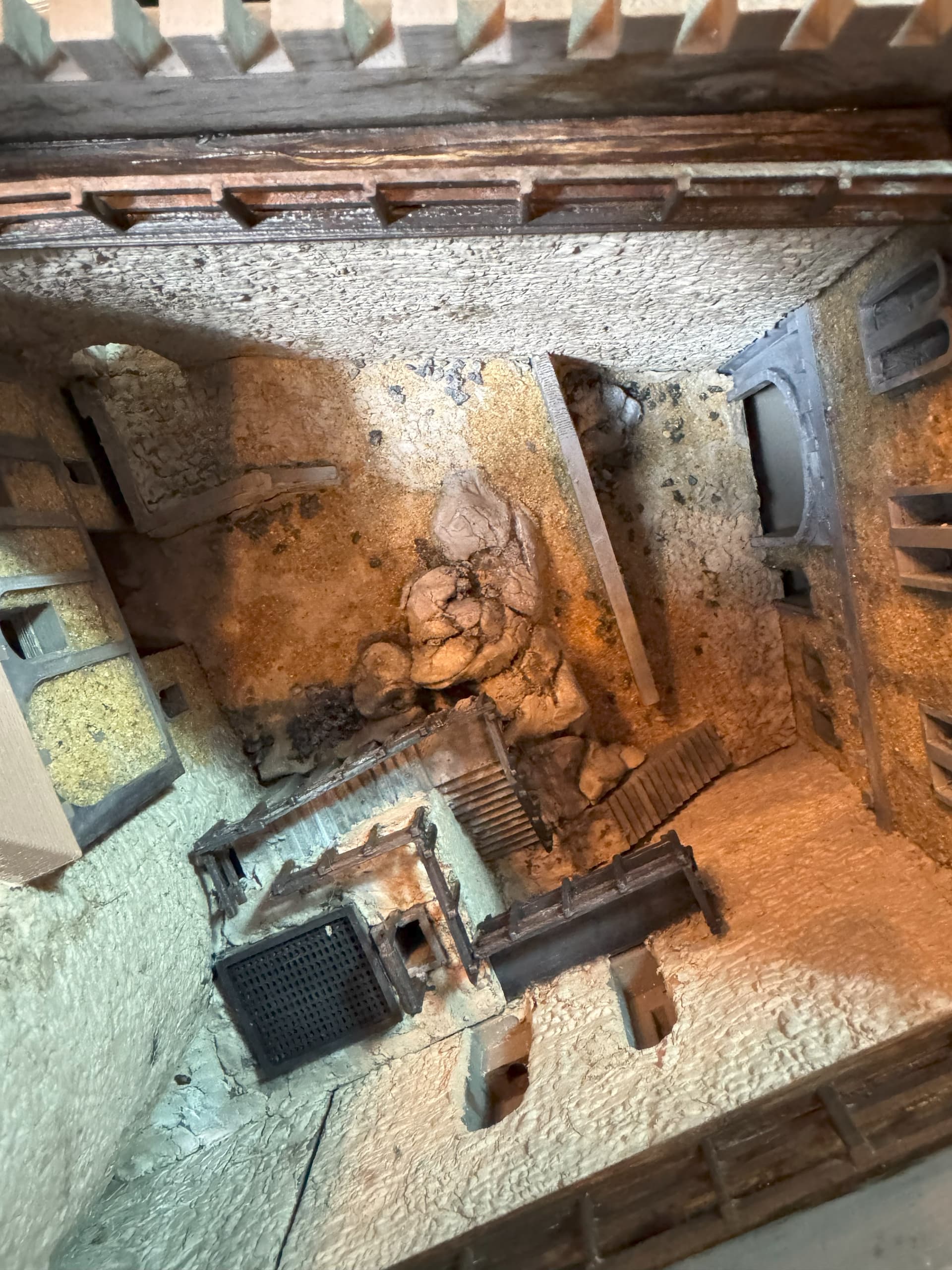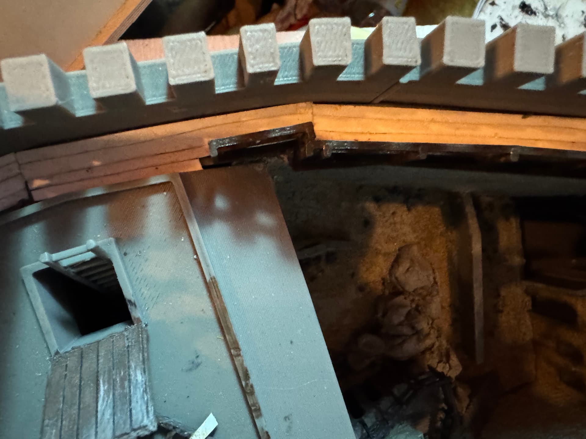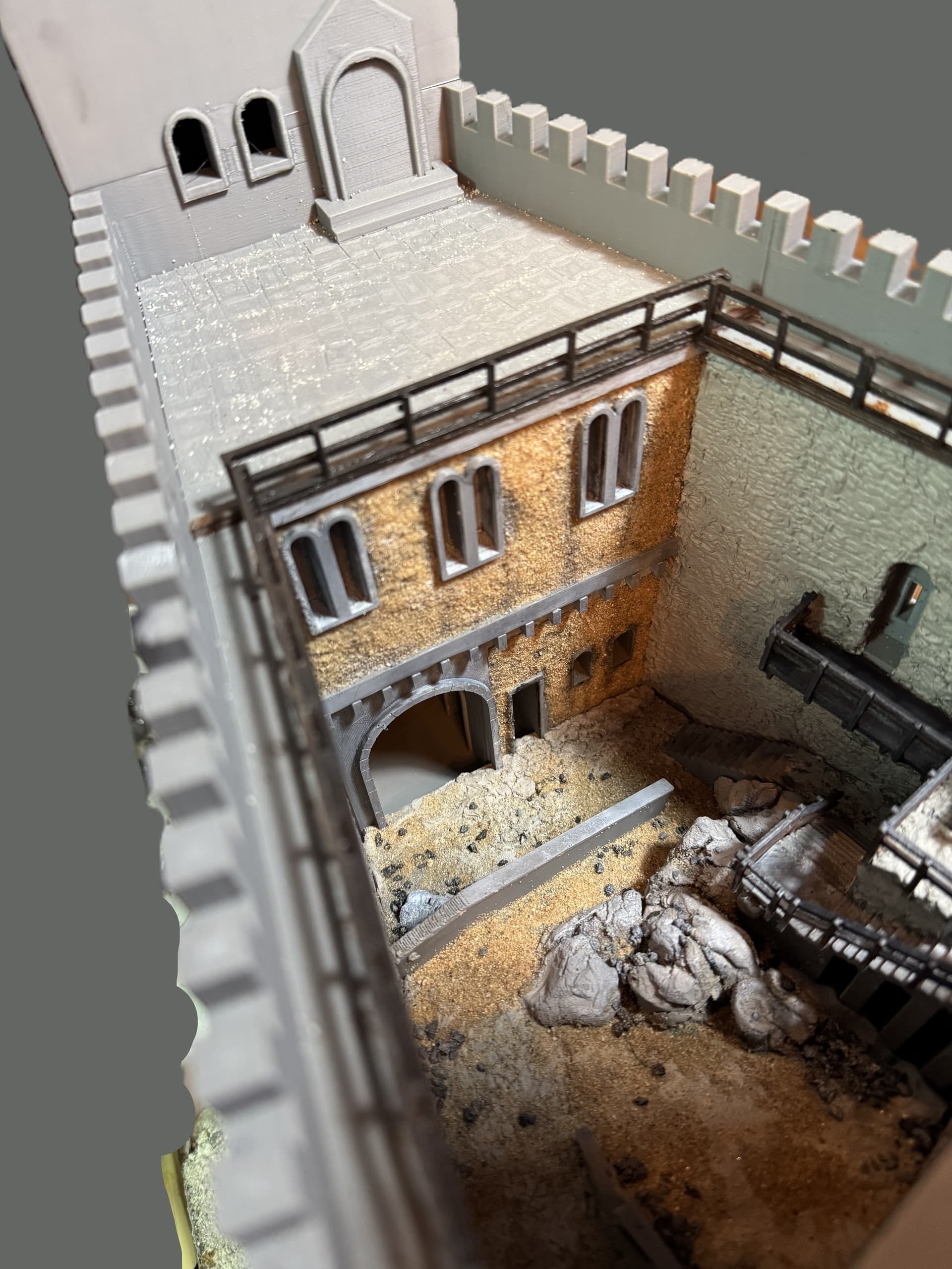 The roofs of the Pallas and the servants’ quarters were covered with stone slabs. The “wall stones” on the battlements were modeled. The wooden parts received an additional drybrushing with Sahara tint. The passage from the cistern to the loophole was given a wooden surface made of artist’s cardboard and was colored. The door to the small tower (accessible from the roof of the Pallas) also received a textured surface made of artist’s cardboard. The walls in the courtyard received a modeled cornice. Various parts were slightly repainted.
