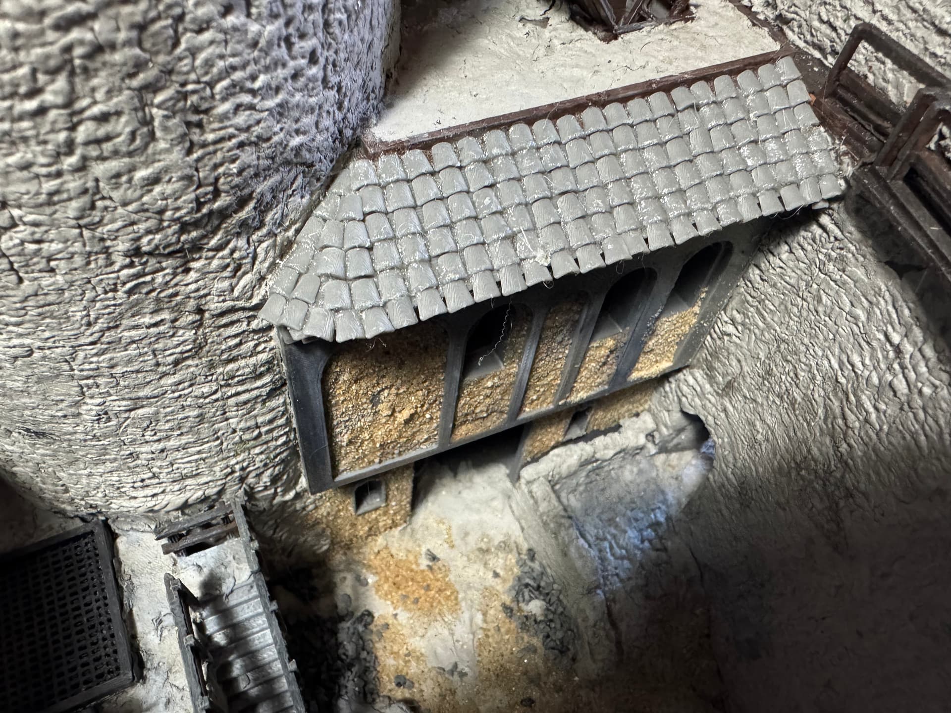 The roof of the servants’ quarters was “tiled.” For this, the roof tiles were glued individually, as Mediterranean roofs were not covered with plain tiles, but with hollow tiles (?). The construction was again carried out using Fusion 360. First, a trapezoidal surface measuring 4.5 mm long, 3.5 mm wide at the front, and 2.5 mm wide at the back was created. This was extruded to a height of 2.5 mm. Then, the upper, side edges were rounded so that they met at the wide side. This creates a semi-conical shape that slopes downwards. This shape was then cut into the front by approximately 0.2 mm. First, the top row of tiles was glued to the top edge of the roof with the narrow side facing up. The tiles of the row below were glued with the narrow side into the notch of the tile above. This continued row by row until the roof was tiled. This is a very complicated explanation…but I hope it is still understandable.