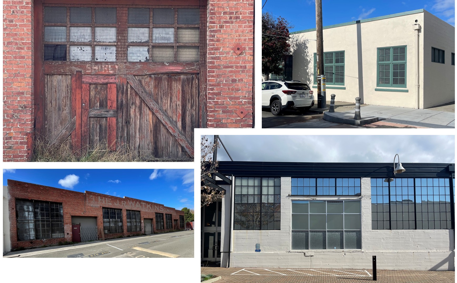 A curved track section running past an industrial building - and the building, taking some cues from these local examples: