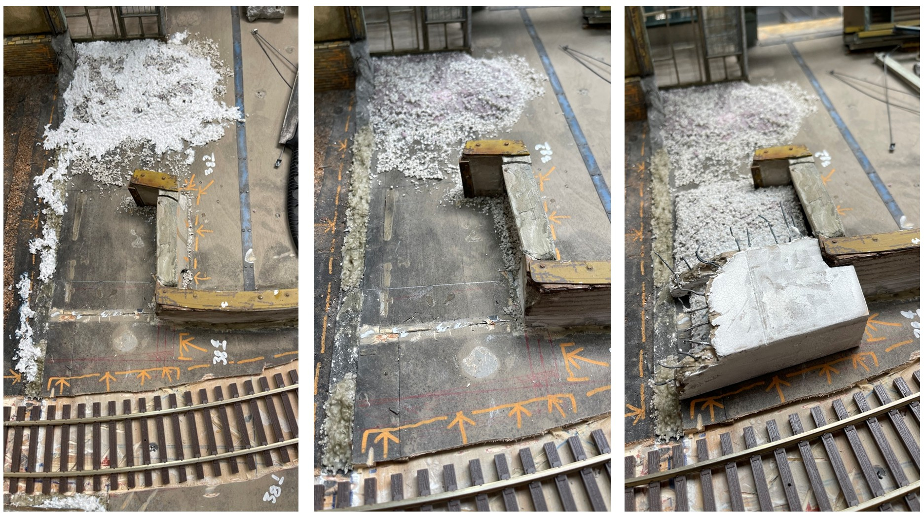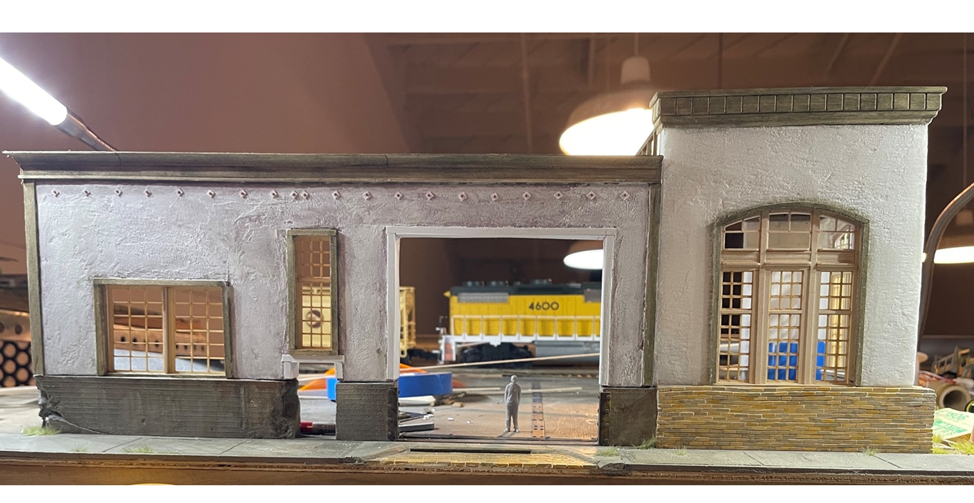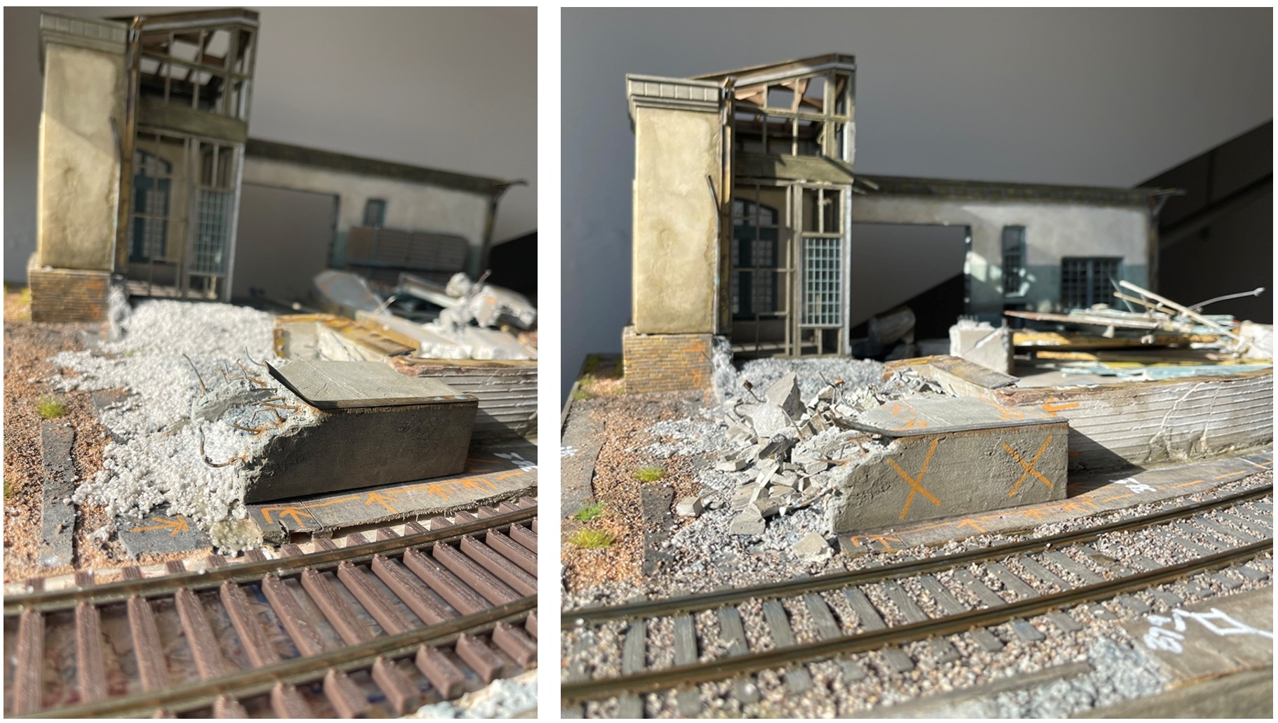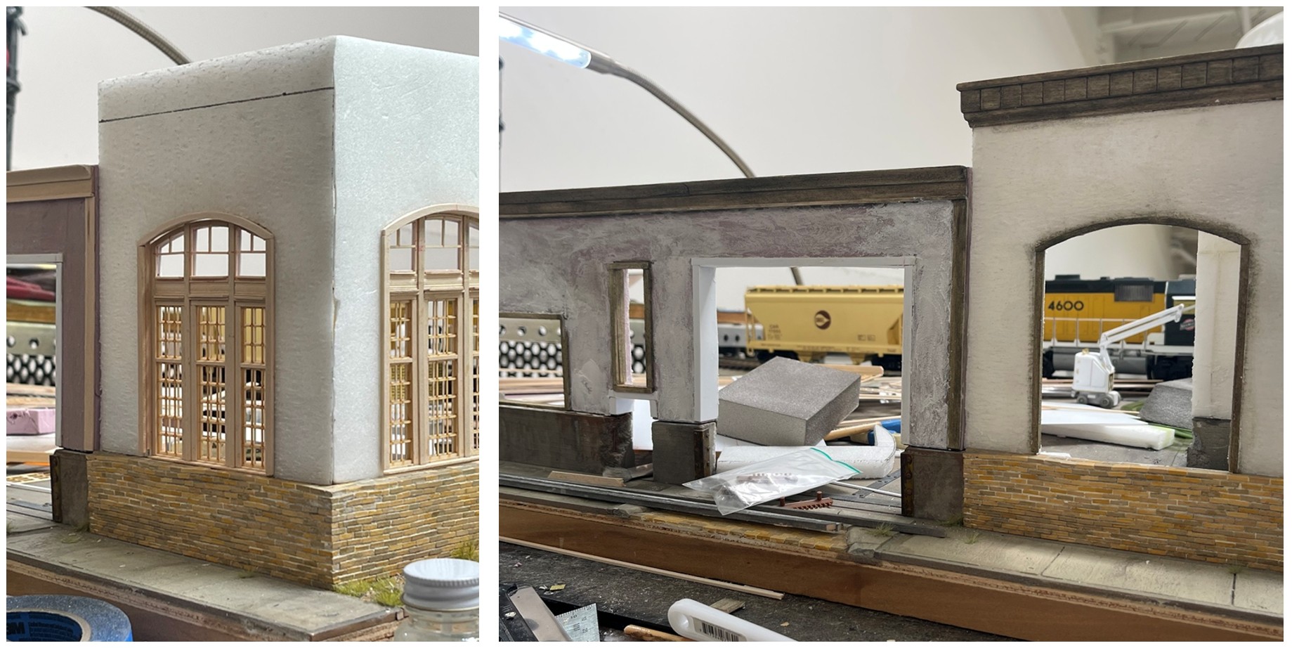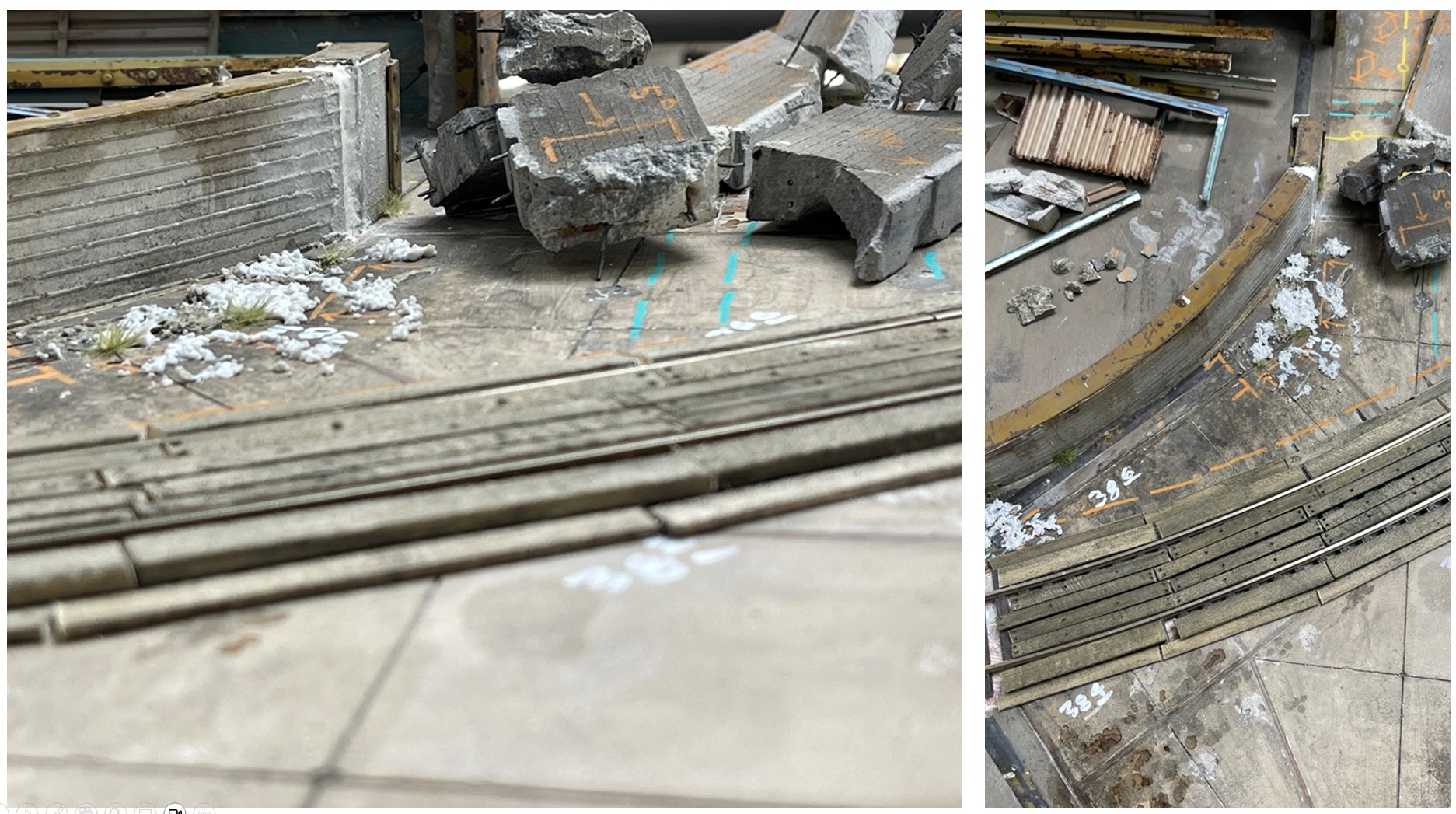The un-good side of this is that to make the curved footing and track work, I’d need to use a small cutoff wheel and make “trenches” for each in the base. The stem wall is shown on top of the shop floor, which is thin plywood glued to basswood sleepers glued to the base, and the tracks run over this, and the driveway which is poured in place hydrocal!! So, while potentially cool results, clearly a messy process!!