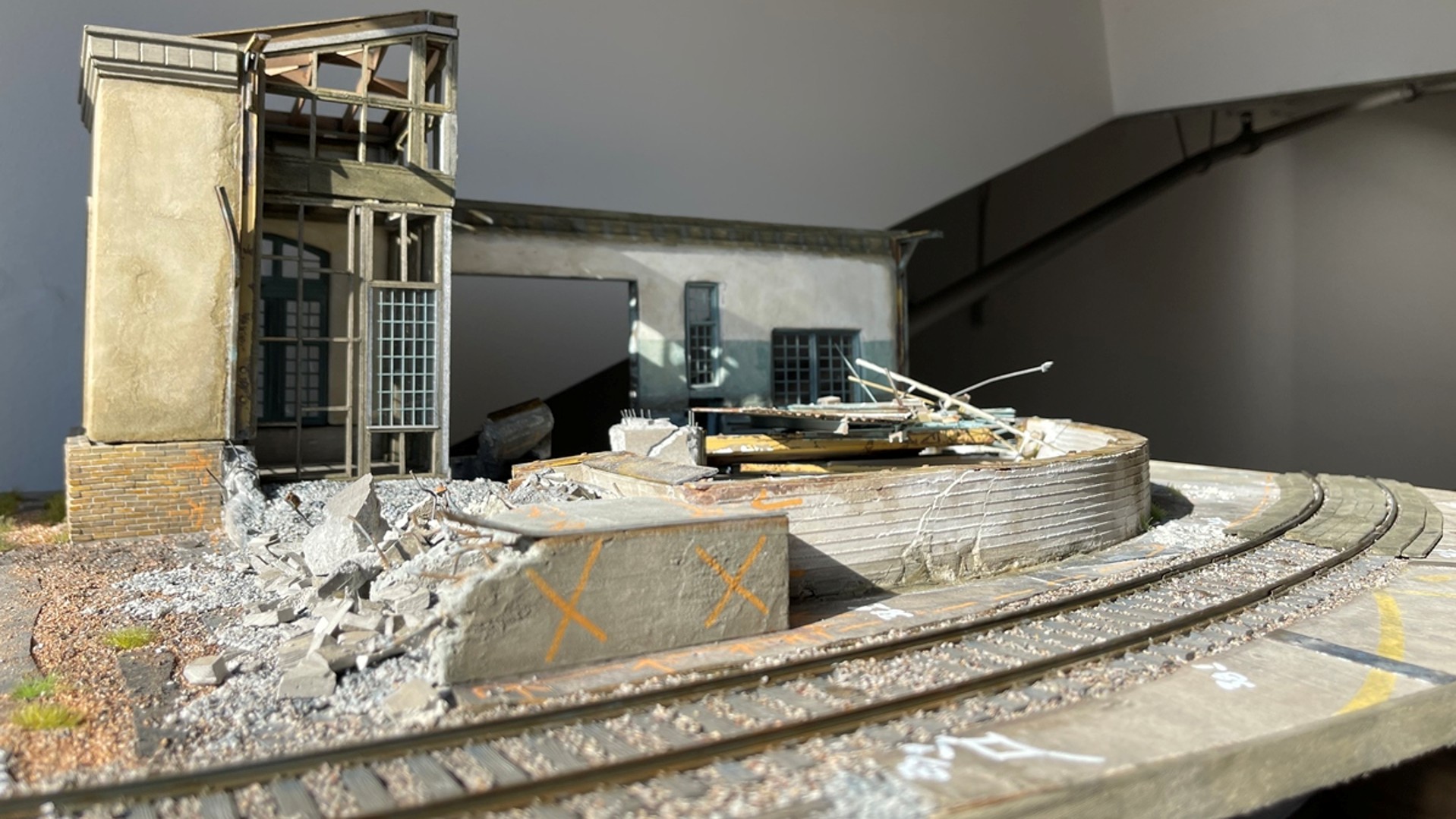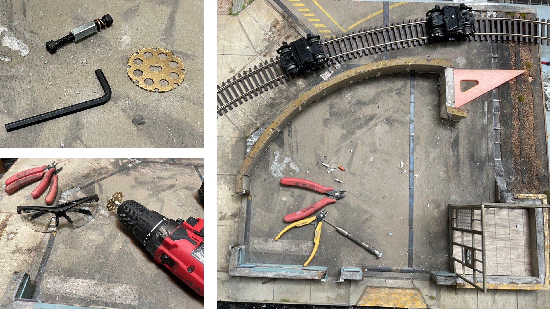 On the right, you can see train tracks, and the curving yellow line which is a cap on a foundation stem wall from the other side of the base. To make these parts work on the new project, I needed to cut a trench in the base: