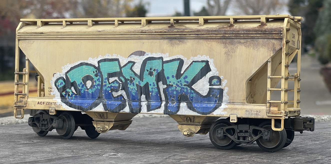 This is done with a series of washes. As it turns out when I’m riding my bike around I’ve noticed lots of rail cars, so it eventually occurred to me to take some photos for prototype examples. I found that hoppers I’ve seen generally have rusty corners, or general grime, and for this, I opted for the grime. I also noticed lots of artwork in addition to the typical livery, as in, lots of graffiti - some really nice and other that’s just bad: