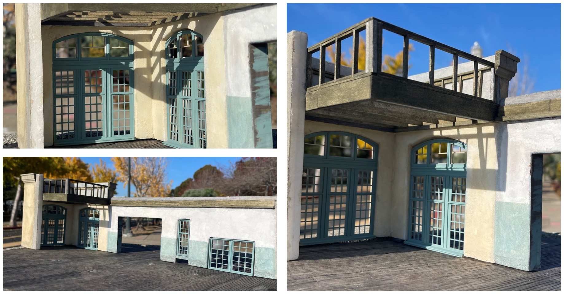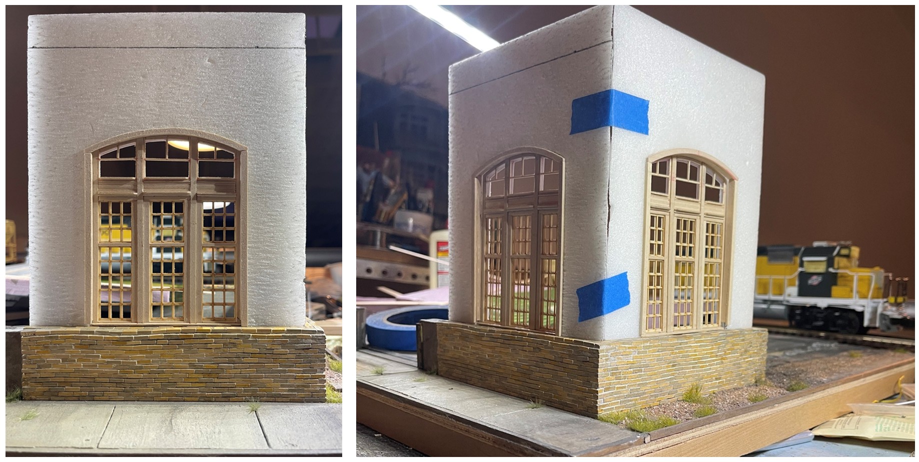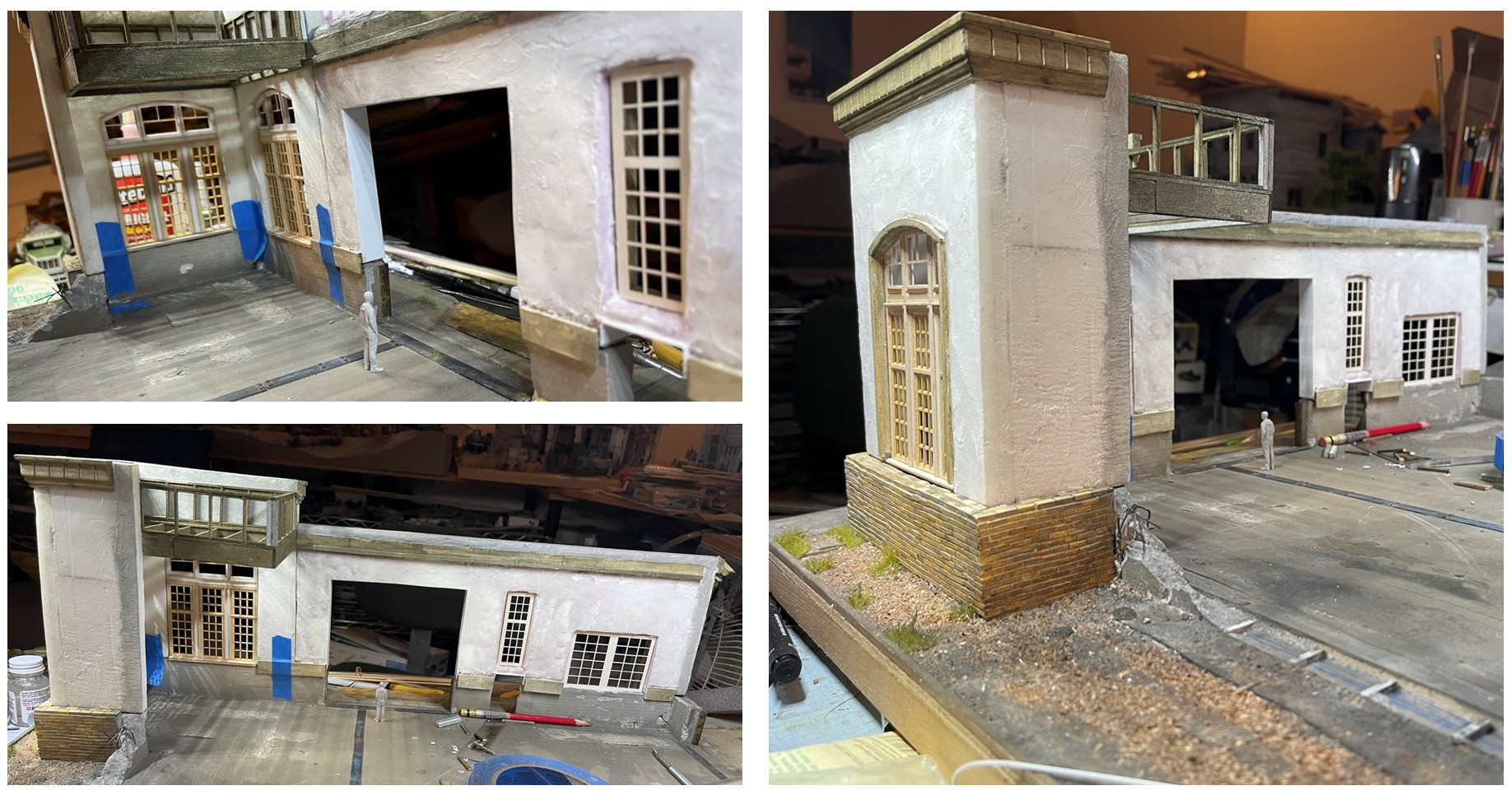 And more progress on the wall, which is still not glued in place. I framed up a pitched roof over the office area and weathered the windows. Sorry about the dark pictures, as the colors look pretty good in real life.