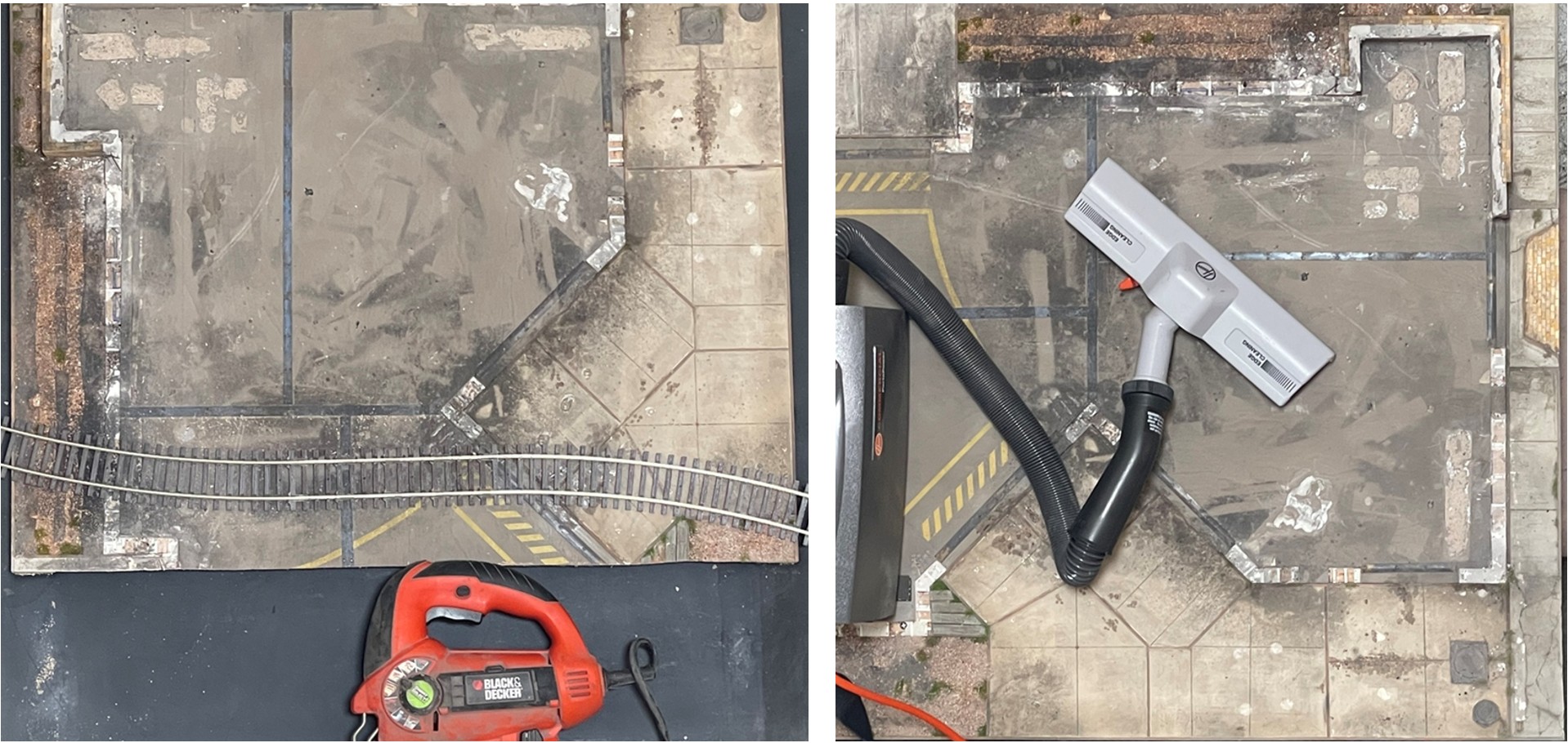Step one was to take the vacuum to it, then mark a clear cut line, and then do just that. It turns out this base is remarkably durable, with the saw cutting through layers of plywood, hydrocal and and whatever else I generously applied to it. I selected the cut line in order to allow for track and a convincing building footprint, to keep much of the driveway (which is made of hydrocal and looks good), and a segment of foundation with a nice brick facade.