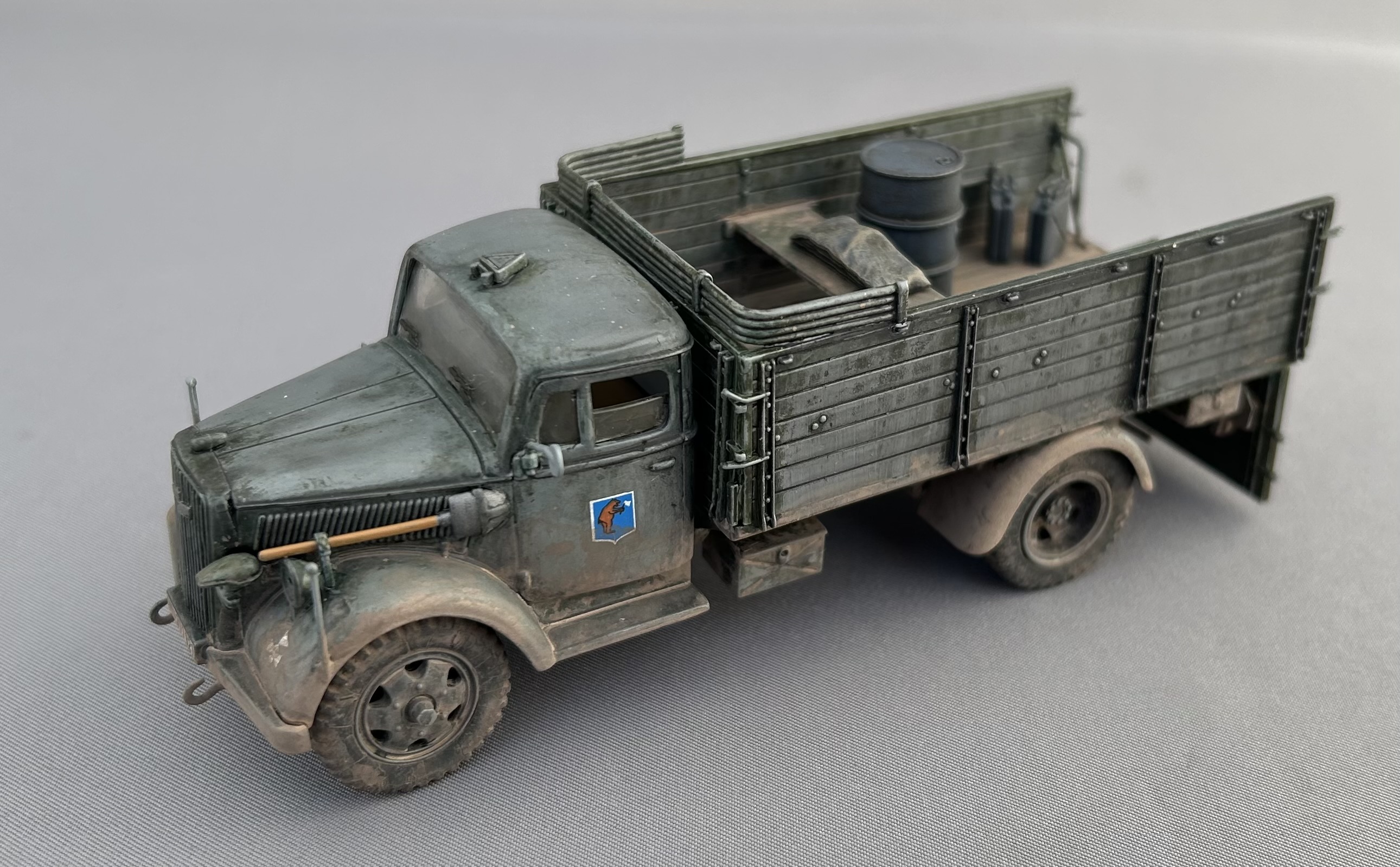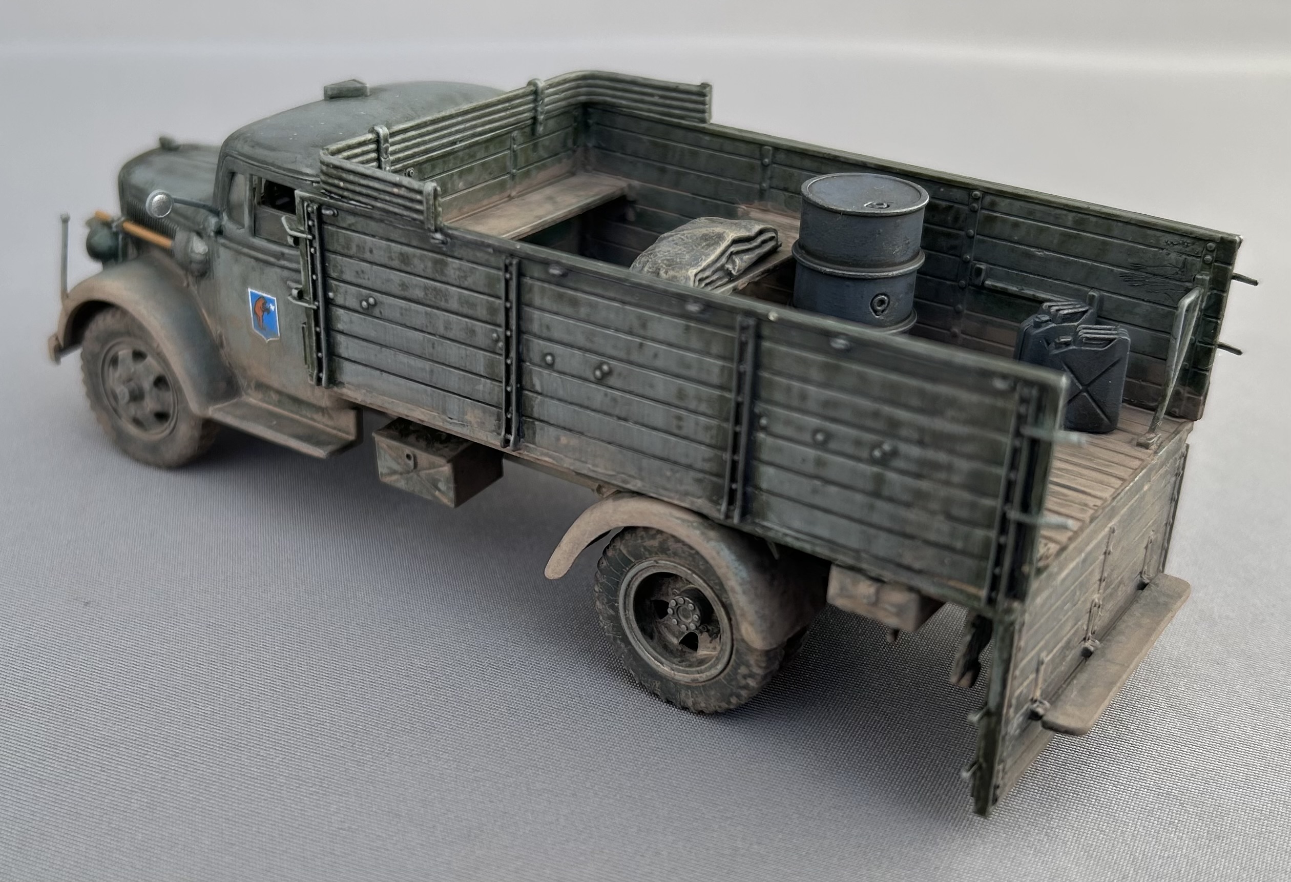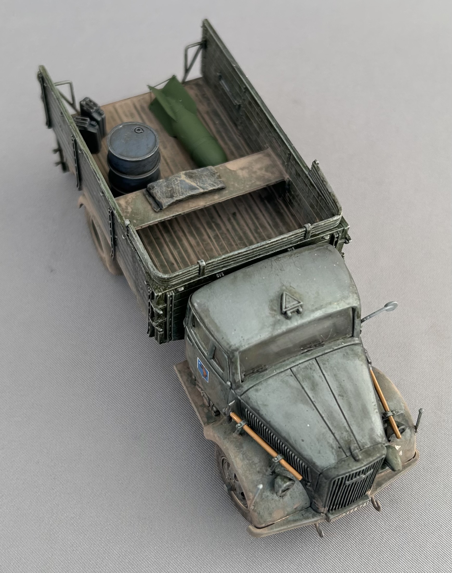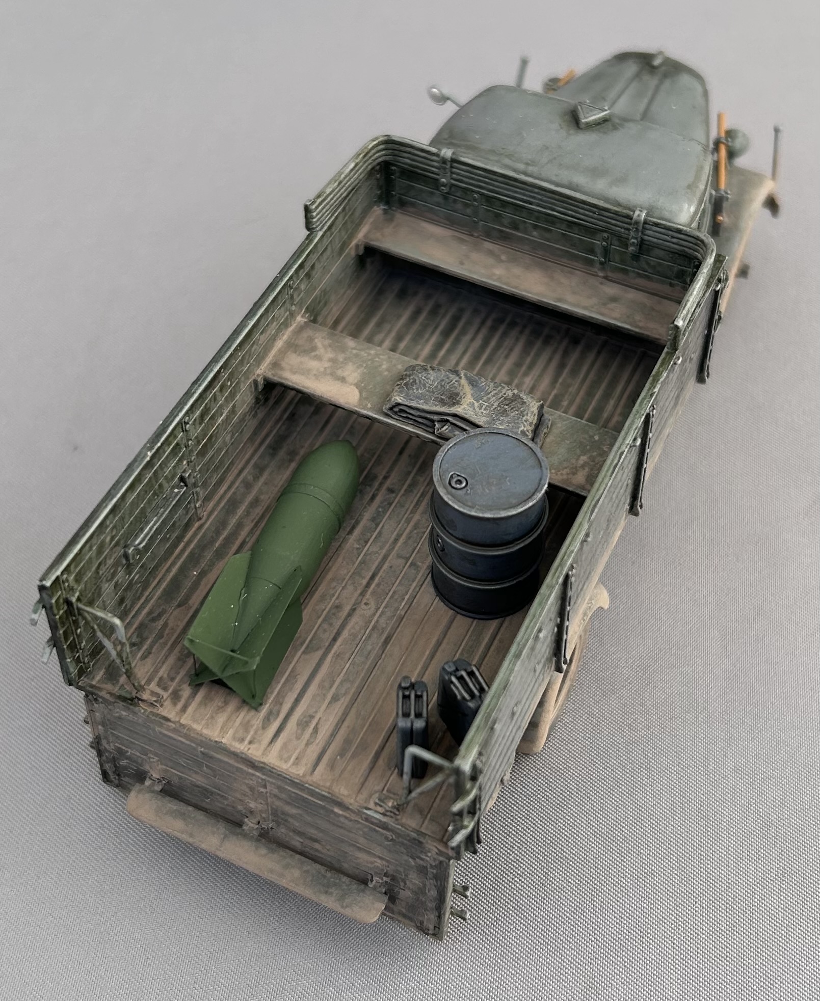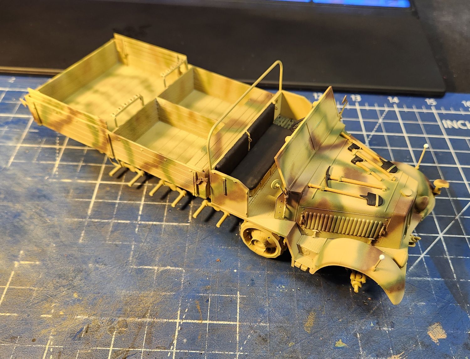 Just now did the tools indicator knobs, and bits in the office of the Sd.Kfz 7. Dash to be installed along with the wheels/tracks to finish assembly and then decals and weathering/wear. While this lot dries I am contemplating what color filter to meld the camo, and I am also going to try and make a rolled-up bed cover and cab top. The kit includes a fully-extended cover but no folded option.