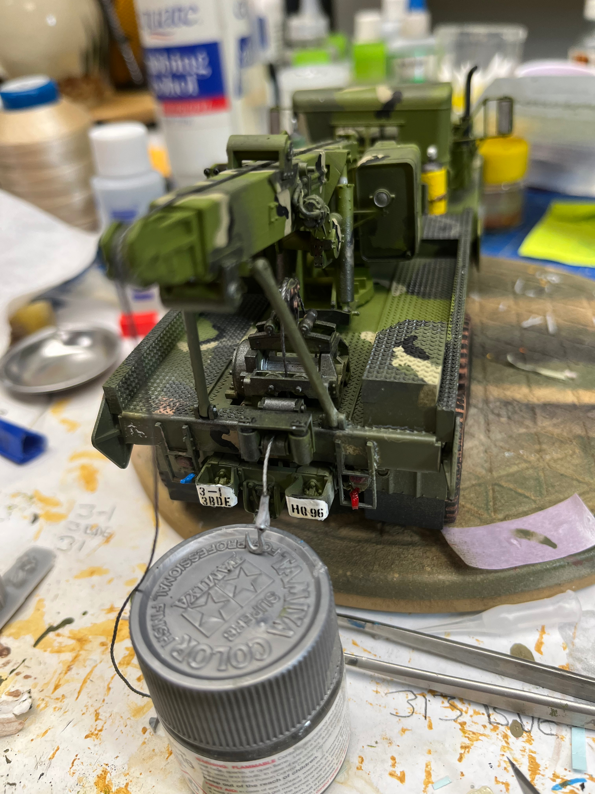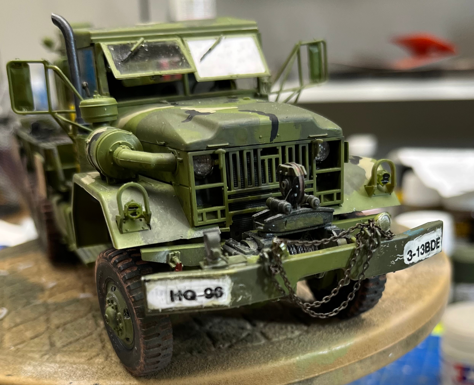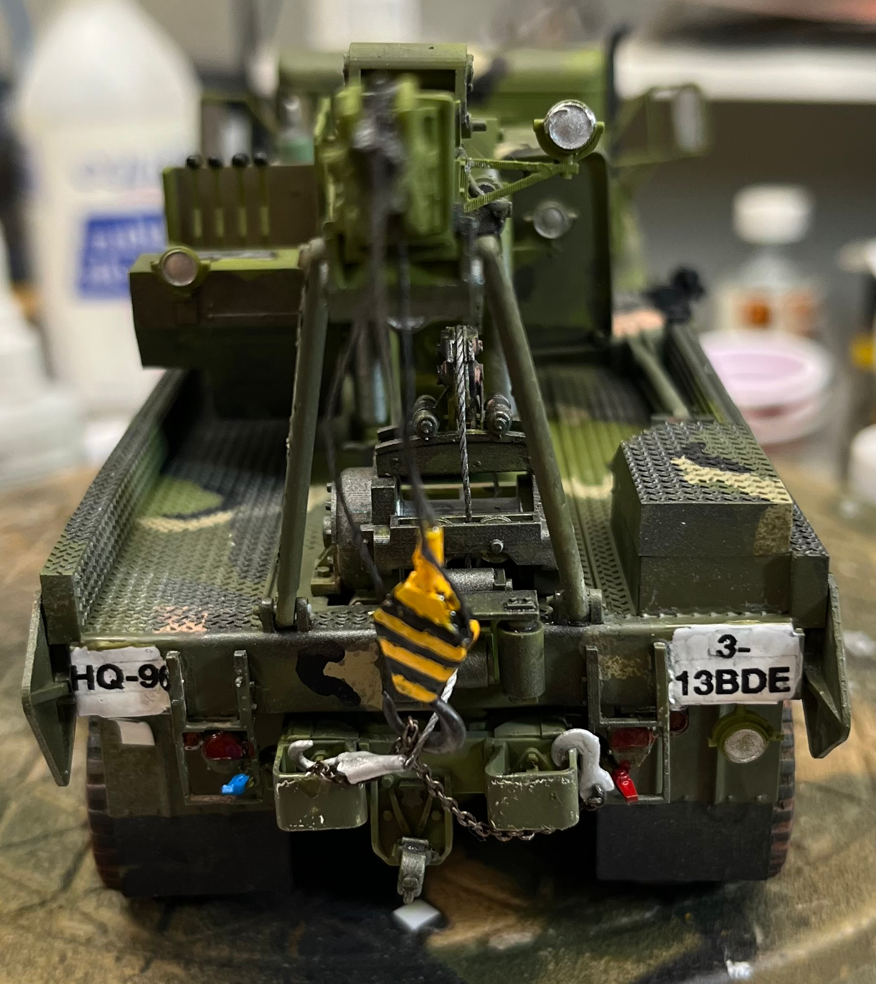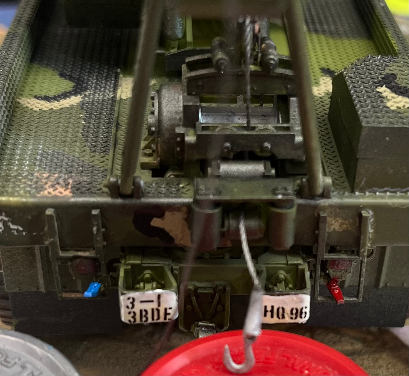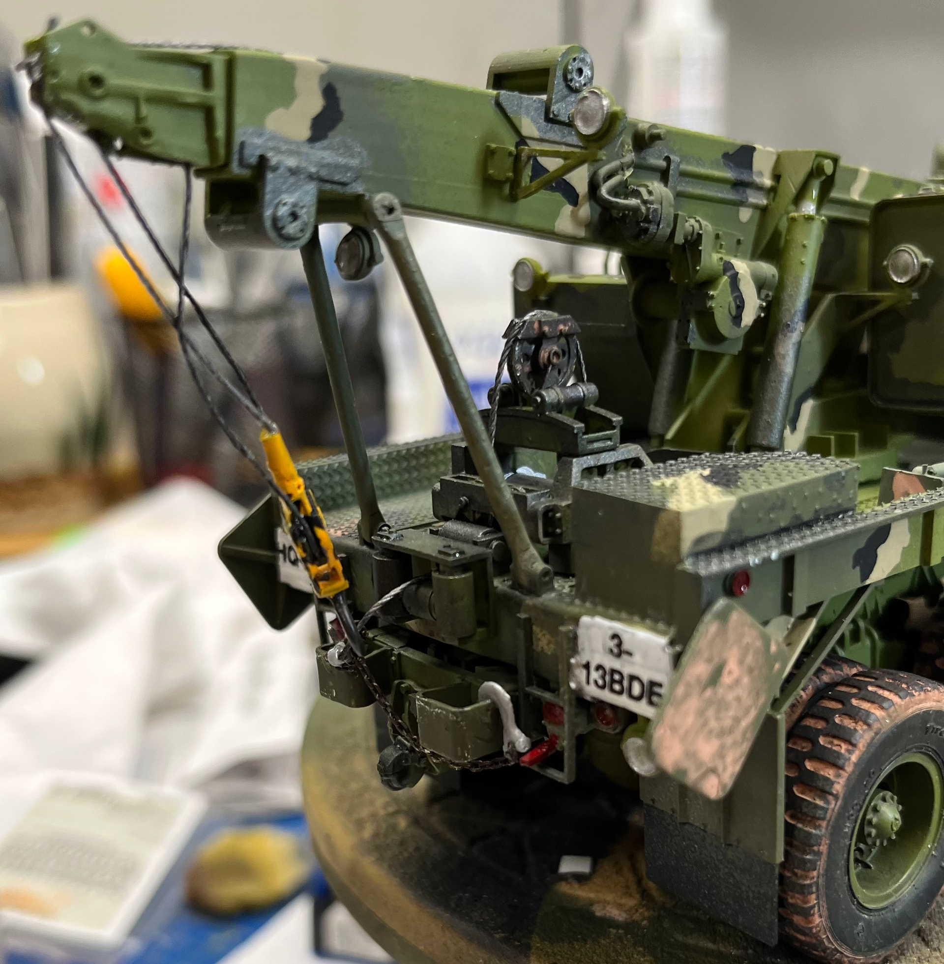 Re-rigged the crane and rear winch with the correct diameter cable and scratched a 3/4” clevis for the winch. Had to use individual letters for the bumper codes -horrible job!