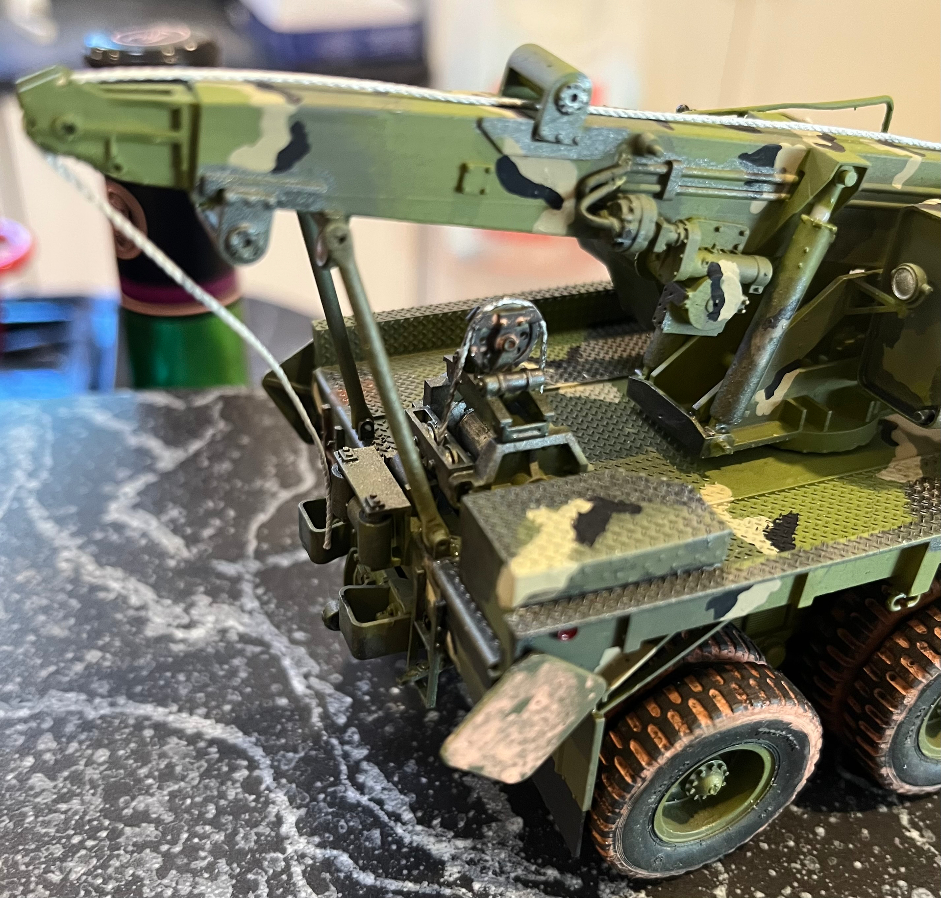 Realized the crane’s cable, at .55mm was too big for the task. So the appropriate .45mm was ordered. Arrived today and the base colour applied. The bigger cable is ± OK for the rear winch and I got the white background panels the for bumper codes in place.