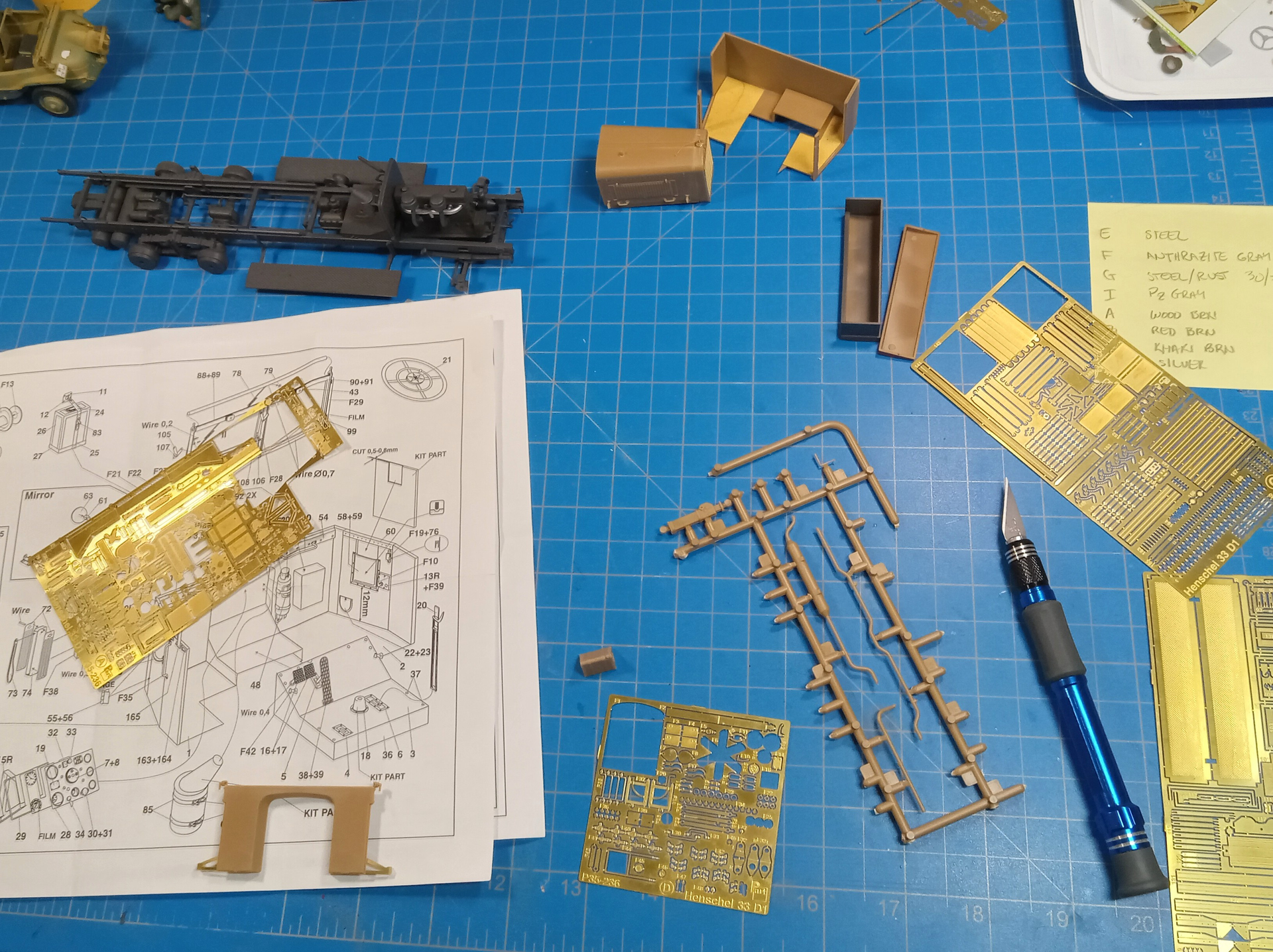 I’m here with the Henschel 33D. I have to finish the cab interior so I can assemble and attach and then I can start on the cargo bed, which has quite a few punch-out marks to deal with.