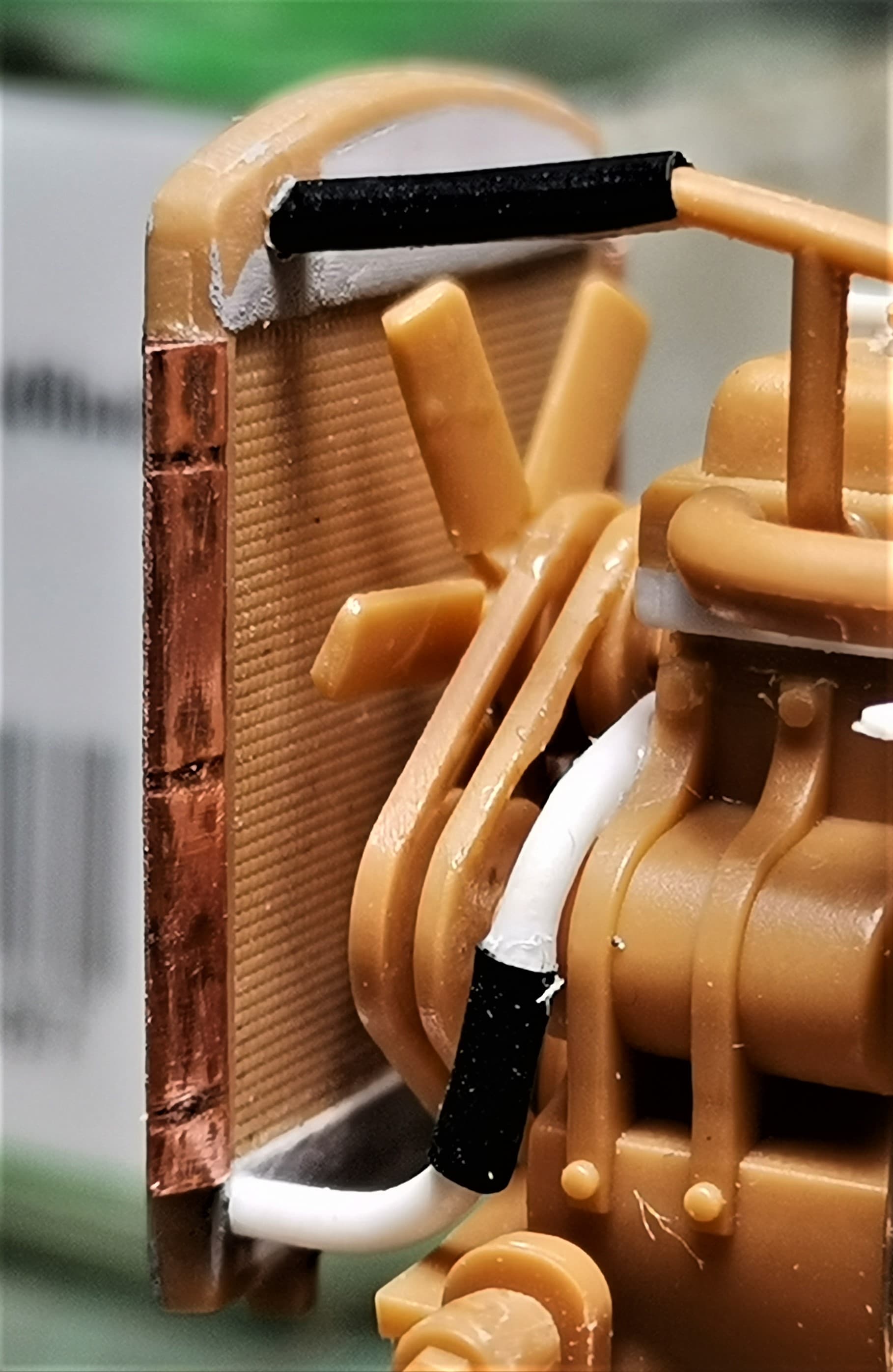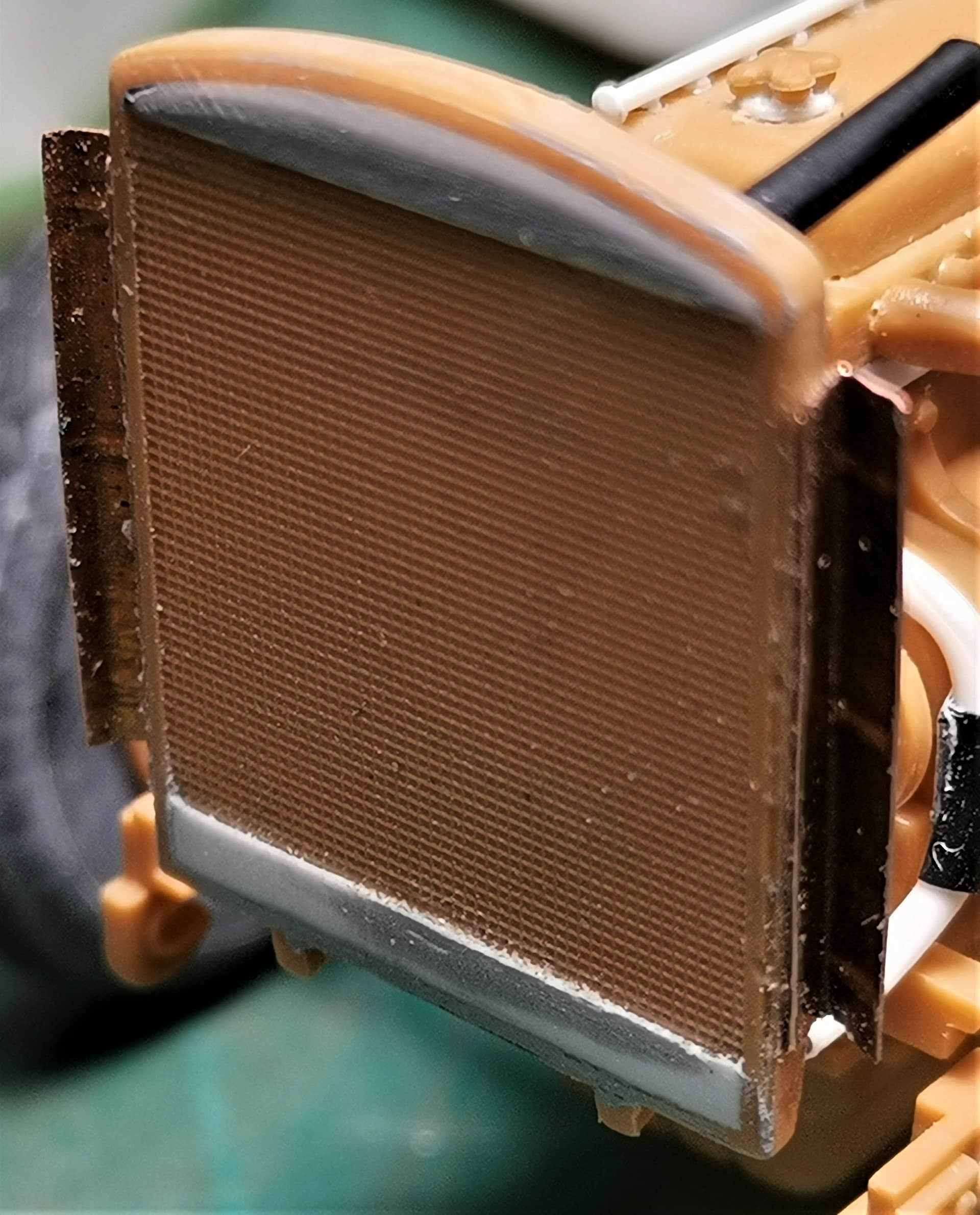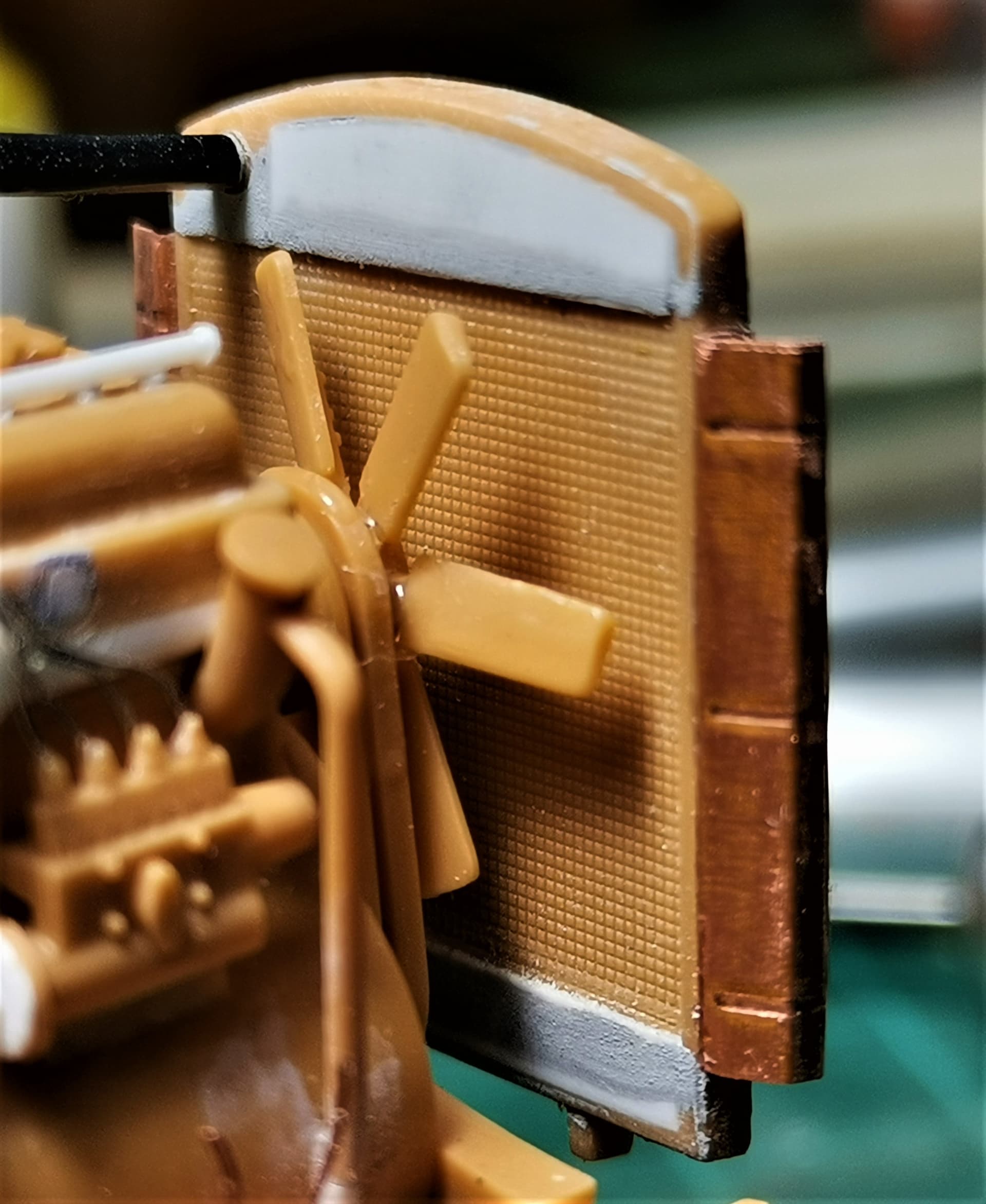 I’ve added some styrene top and bottom on both rad sides(these strips covered the nasty pin marks) and draw, cut, burnished and bent some copper sheet: