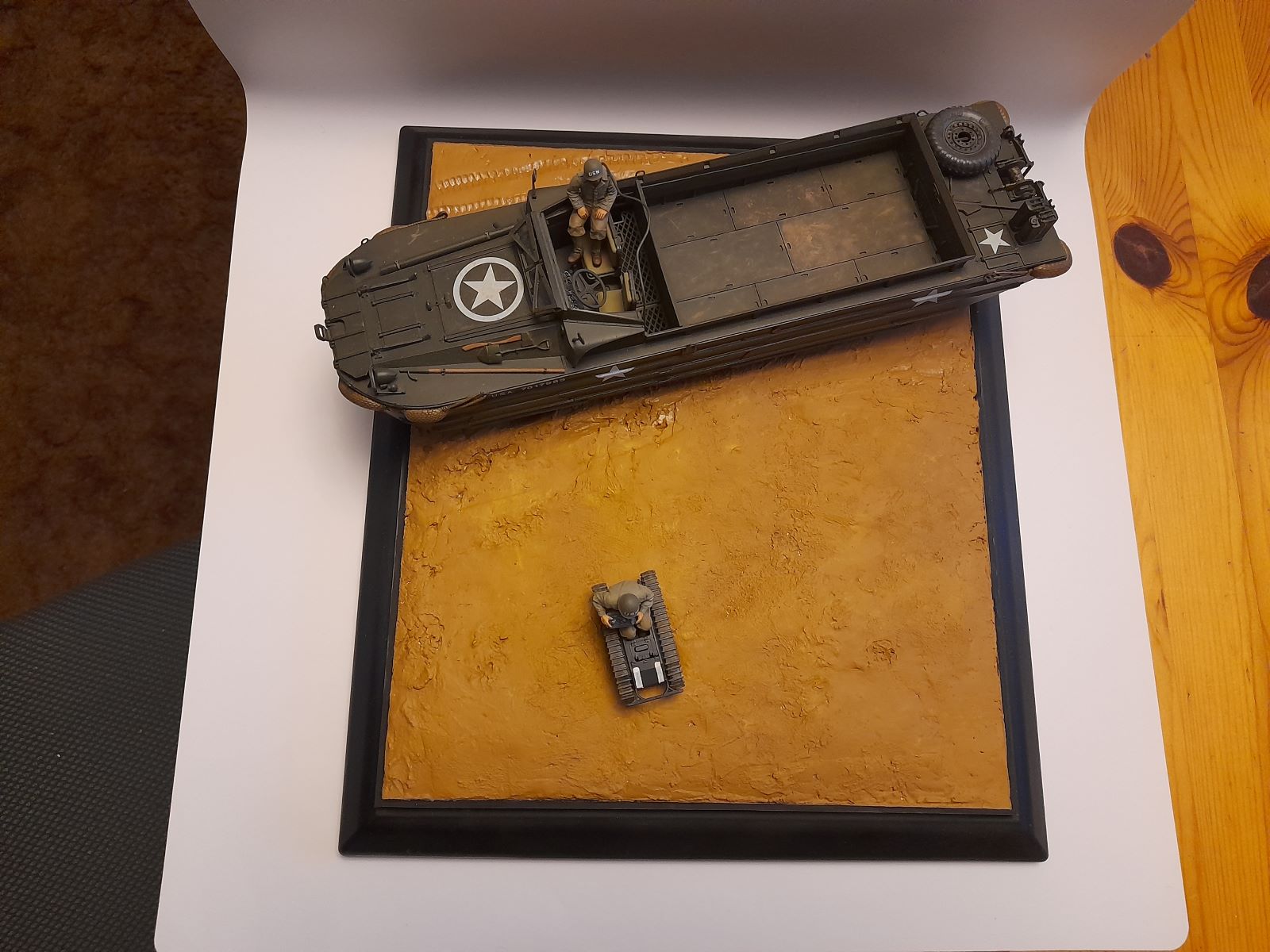 I was thinking of adding extra details such as a “hedgehog” or other figs, but I’m trying to match the original pic that had only the DUKW and Goliath as seen. Still, the spartan nature of it has an appeal of its own…