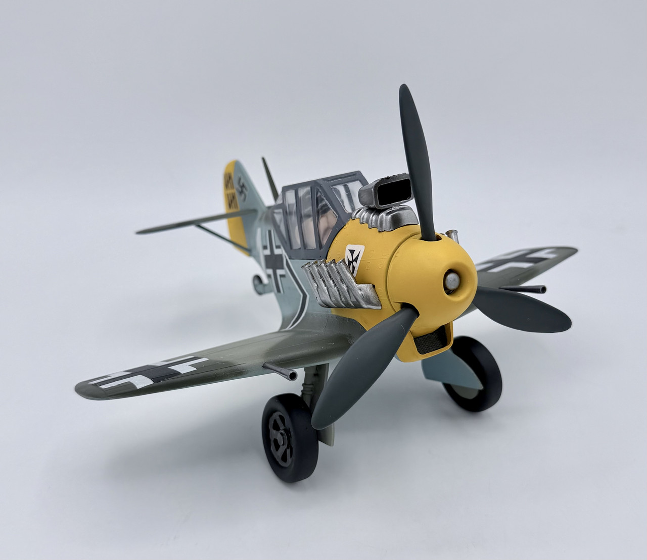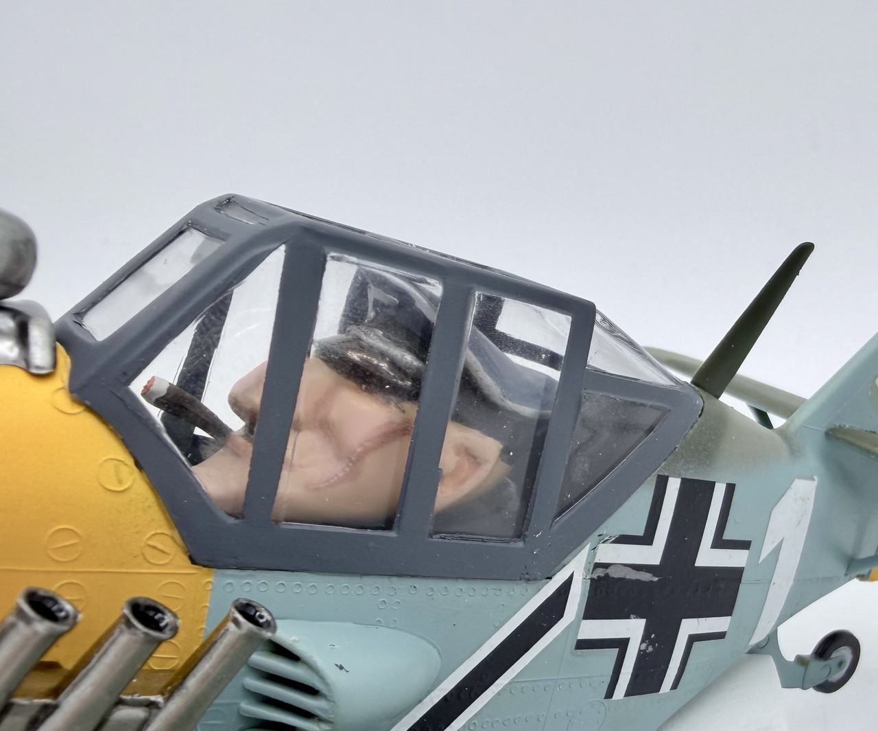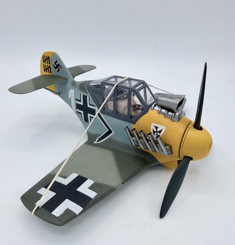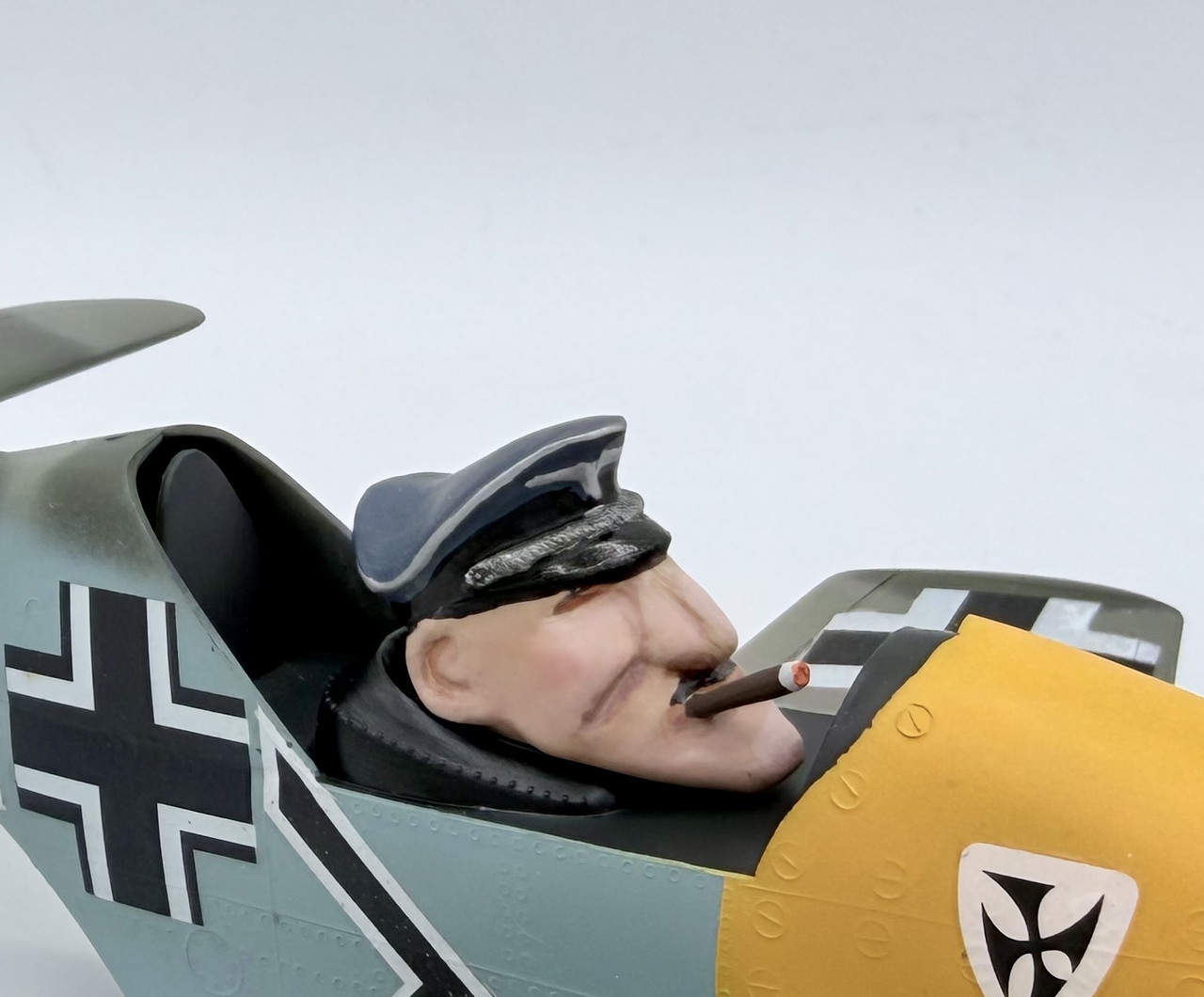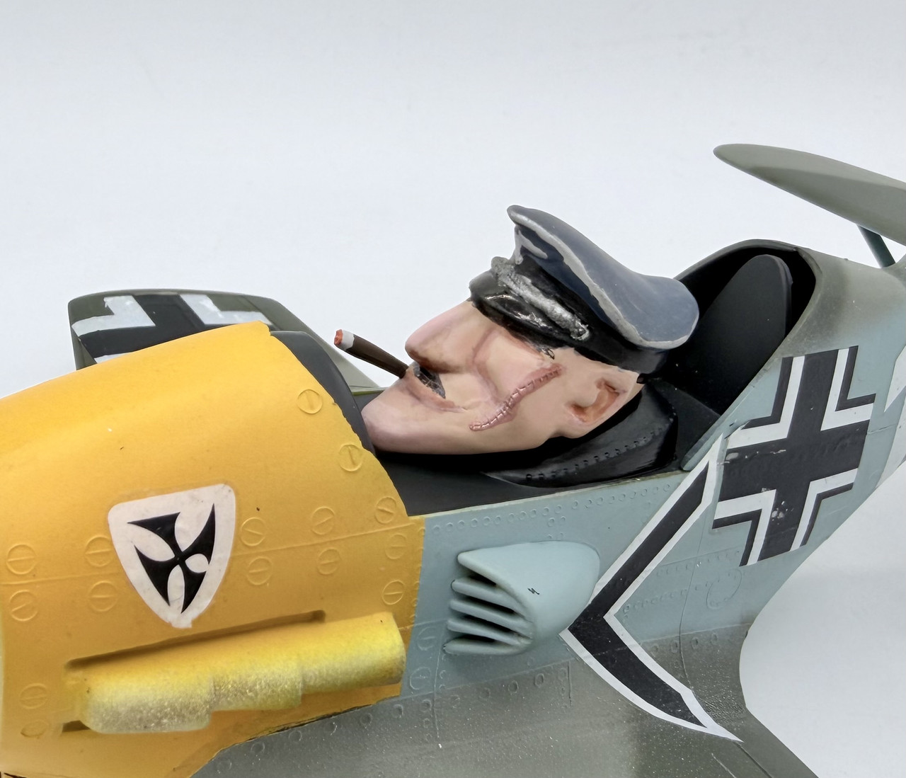 Well the past few days were the final push… since the pilot reminded me of Adolf Galland, I made a cigar from stretched Sprue and added that in the corner of his mouth. The only change I made to the kit aside from hollowing out the exhaust pipes and cannon bores