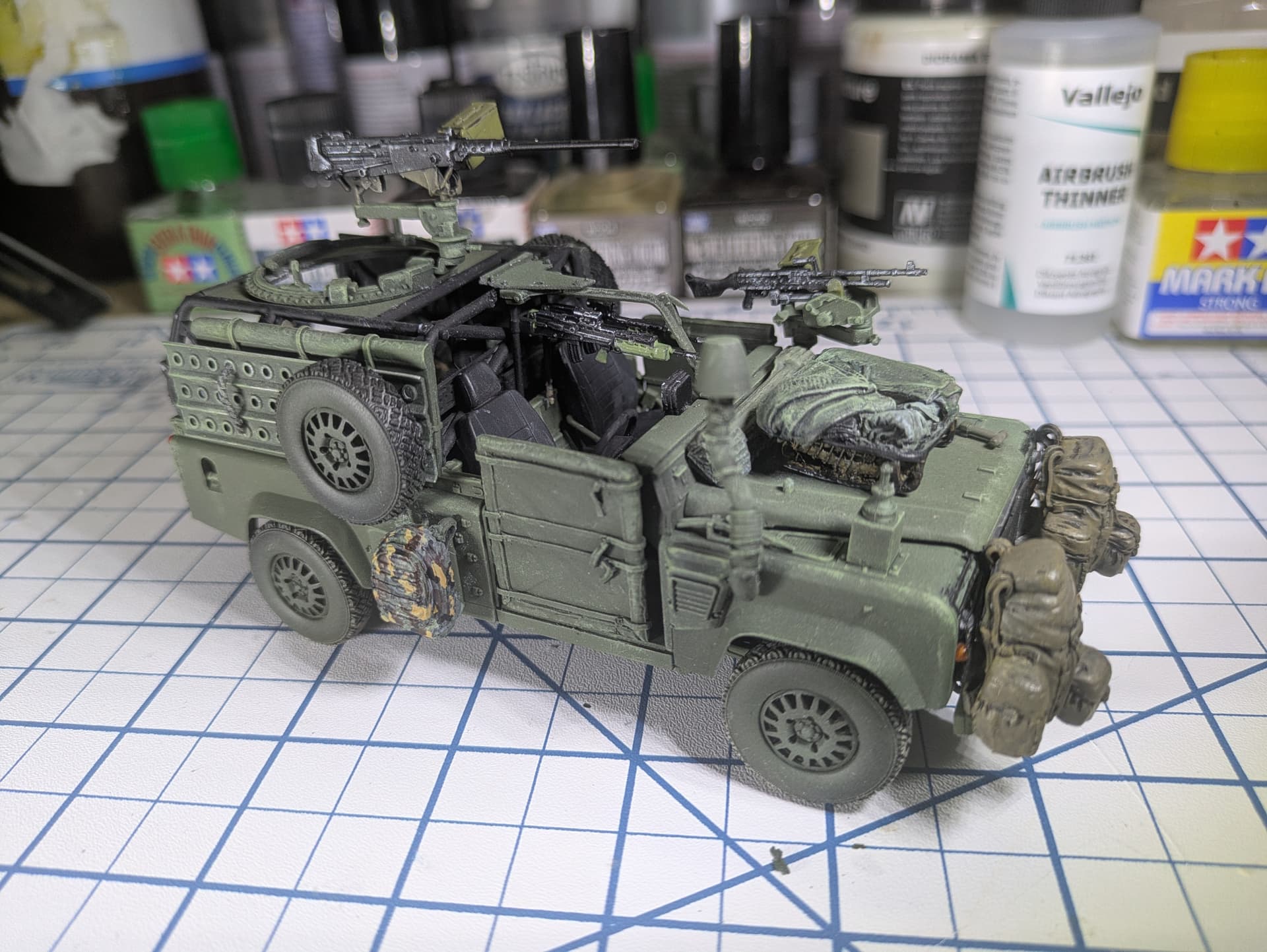 It looks very good, I really like the contrasting light lenses on the rear. One point to note, the bergens secured over the headlights is a very rare sight, typically an SF addition. They aren’t however secured using only the headlight light brush guards as they aren’t strong enough. Usually a length of rope is used to secure them. One end tied to the bonnet stowage basket whilst the other end has a carabiner tied to it which is secured to the bergens. The bergens waist belt is then used to secure the bottom to the bumper to stop it flailing around. You can just see what I mean on the picture below and also a picture showing the brush guard clips. If you are that way inclined it would be a very easy fix.
