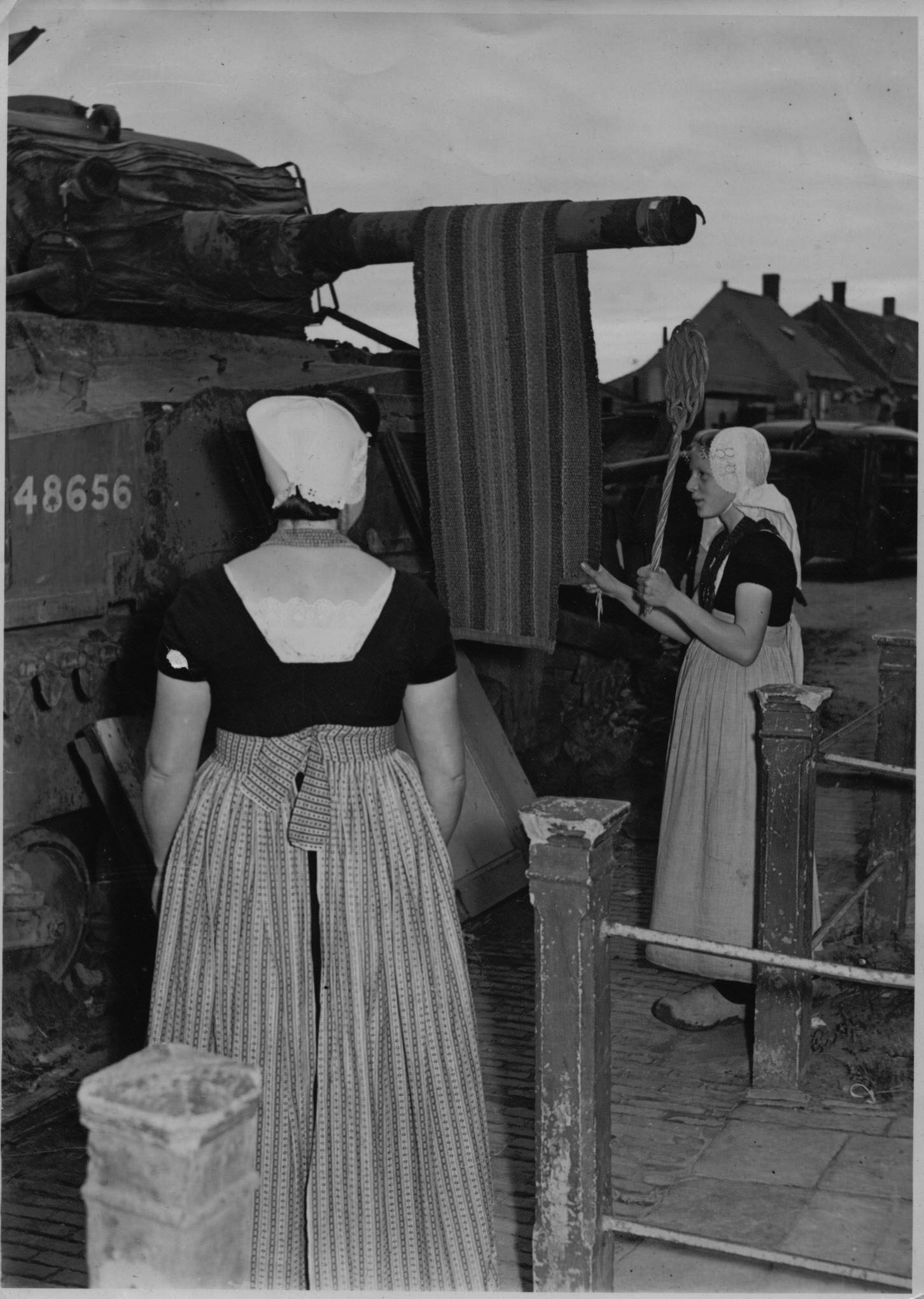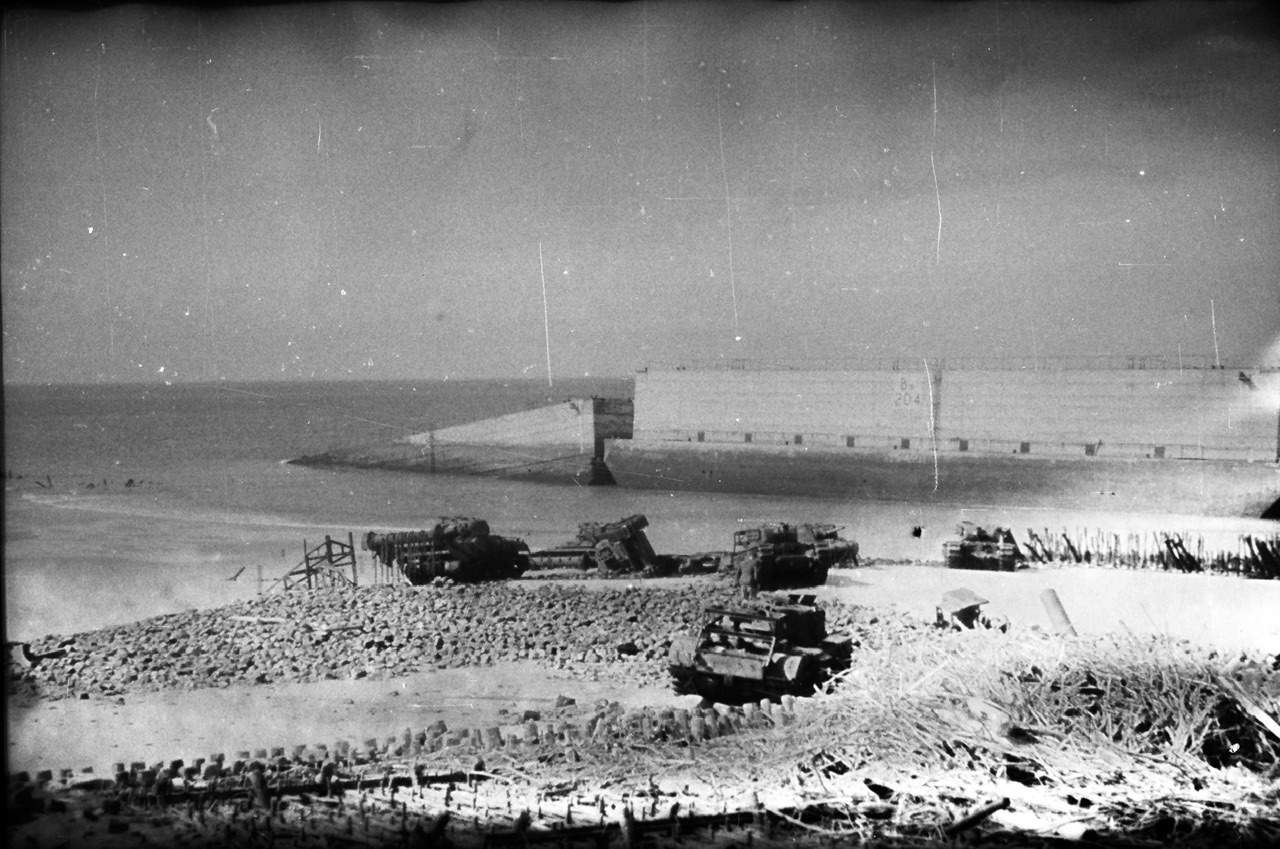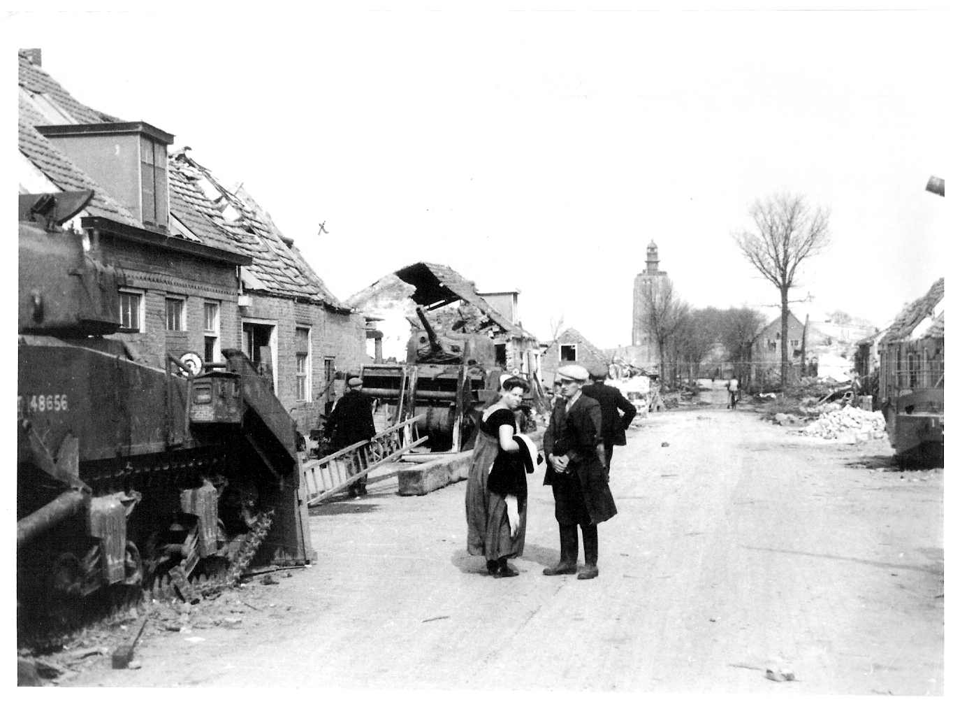 The intention was for these vehicles to be evacuated by sea, but the Royal Navy claimed it had no landing craft available until January 1945, and by the looks of it, in the end that was simply never followed up on. Thus, the tanks[1] were left in the street, as were several others[2] on the landing “beach” plus a number of armoured bulldozers and a literal boatload of Weasels and LVTs all over the place. All of these stood around for up to three years or so while the gap in the dyke was closed and the village rebuilt around them (and, for some LVTs and Weasels, the dyke went over them).