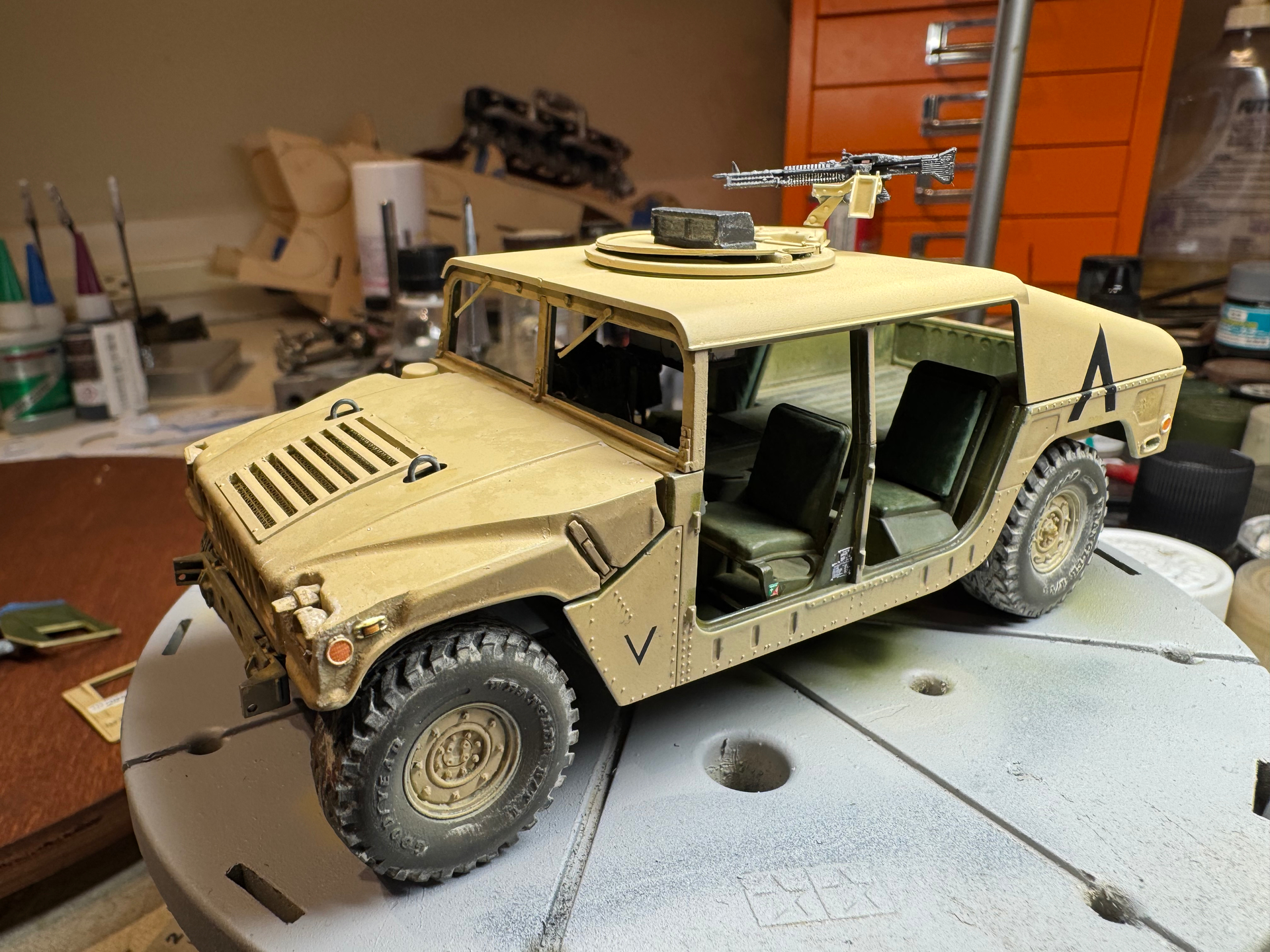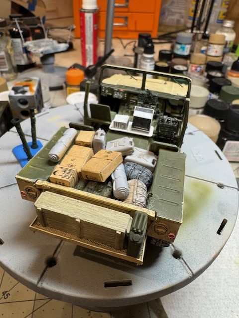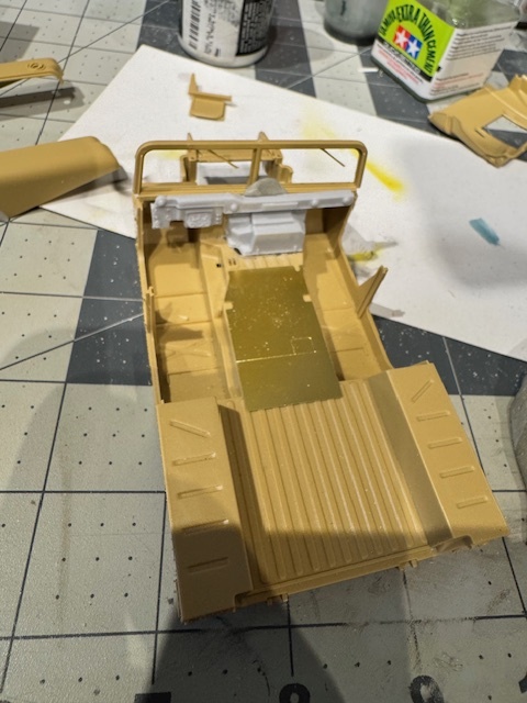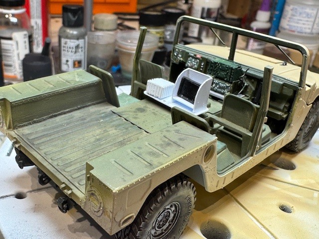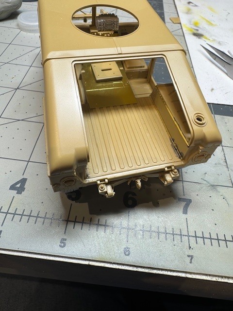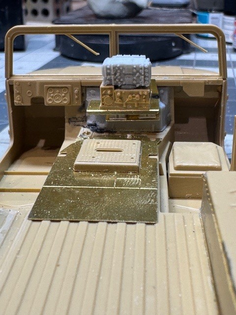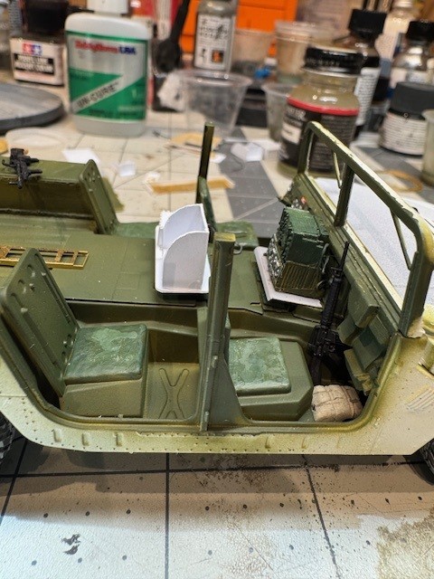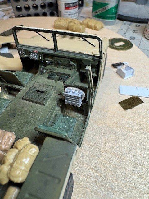 The vehicle also had additional radios installed. This included a unit hung on the back of the commander’s seat and required an additional antenna on the back. I ended up stacking the stock radio on top of a resin aftermarket radio and added handsets and some wiring. I had purchased an aftermarket resin replacement dashboard but my friend said it caused the radios to sit too high, in his recollection, so I ended up sanding most of it away to get the “look” right. Again, I am going with what my friend recalls about his ride so not sure it is entirely accurate. But he thinks it looks right and that is enough for me.