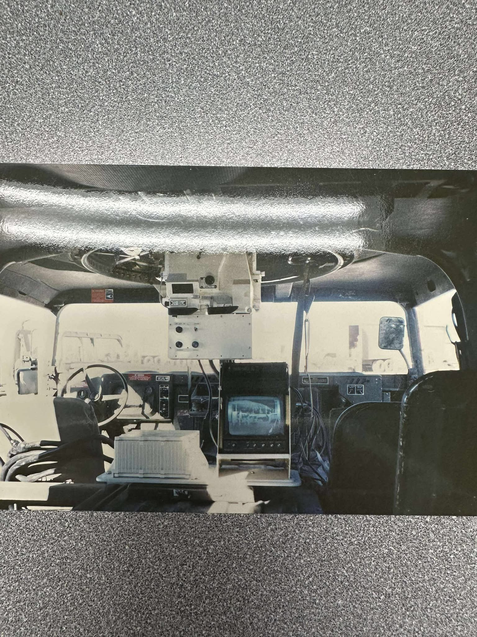 This is a photo of my friend in his vehicle. The sight is barely visible behind his head. You can also see the stack of radios unique to his vehicle with his gun resting against it.