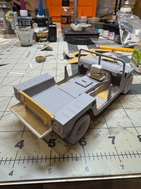 His ride also had a rack installed on the back. I fabricated this out of some photo etch grating that was intended to go across the front grill and some plastic strips.