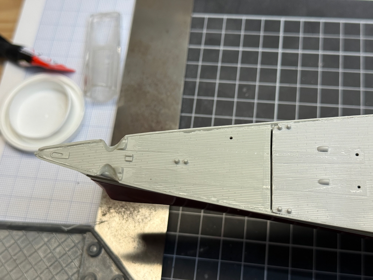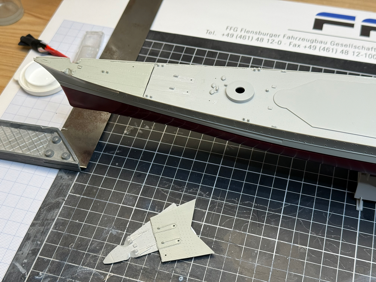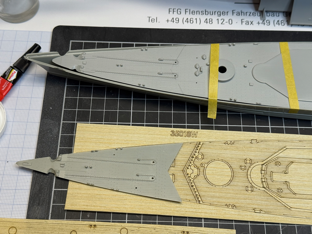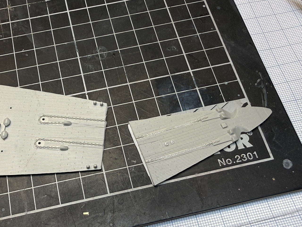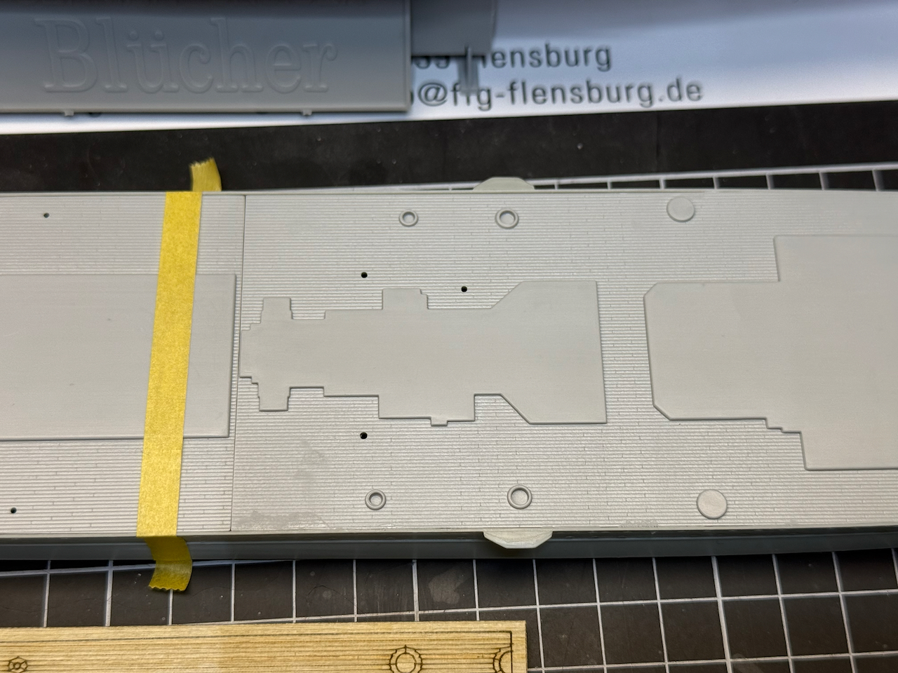 So the first challenge was to cut the forward part of the Blücher deck, cut back that front part from Prinz Eugen at a feasible position and fit the parts into the hull. But more about that in a minute.
