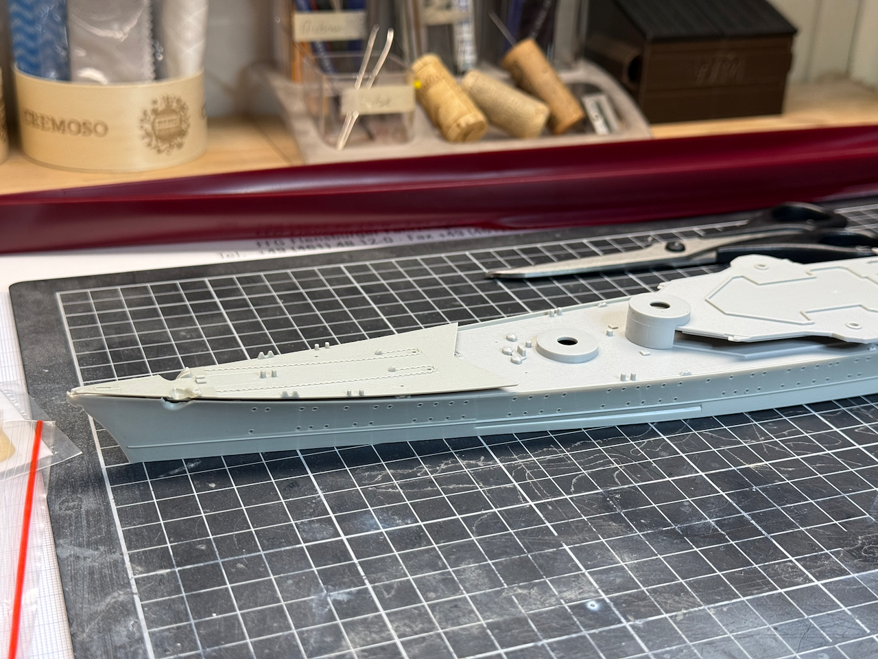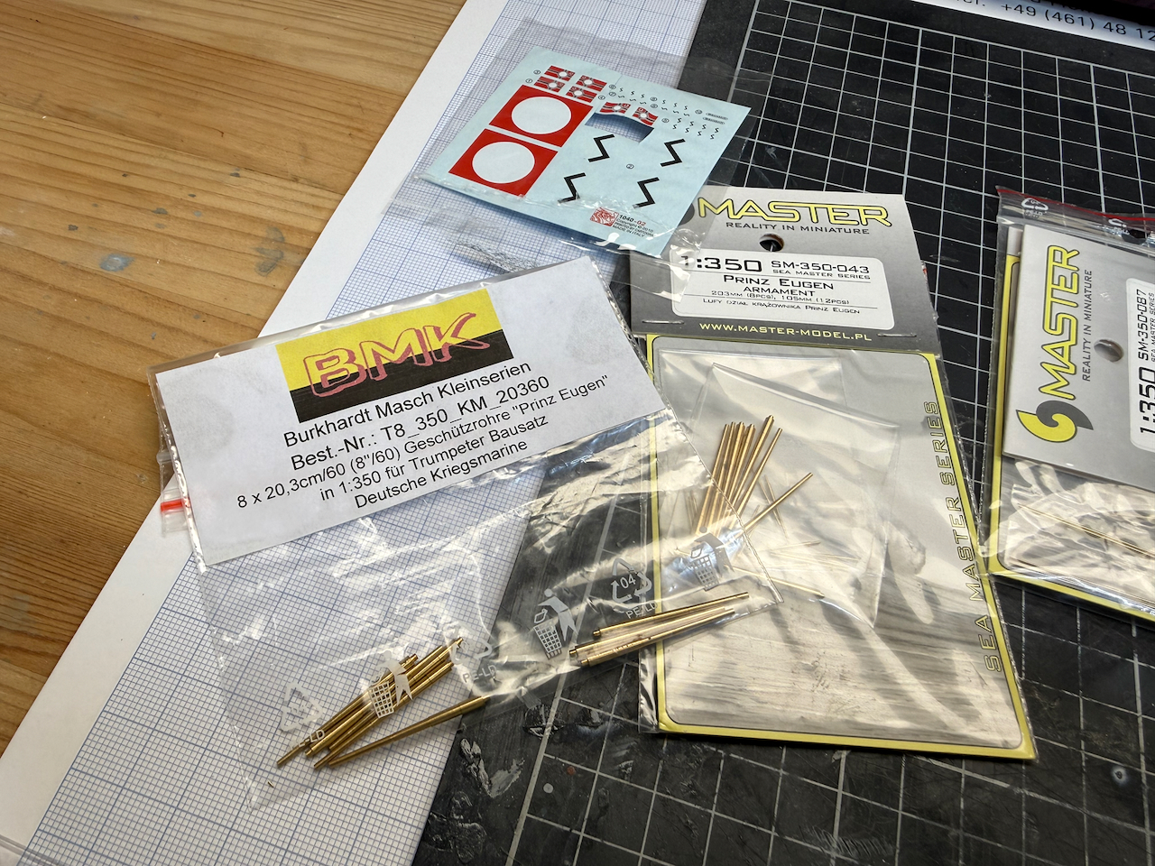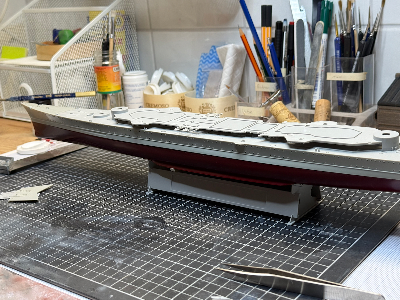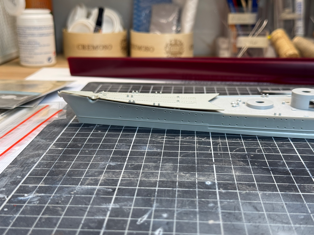 So the first challenge was to cut the forward part of the Blücher deck, cut back that front part from Prinz Eugen at a feasible position and fit the parts into the hull. But more about that in a minute.