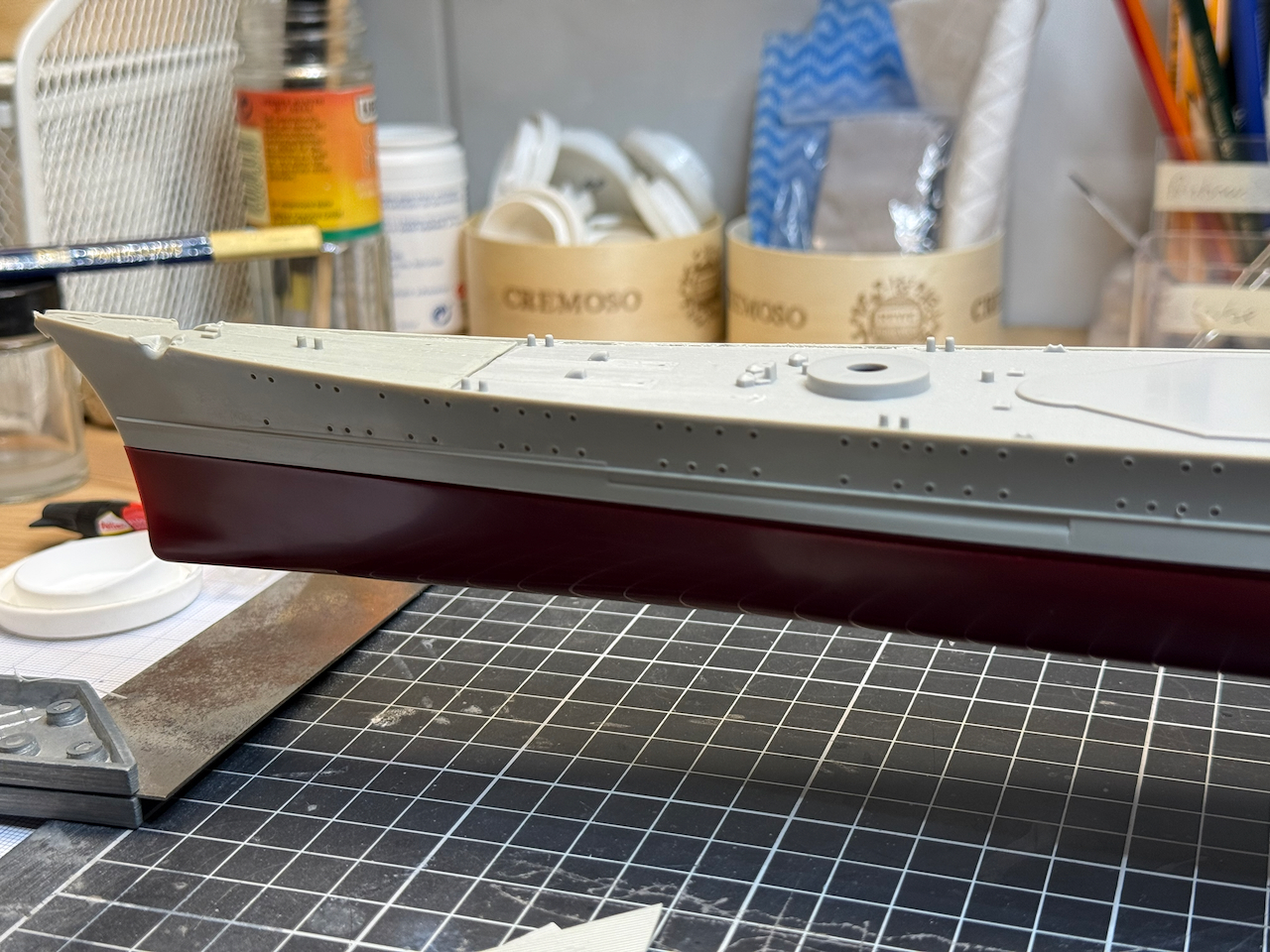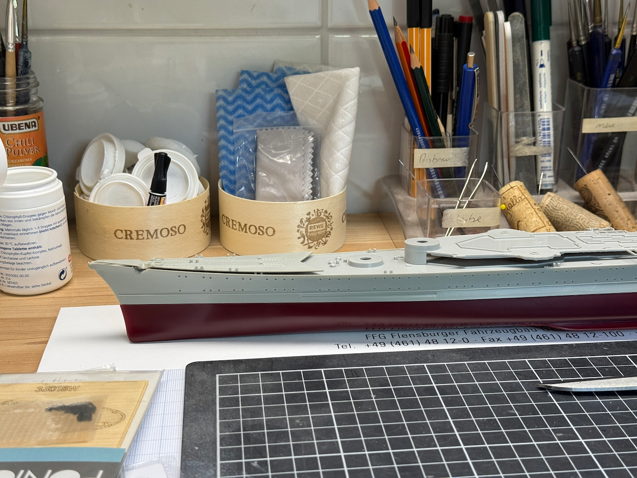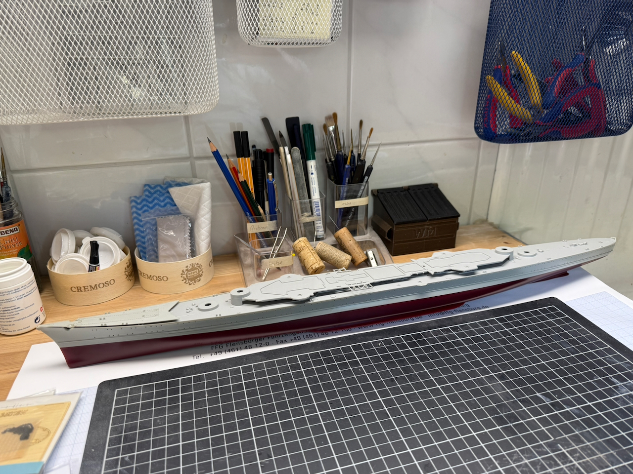 The ship will be in her last “outfit”, so the standard early war colors - medium grey hull/light grey superstructure, I will be using the same colors as for my Gneisenau. Same for the hull red. Turret tops will be yellow.