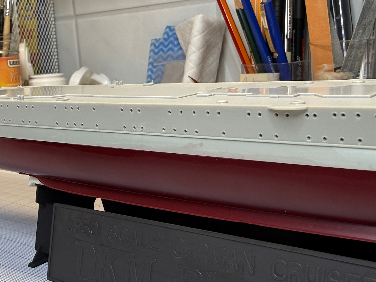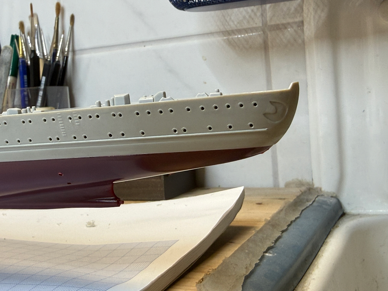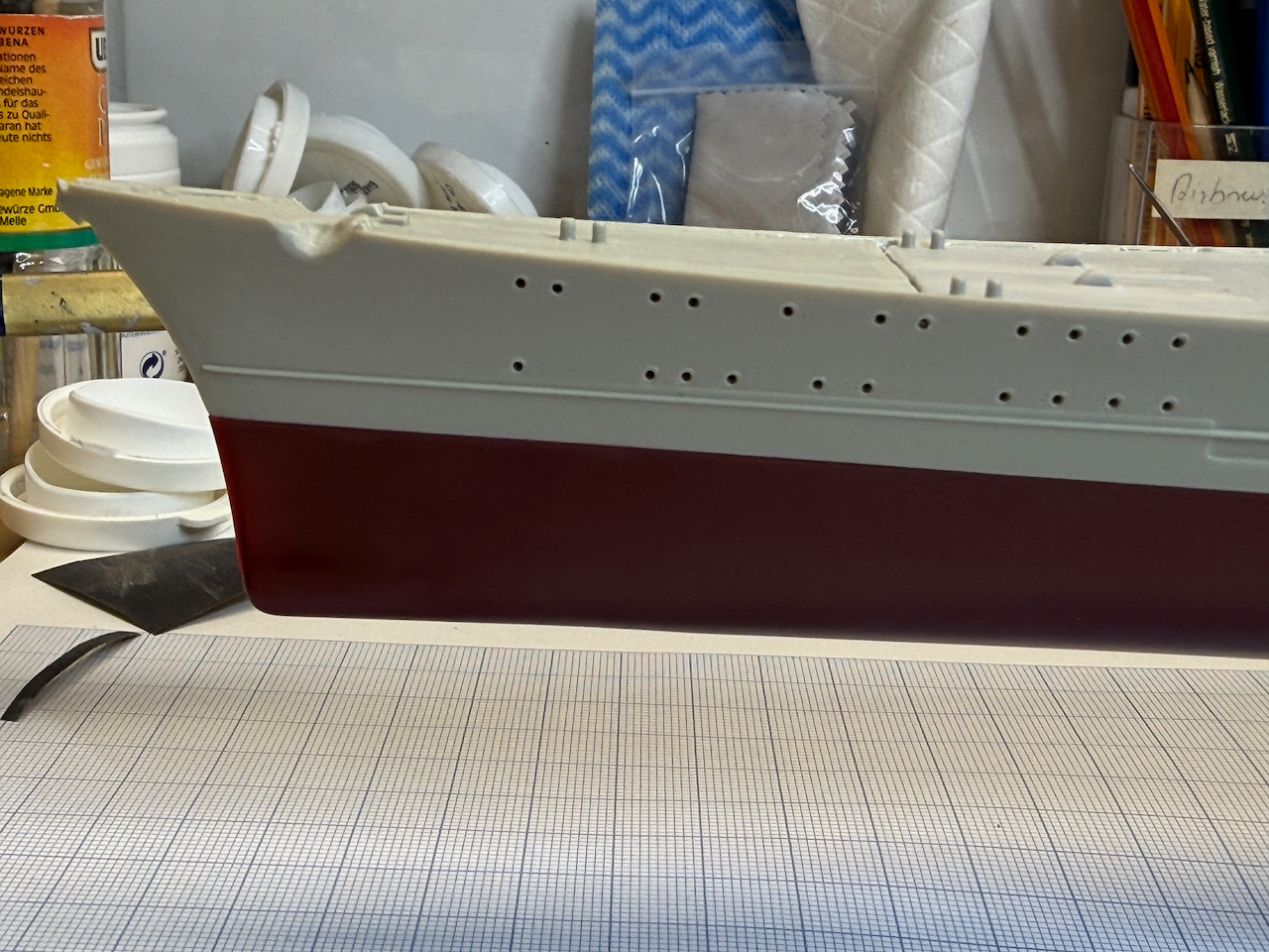 First color - nameplate in “dark iron”. All portholes drilled out, as is my habit. I know that they were neither empty nor open, but drilling them open lets them stand out clear and dark against the hull.