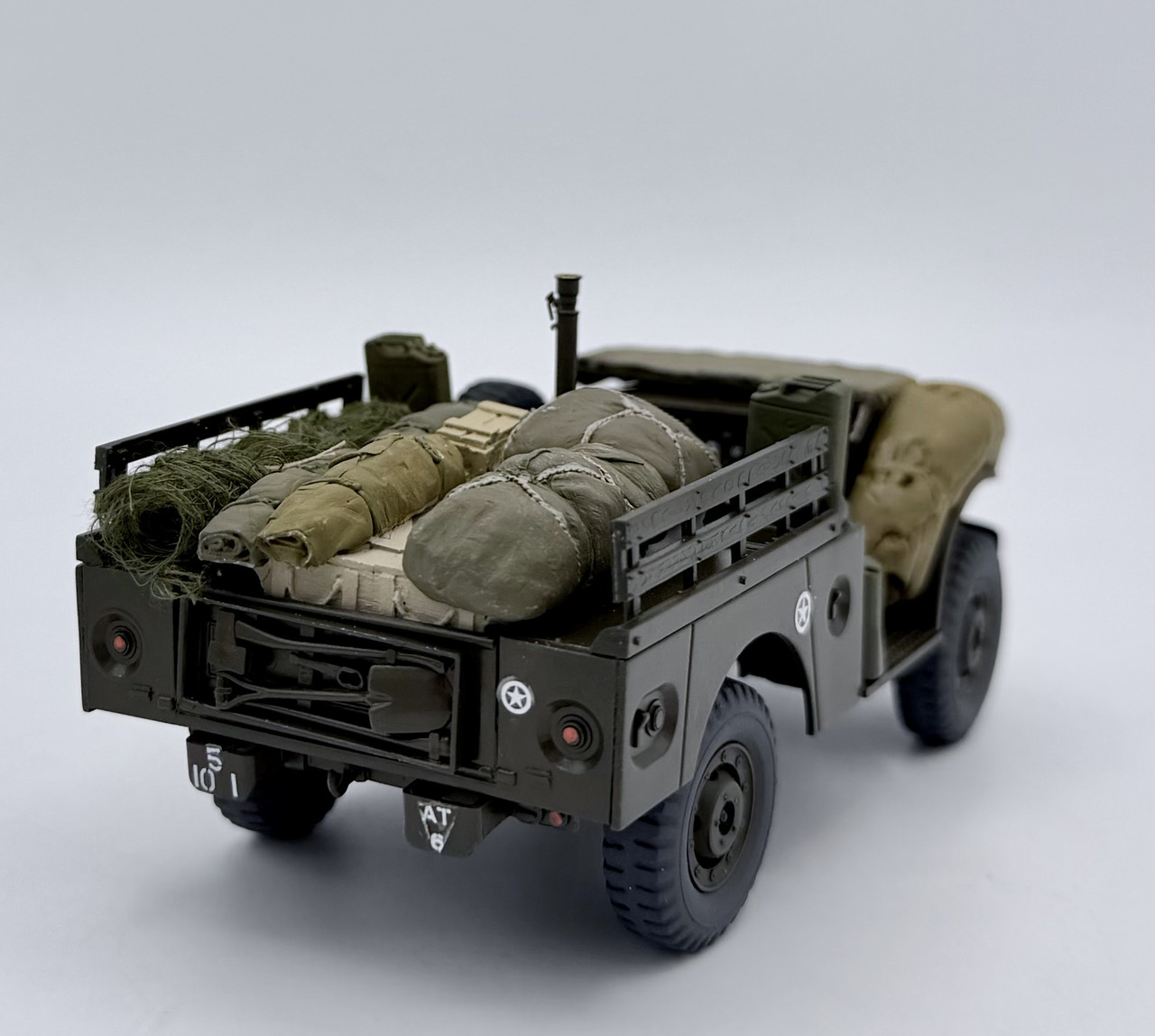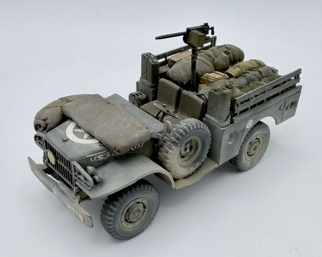 So I am calling this one done, aside from the crew figures. The kit itself was built OOB, although I did add a Combat Series brass machine gun pintle mount and took an Academy M1919 Browning .30 cal. from my spares bin for the gun itself. Most of the stowage is Value Gear, aside from the jerry cans, which are a mix of Tamiya, Academy, and 3D printed. Base paint is AK Real Colors. Most of the kit decals self destructed due to age, so replacements came from my spares…