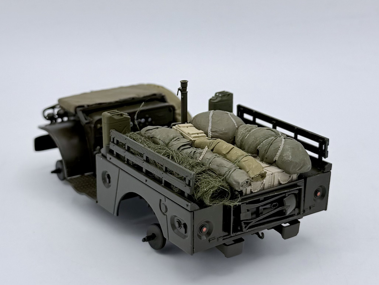 I went back to working on this one over this past weekend. I had picked up a pedestal machine gun mount for the cargo bed last week, and modified the stowage to allow everything to fit. I also painted up the main block of the Value Gear stowage and other stowage in their base colors.