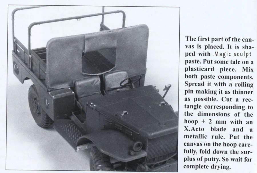 As I specified, the tarp is made using Magic Sculpt. I proceeded in stages, the front part, the back part, and the upper part. It takes time but the result suits me. The black and white photos are not great… The balance lead is added to the spare wheel. Still progressing, my Dodge stops in front of the entrance of a farm… There are still quite a few porches of this type in Normandy.