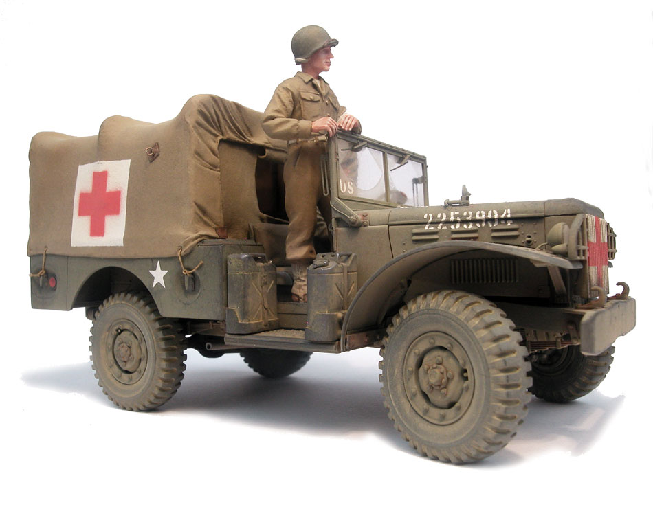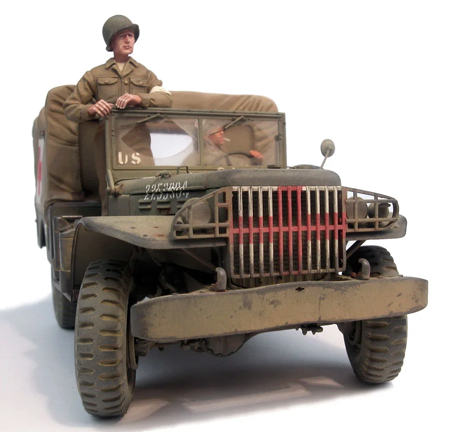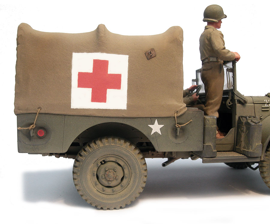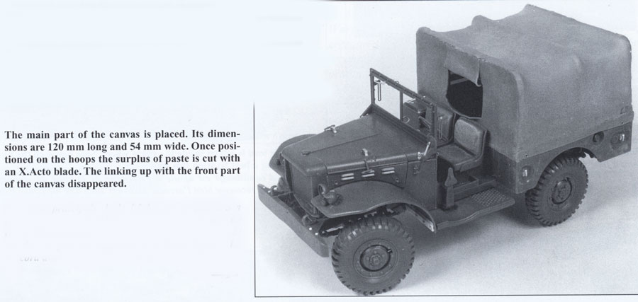 First spraying very diluted with White spirit Humbrol 86 Light olive. Second spraying ( more XF-4 ThanXF-21 Tamiya Enamels) very diluted whit surgical spirit or methylated spirit.Four third spraying Xf-15 Tamiya.Five Applying of the markings.Registration number : Pre-size plate number 1105.Body side US cross from Verlinden ref.159.The tyres :Humbrol 29 Dark Earth + Humbrol 33 Matt Black. Then very diluted lavis.After drying apply some matt black pigment with your finger on the tread and on the oustide of the tyre.