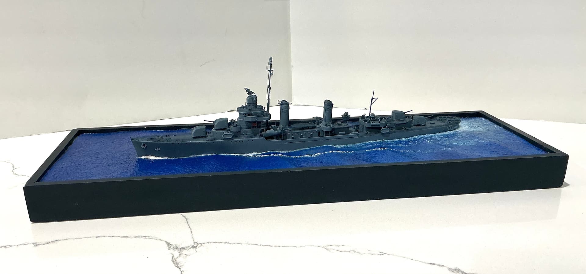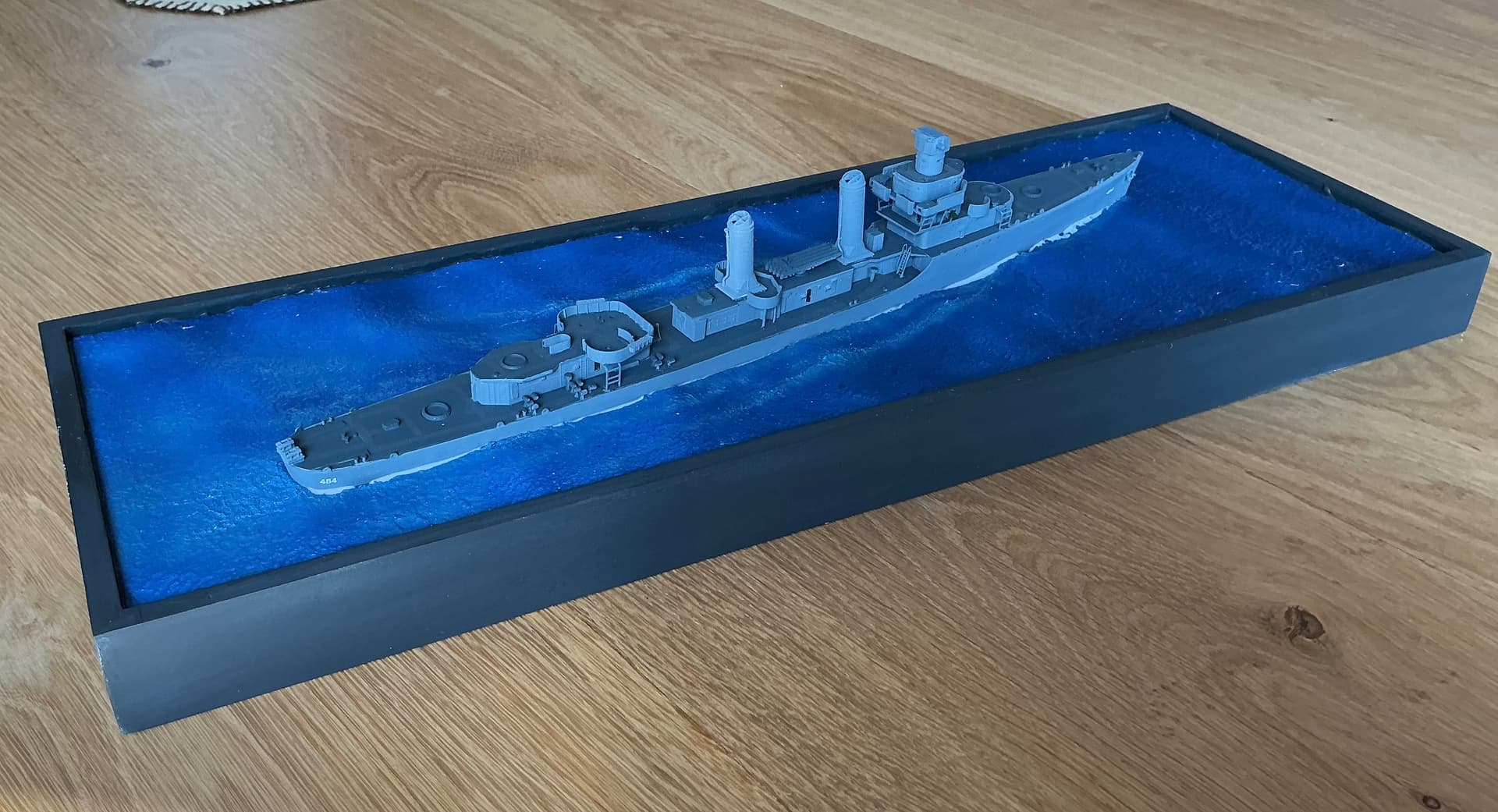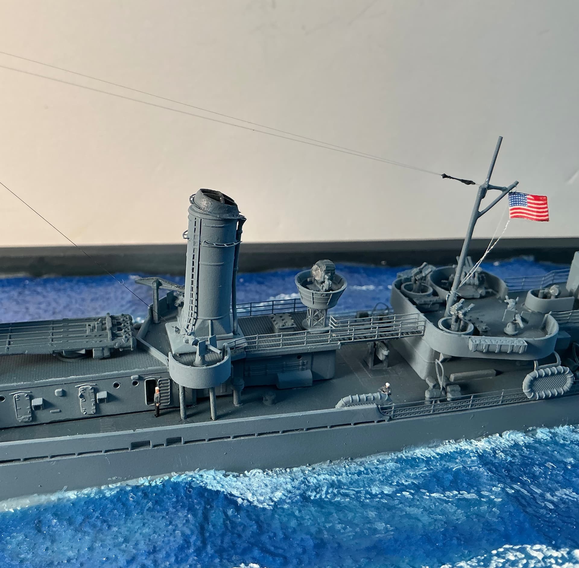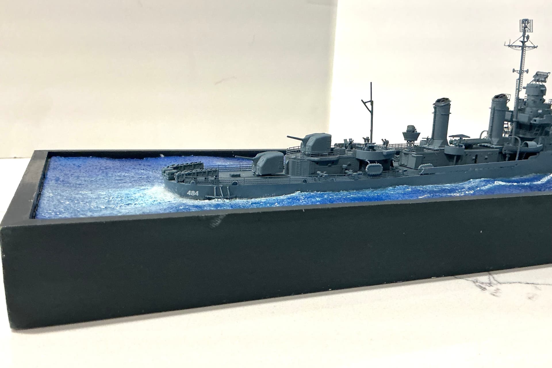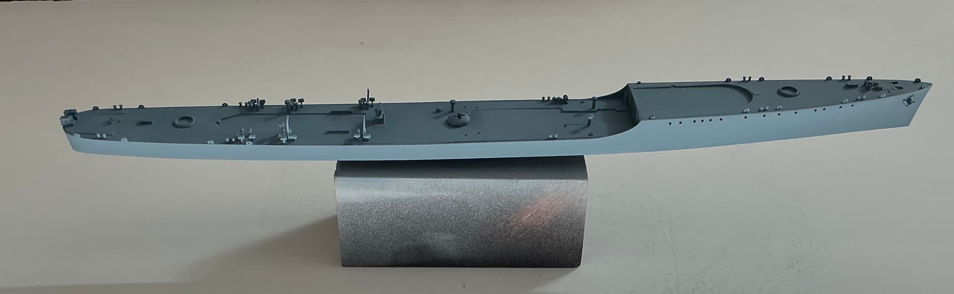 Deck furniture, K guns , smoke generators and ground tackle installed on hull . Photo etch watertight doors from Gold Medal set installed on lower deck houses . All primed with Tamiya Fine Grey surface primer from rattle can. Hull mounted on wooden plinth for working and shot with custom mix 5N Navy Blue for Measure 21 camouflage. Mix for Tamiya’s acrylic paint found on the internet.