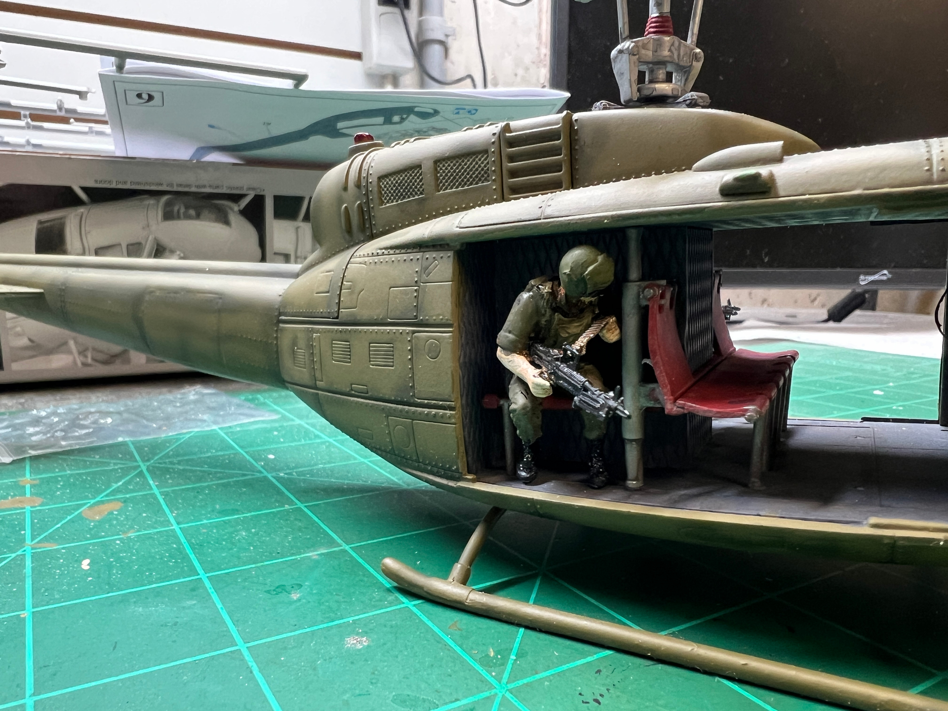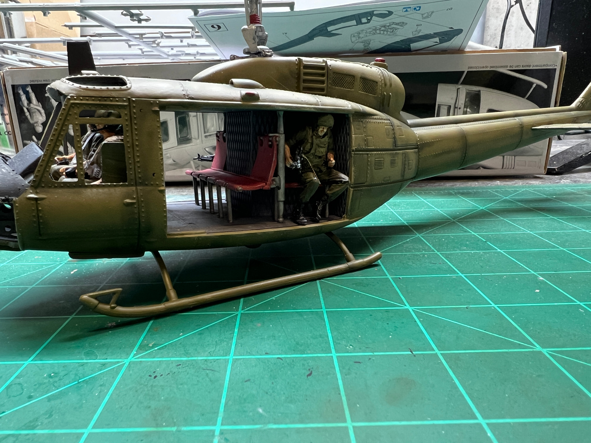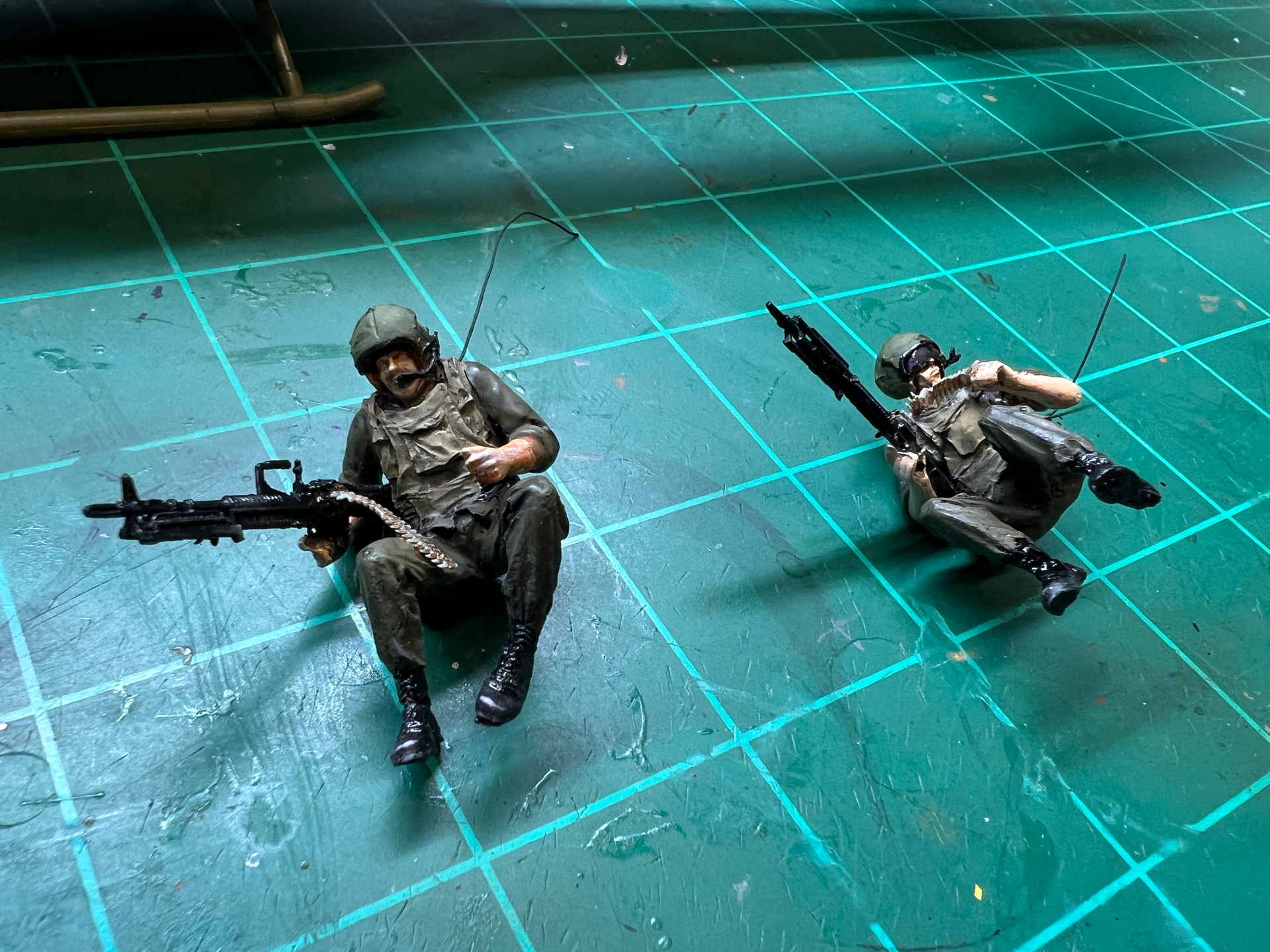 Got the gunners all painted and ready for their perch in the back of the Huey. I made boom mics for the helmets and add the comms wire which I’ll attach to the bulkhead when they are mounted.