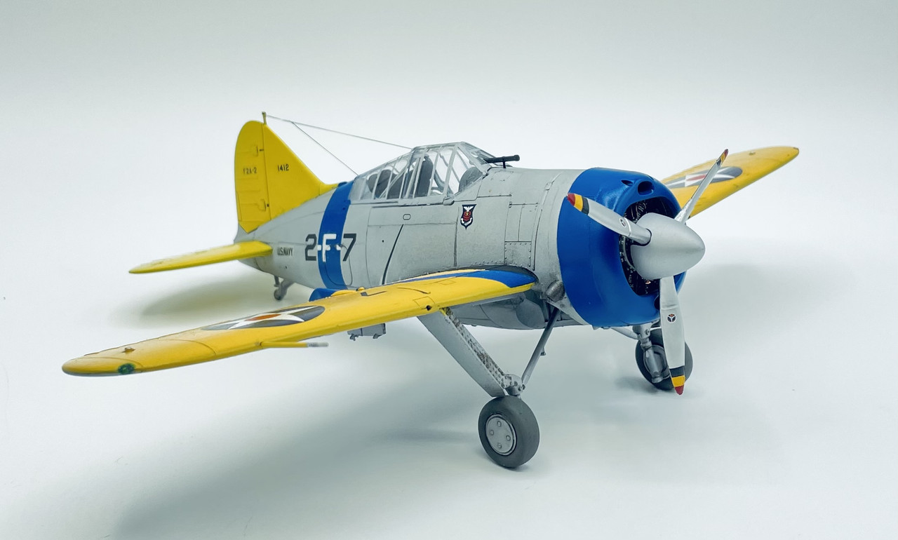 Well, here it is, my first “Yellow Wings” build in well over 40 years. This is the classic Tamiya 1975 vintage kit, in a later rebox, finished in the markings of VF-2 “Flying Chiefs” circa 1940. This was the first monoplane fighter plane taken into service by the USN. Paints are Tamiya for the aluminum lacquer & Lemon Yellow, Model Master Acrylics for the Chrome Yellow wing upper surface, and Testors enamel square bottle for the True Blue 3rd Section markings. Decals are a mix of kit decals, Microscale & SuperScale, and Yellow Wings Decals. Aside from adding a 3-D decal harness in the cockpit, everything else is OOB for assembly.