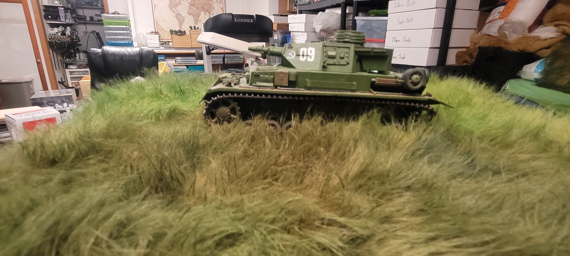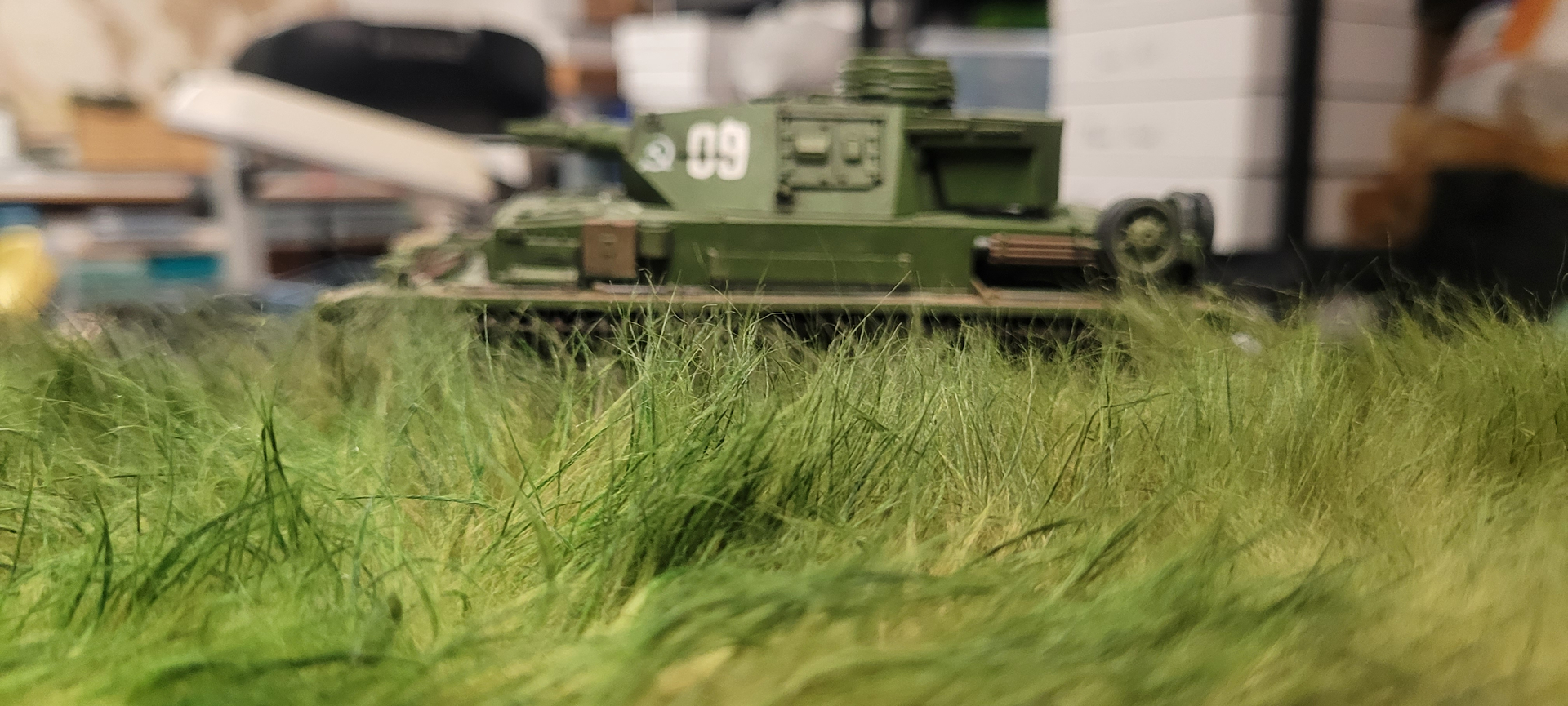 as far as I know there were no helicopters present, lol, ty for the constructive feedback, so the way I see it there would be no trampled grass around the vehicle, as they pulled up directly into a new field , I did add trampled grass behind the tank , but I could have made the base longer and put the tank at the front showing much more tracked trampled grass in the rear.