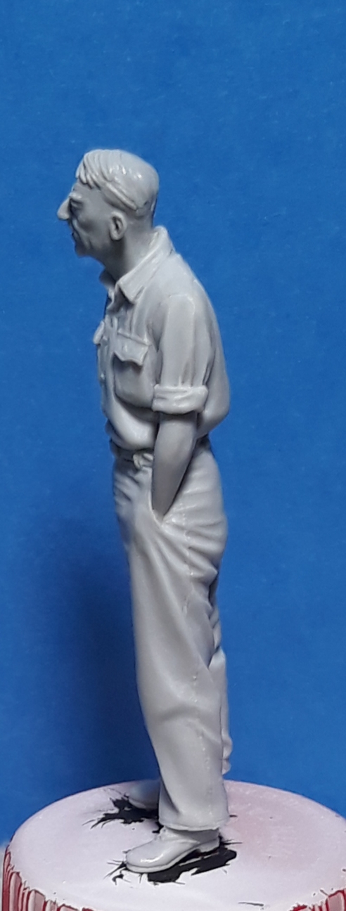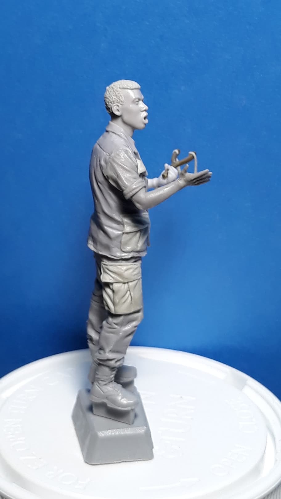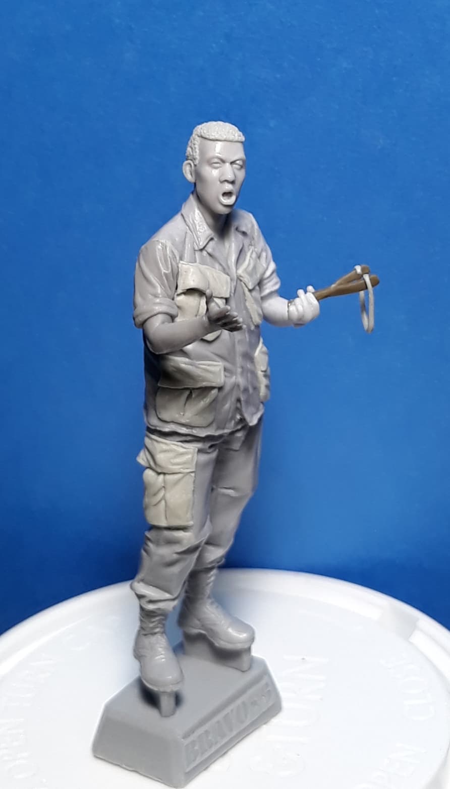 Here is a figure conversion that will go with the group of figures involved in target practice with slingshots. The figure just missed a can being used as a target and is expressing his astonishment of missing something at such a close distance. The base figure is from Bravo 6’s “Rubber Lady” kit. I drilled out the neck and scraped off the original pockets and sculpted new ones so they would be the same size and will be compatible with the uniforms of the other figures. I selected a head from Hornet and sculpted hair on it. The right arm and hand are from Royal Models and the left arm is from Bravo 6. The slingshot is made from a shovel handle with the sling made from Magic Sculpt.
