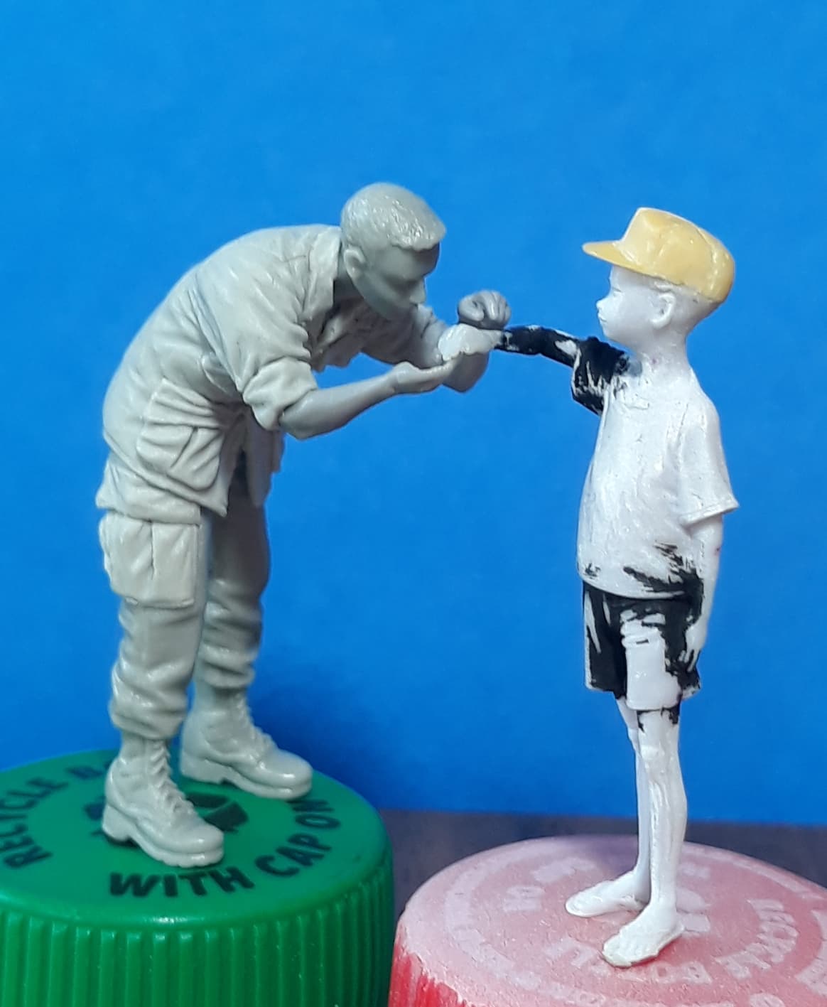 Here is another conversion that I just completed for the MEDCAP diorama - a medic holding a boy’s arm while he cleans a wound with a gauze sponge (I still need to make that part). I had moved the right arm on the boy several days ago and as I was posing the medic, I thought the boy should be looking at either his arm or the medic, so I cut the head of and glued it into it’s new position. The medic is a conversion of a Hobby Fan Artilleryman. The right arm is from Royal Models and the left arm is from Bravo 6. First I resculpted the cargo pockets on the trousers. Then I sculpted a jungle fatigue shirt onto the figure along with the right sleeve. Once that had cured, I added the pockets to the shirt. The photos show how the figure of the medic will interact with the figure of the boy.